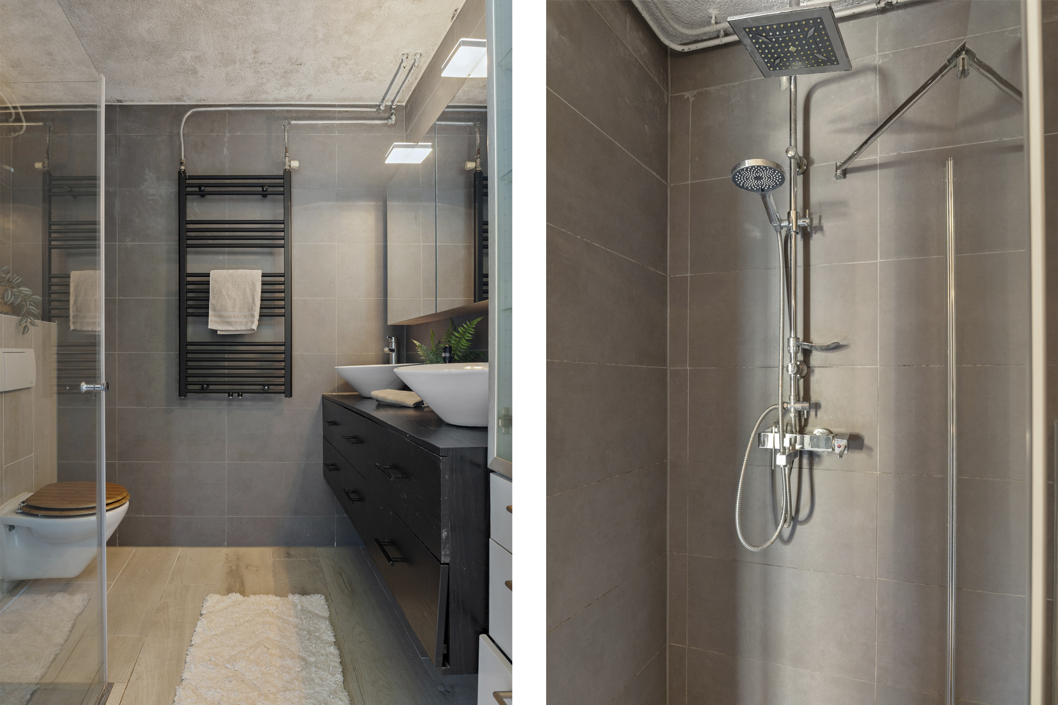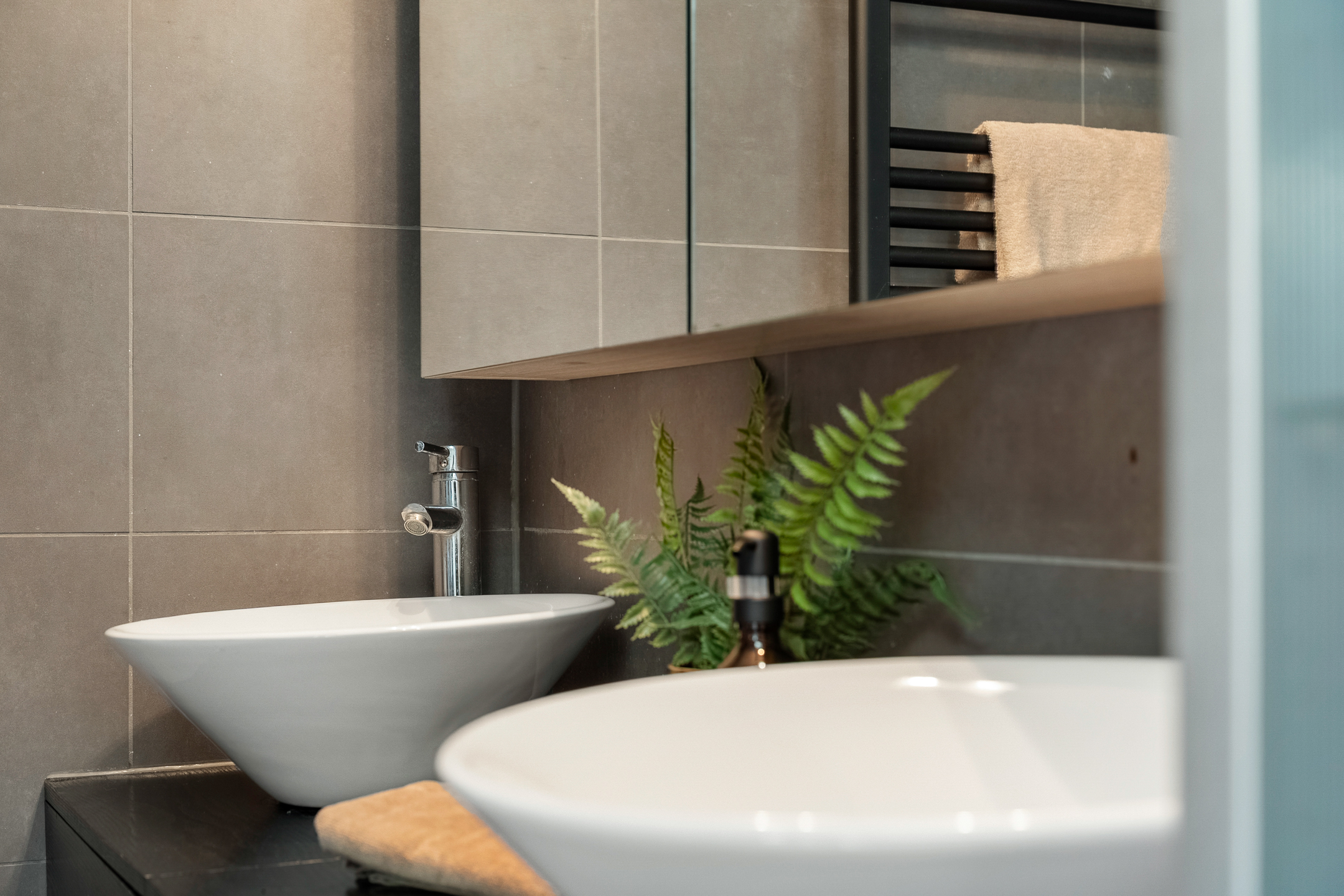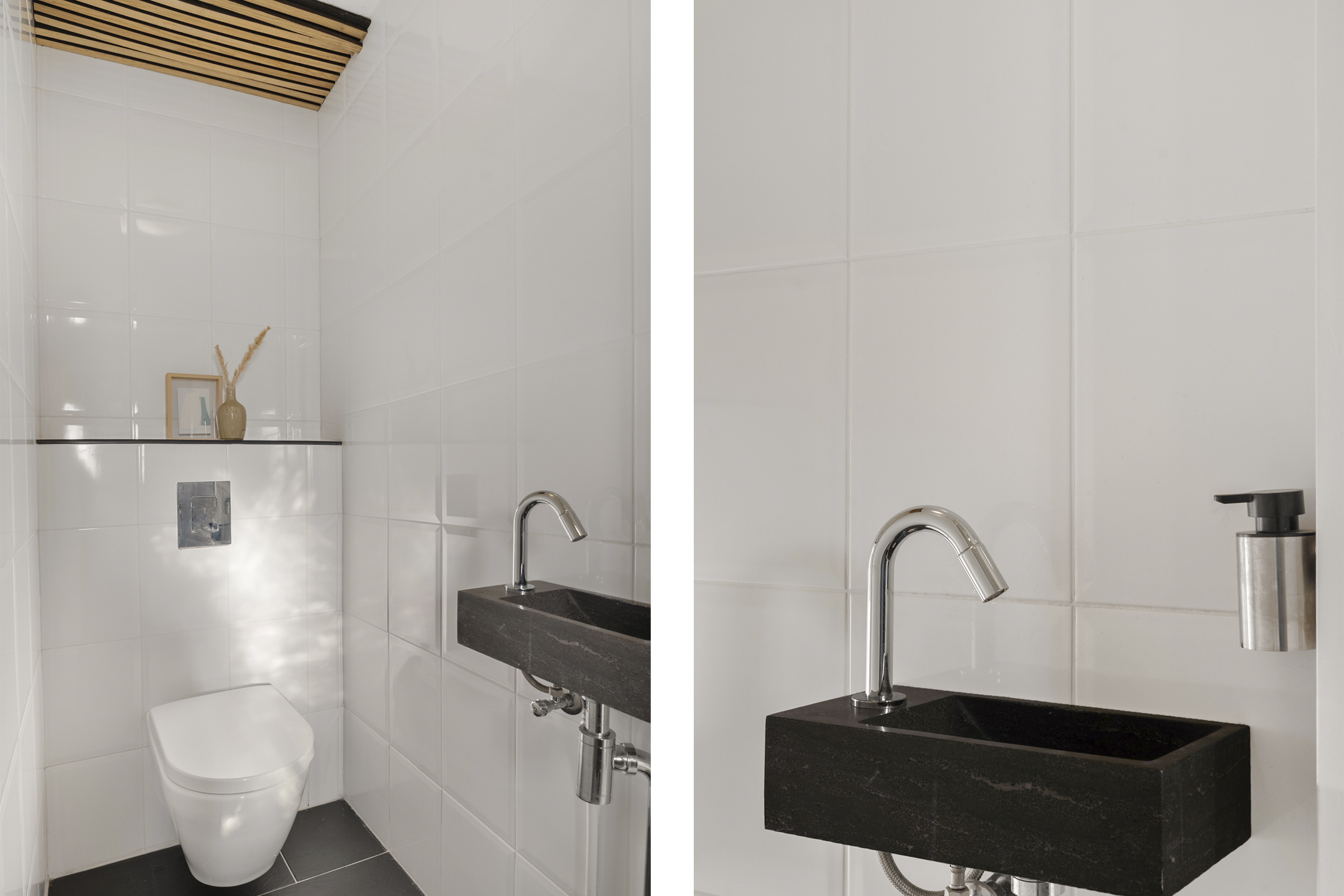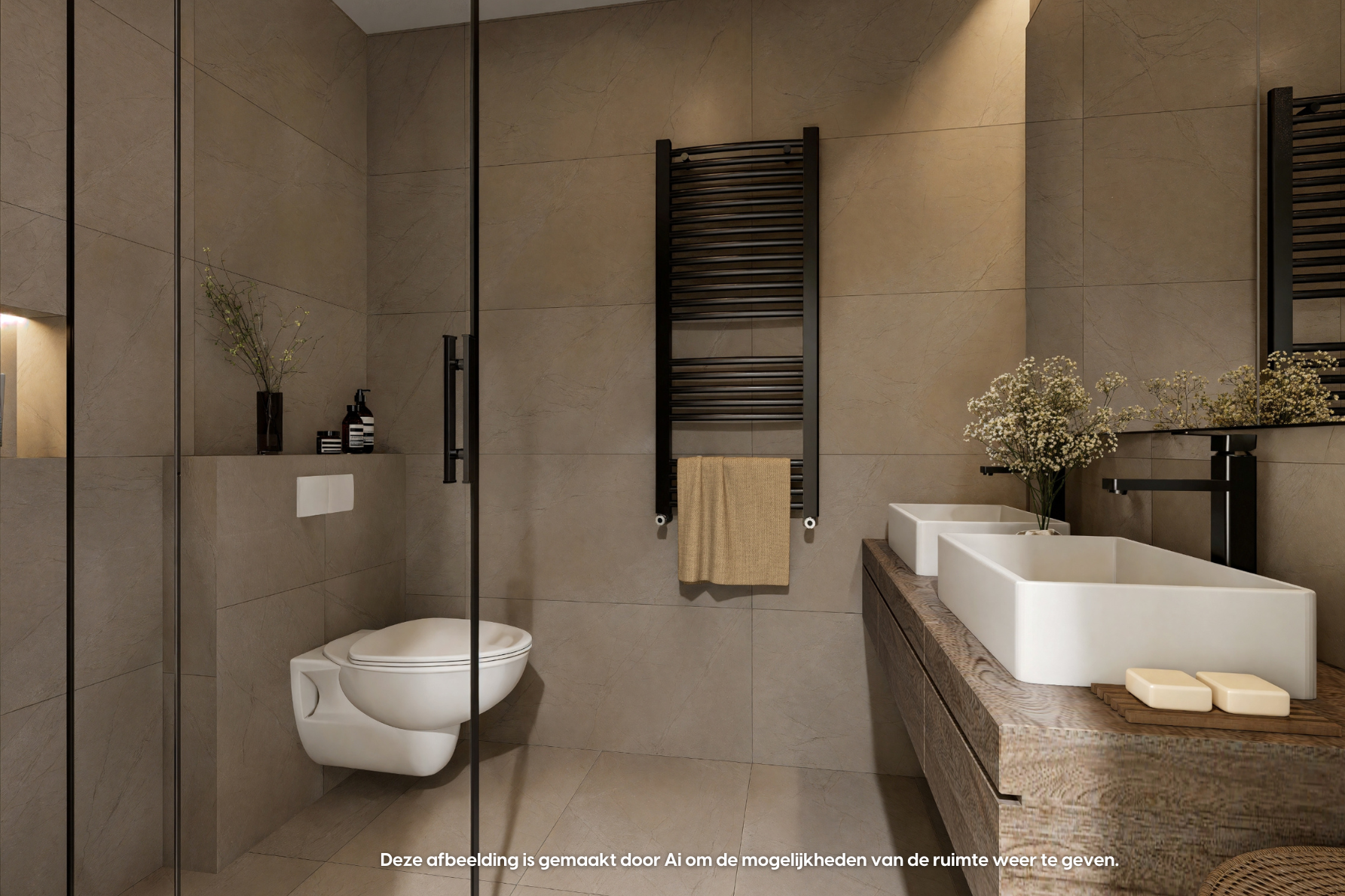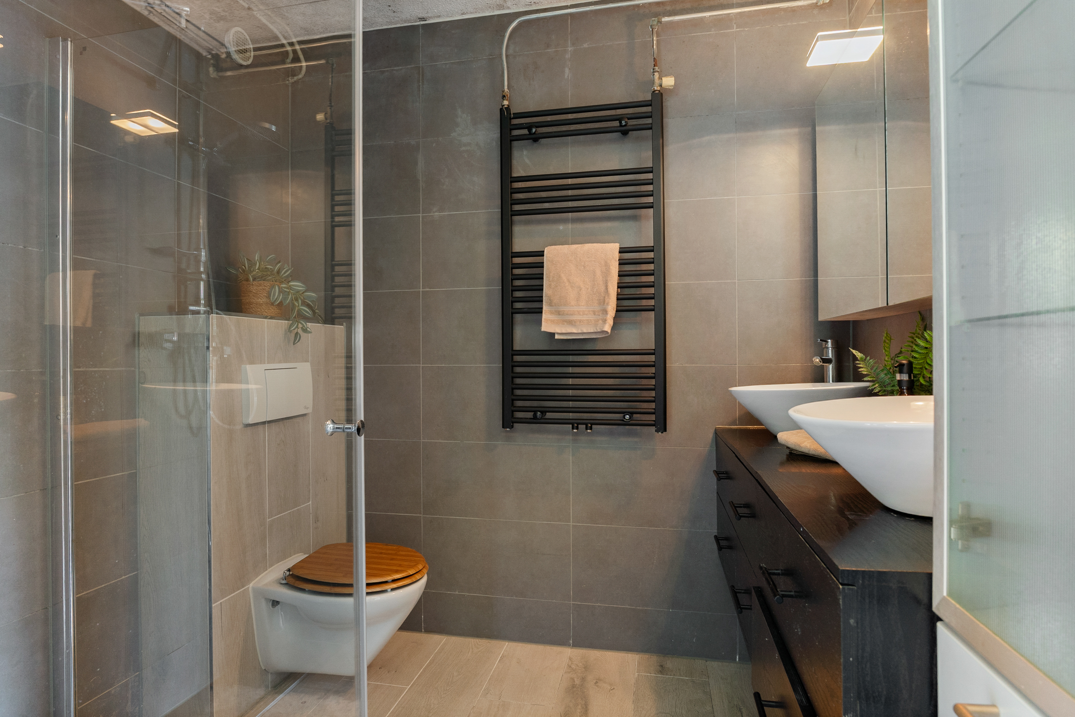 Op deze verdieping vind je twee royale slaapkamers. De grootste slaapkamer aan de achterzijde strekt zich uit over de volle breedte van het huis en biedt ruimte voor een groot bed, kledingkasten en eventueel een werkplek. De tweede slaapkamer aan de voorzijde is eveneens goed bemeten. De badkamer is strak afgewerkt en van alle gemakken voorzien. Er is een ruime inloopdouche met glazen wand, een modern dubbel wastafelmeubel, een tweede toilet en een designradiator. De donkere tegels en zwarte accenten geven de ruimte een luxe uitstraling.