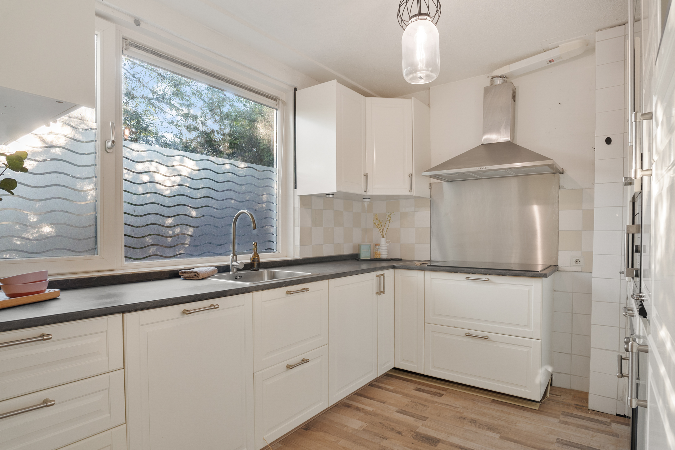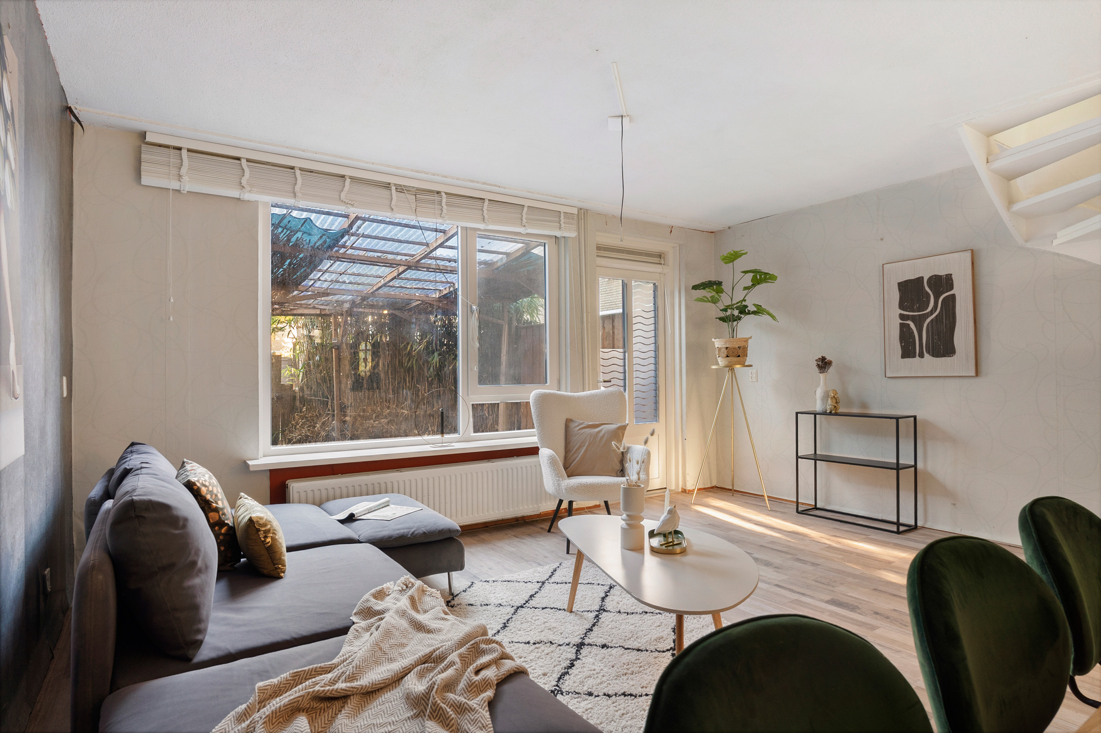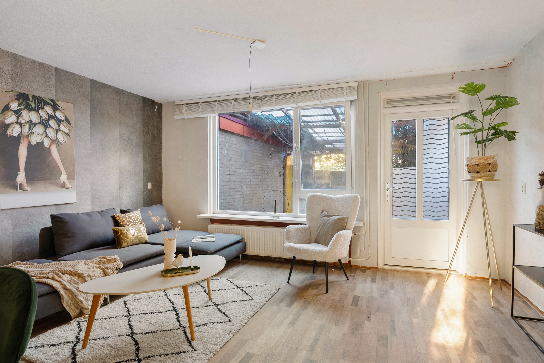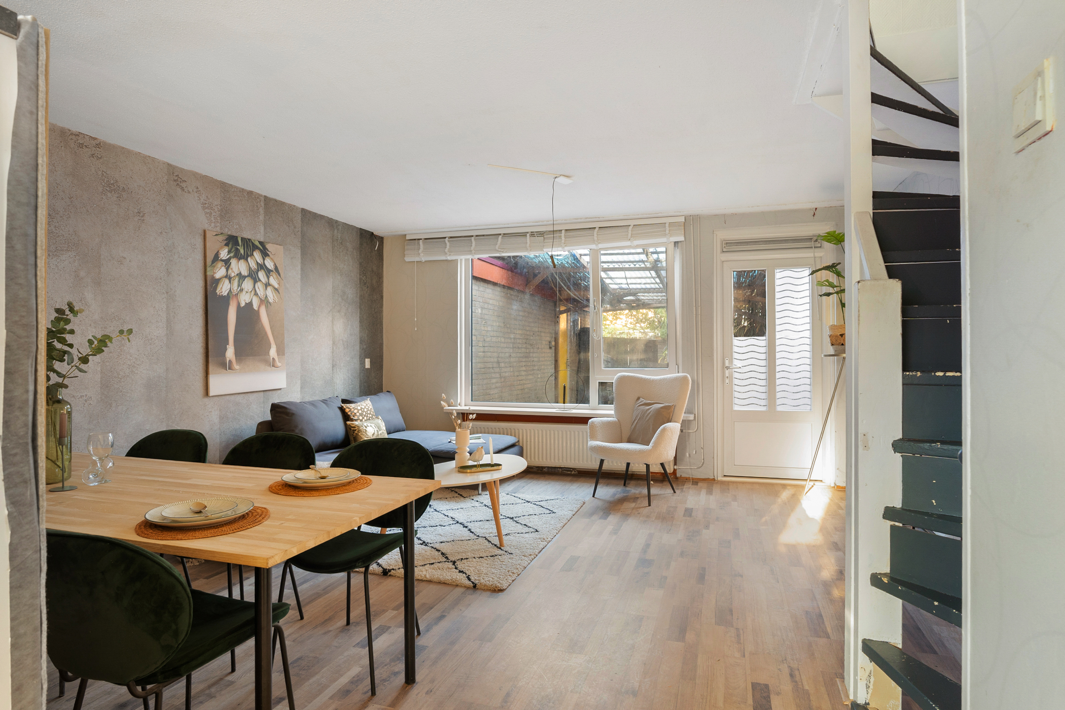 Je betreedt de woning via de entreehal met meterkast en een keurig toilet met fonteintje. Vanuit hier stap je de lichte woonkamer in, die zich over de volledige diepte van het huis uitstrekt. Dankzij het grote raam aan de achterzijde en de deur naar de tuin geniet je hier van veel natuurlijk licht.