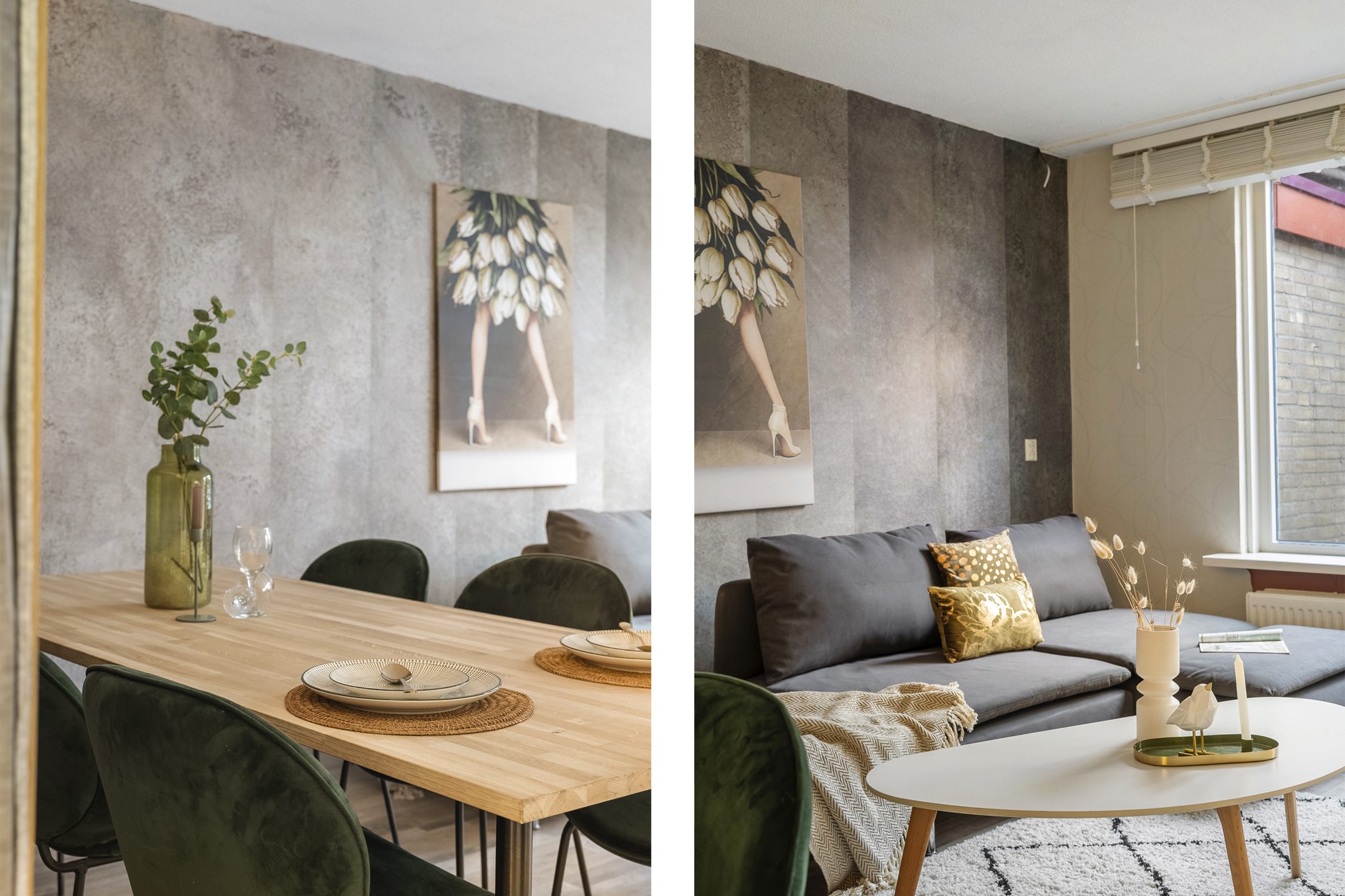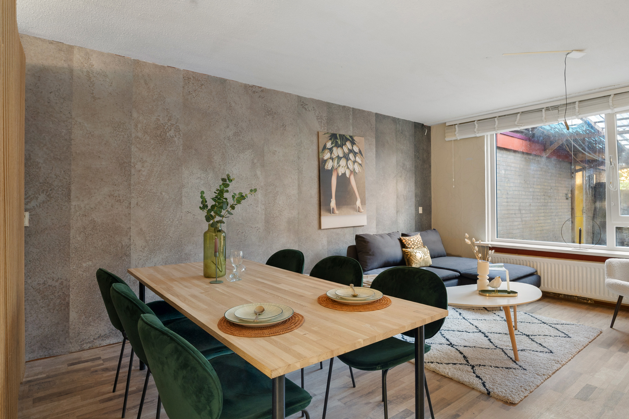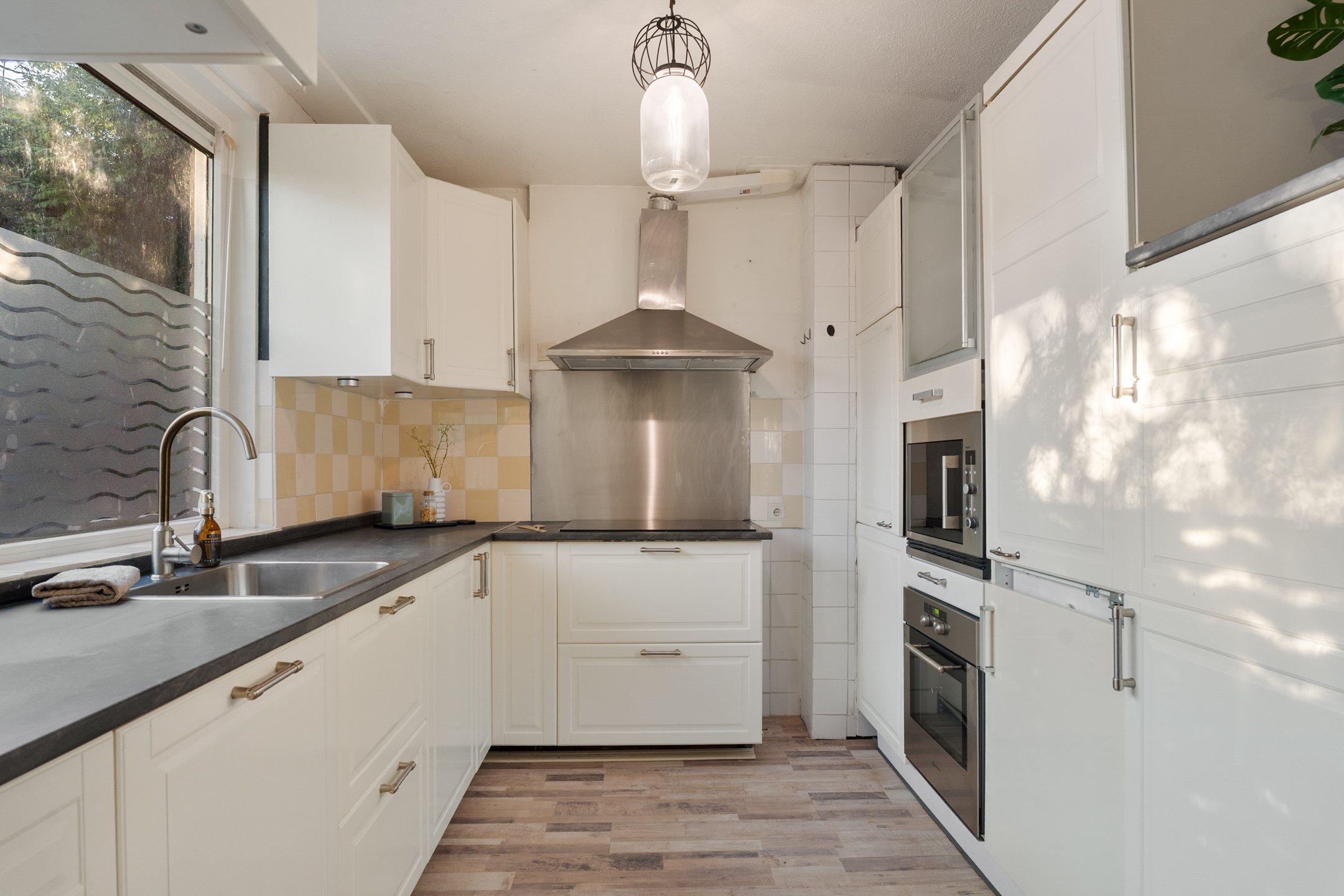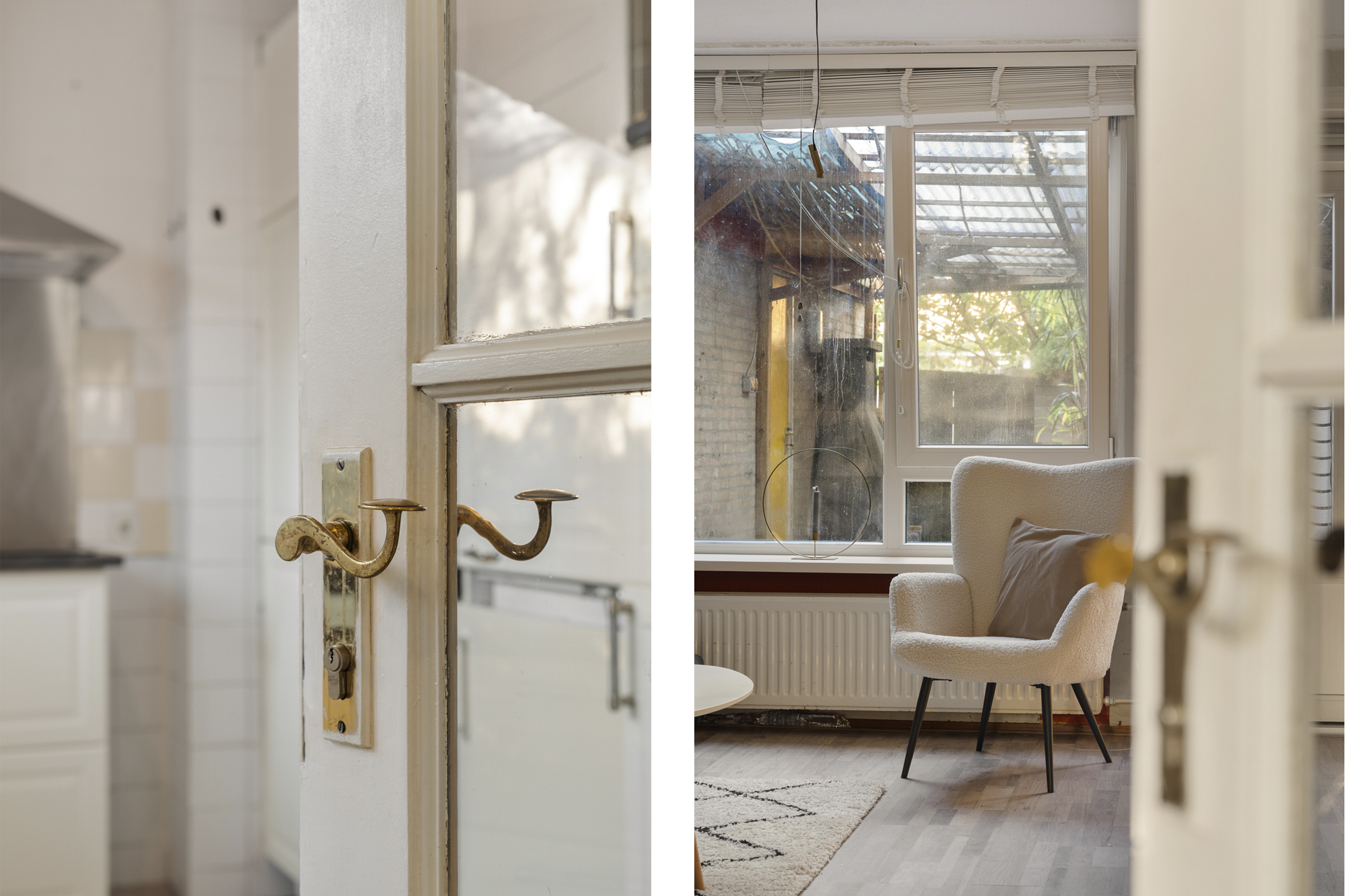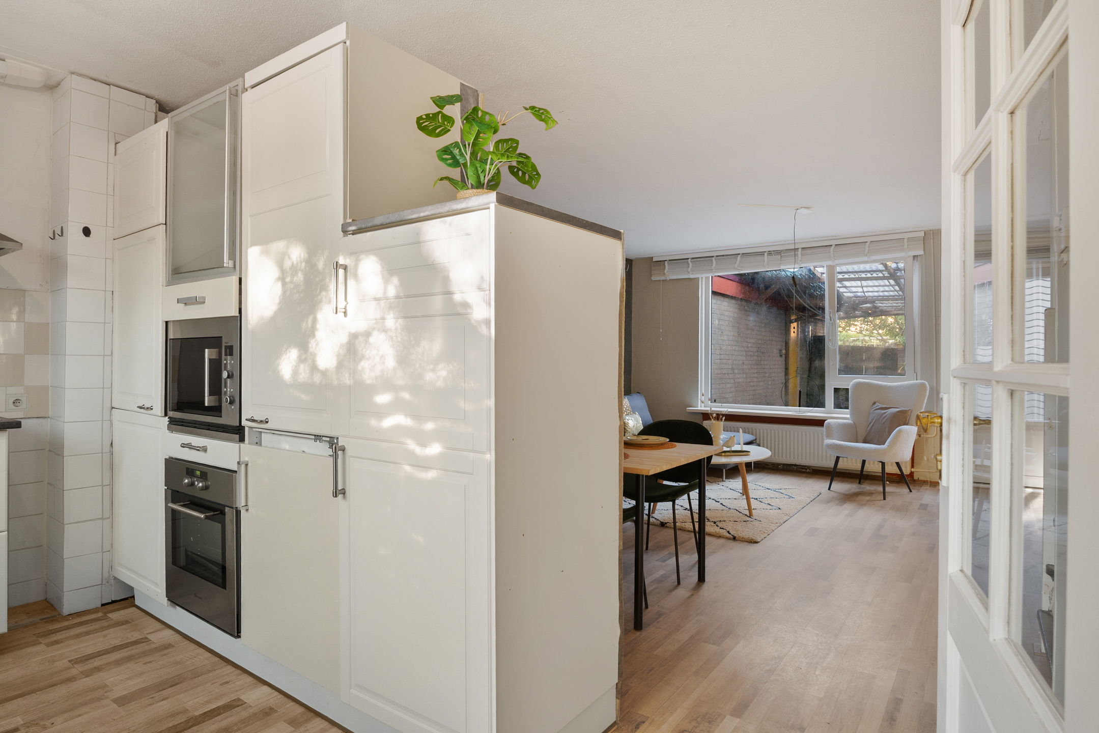 Je betreedt de woning via de entreehal met meterkast en een keurig toilet met fonteintje. Vanuit hier stap je de lichte woonkamer in, die zich over de volledige diepte van het huis uitstrekt. Dankzij het grote raam aan de achterzijde en de deur naar de tuin geniet je hier van veel natuurlijk licht.