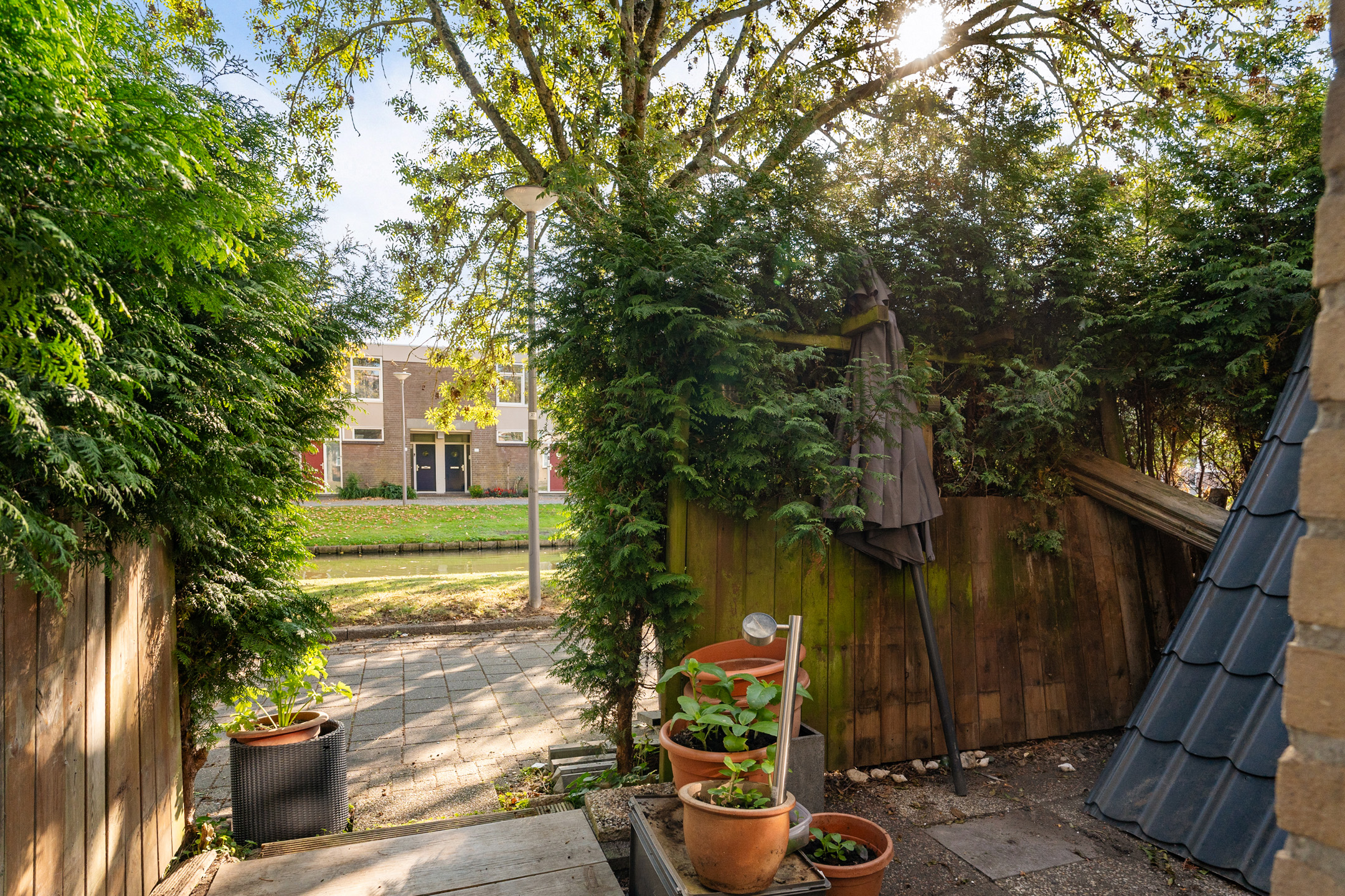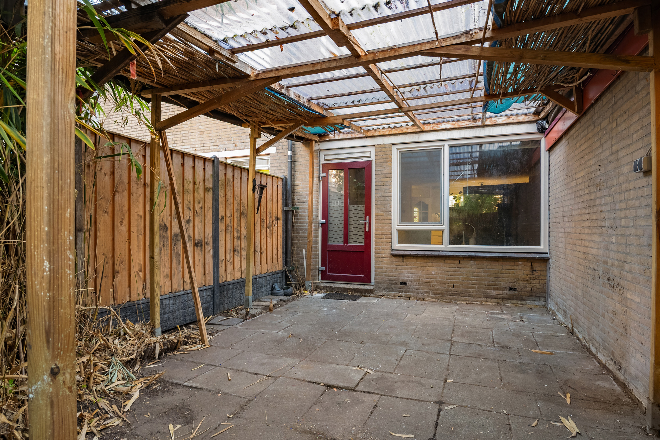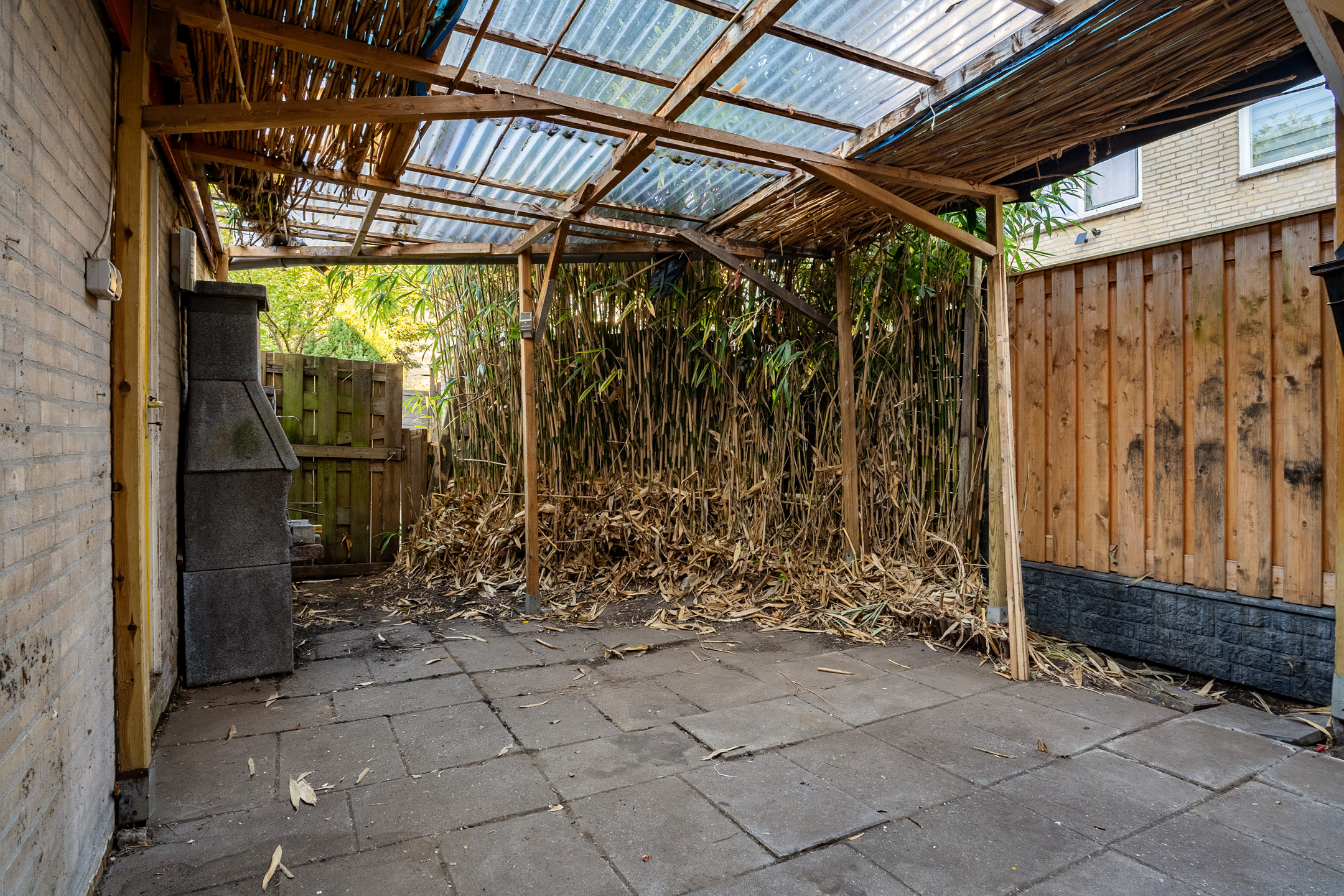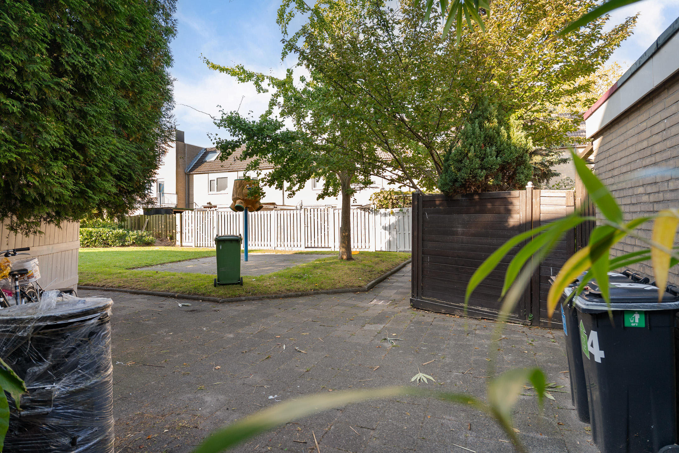 De achtertuin biedt ruimte voor een lounge- of eethoek en is gelegen op het Westen. Achterin staat een vrijstaande stenen berging en er is een achterom aanwezig.