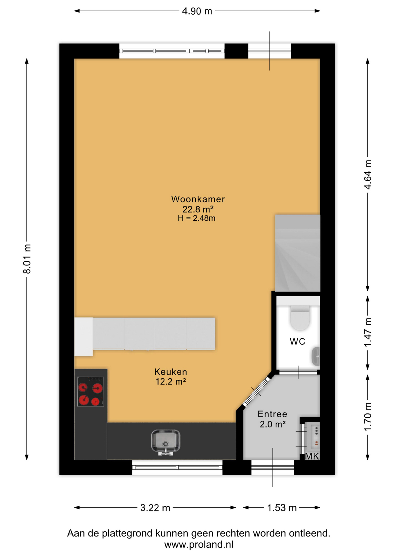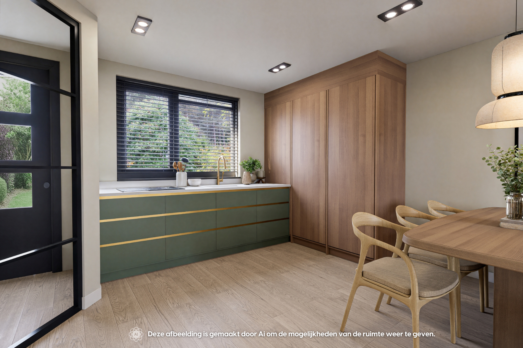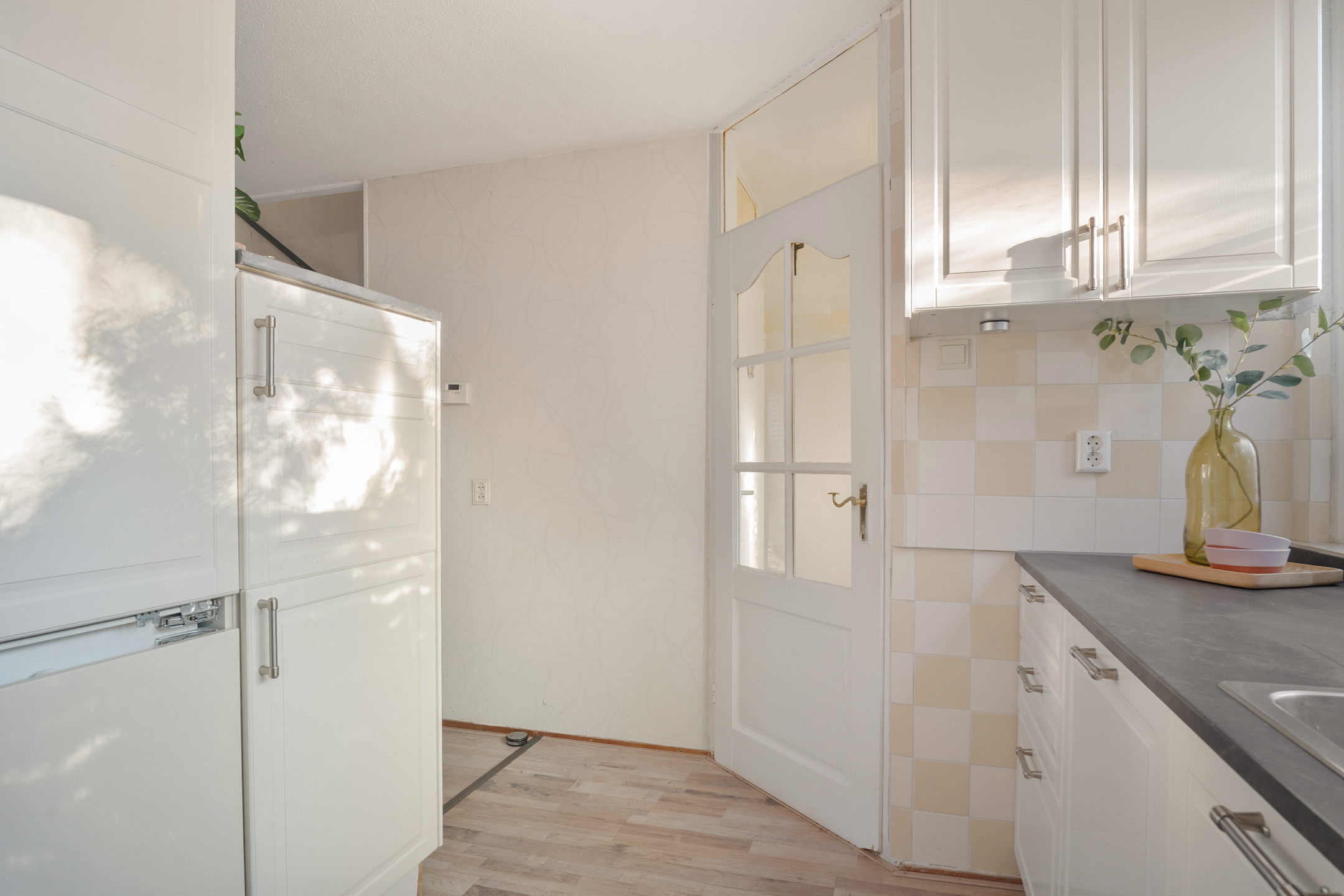 De woonkamer is ruim genoeg voor een comfortabele zit- én eethoek, en biedt toegang tot de trap naar boven. Aan de voorzijde van de woning ligt de keuken in L-opstelling. Deze is uitgerust met diverse inbouwapparatuur, waaronder een gaskookplaat, afzuigkap, oven, magnetron, vaatwasser en koel-/vriescombinatie. Door het raam boven het aanrecht heb je uitzicht op de singel.