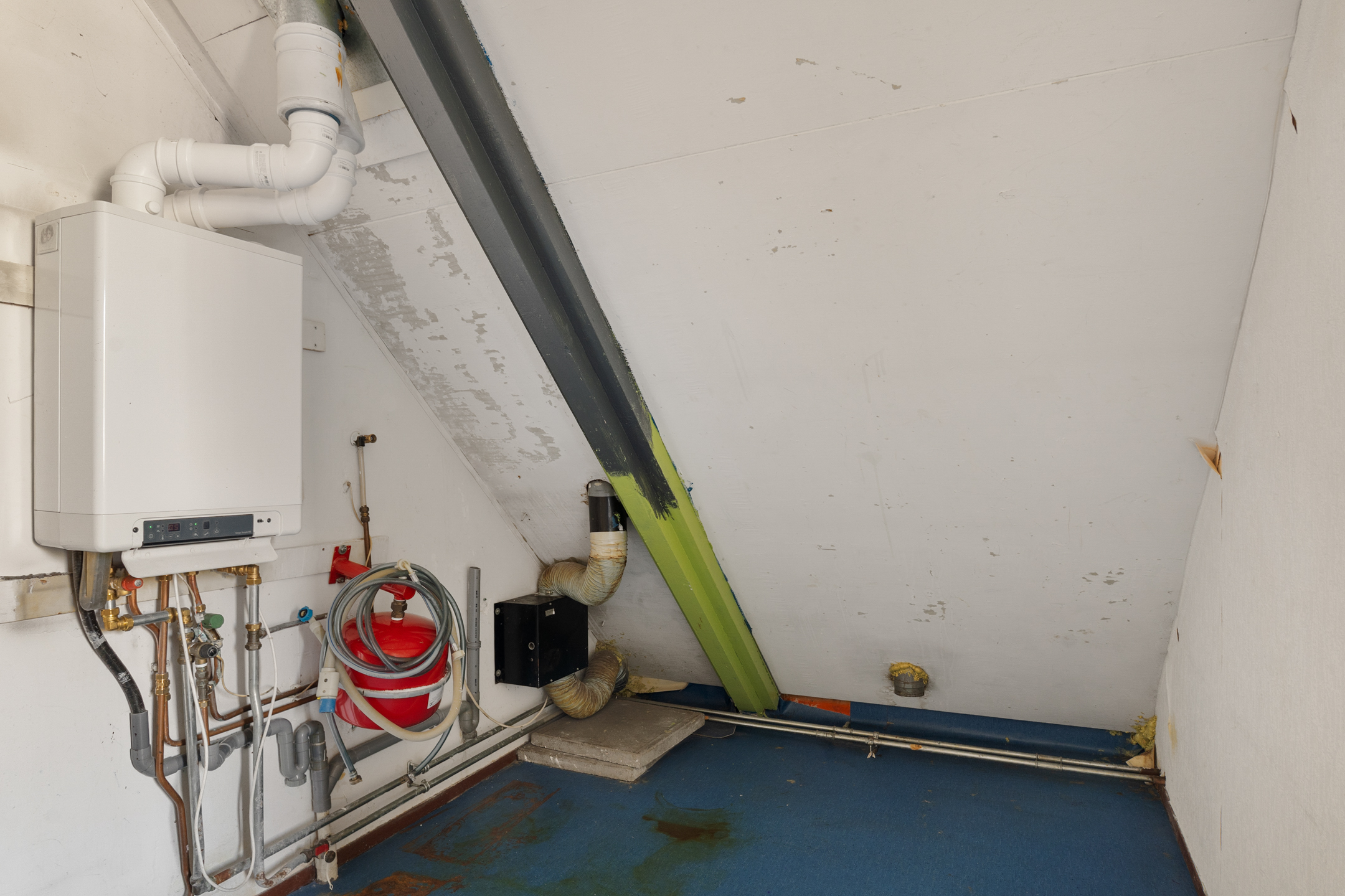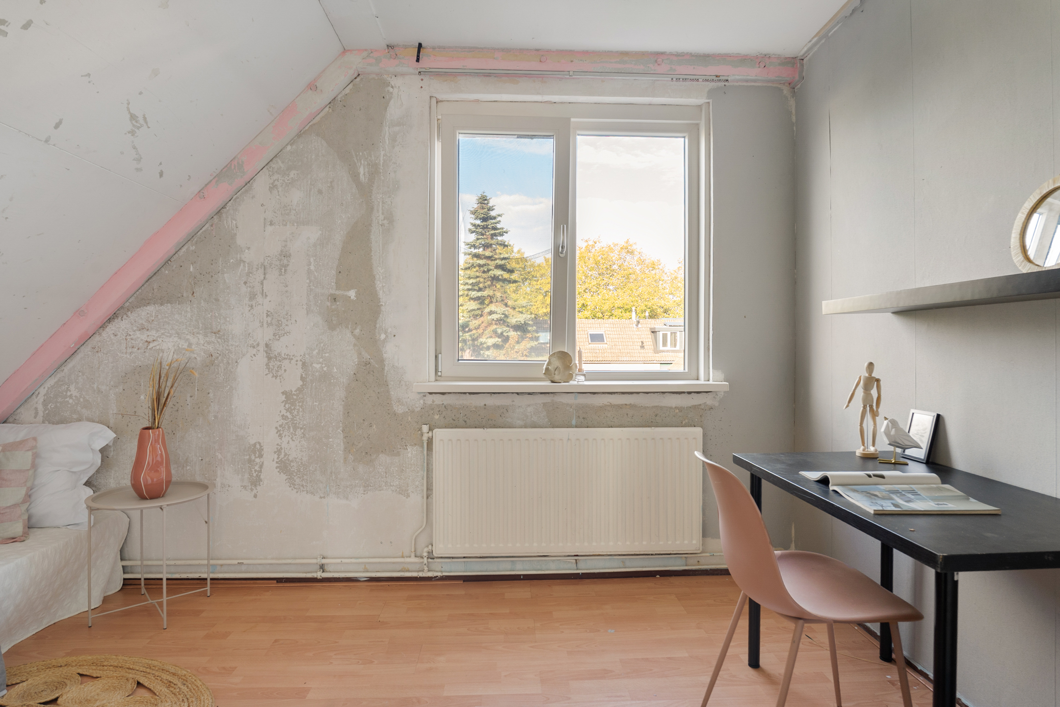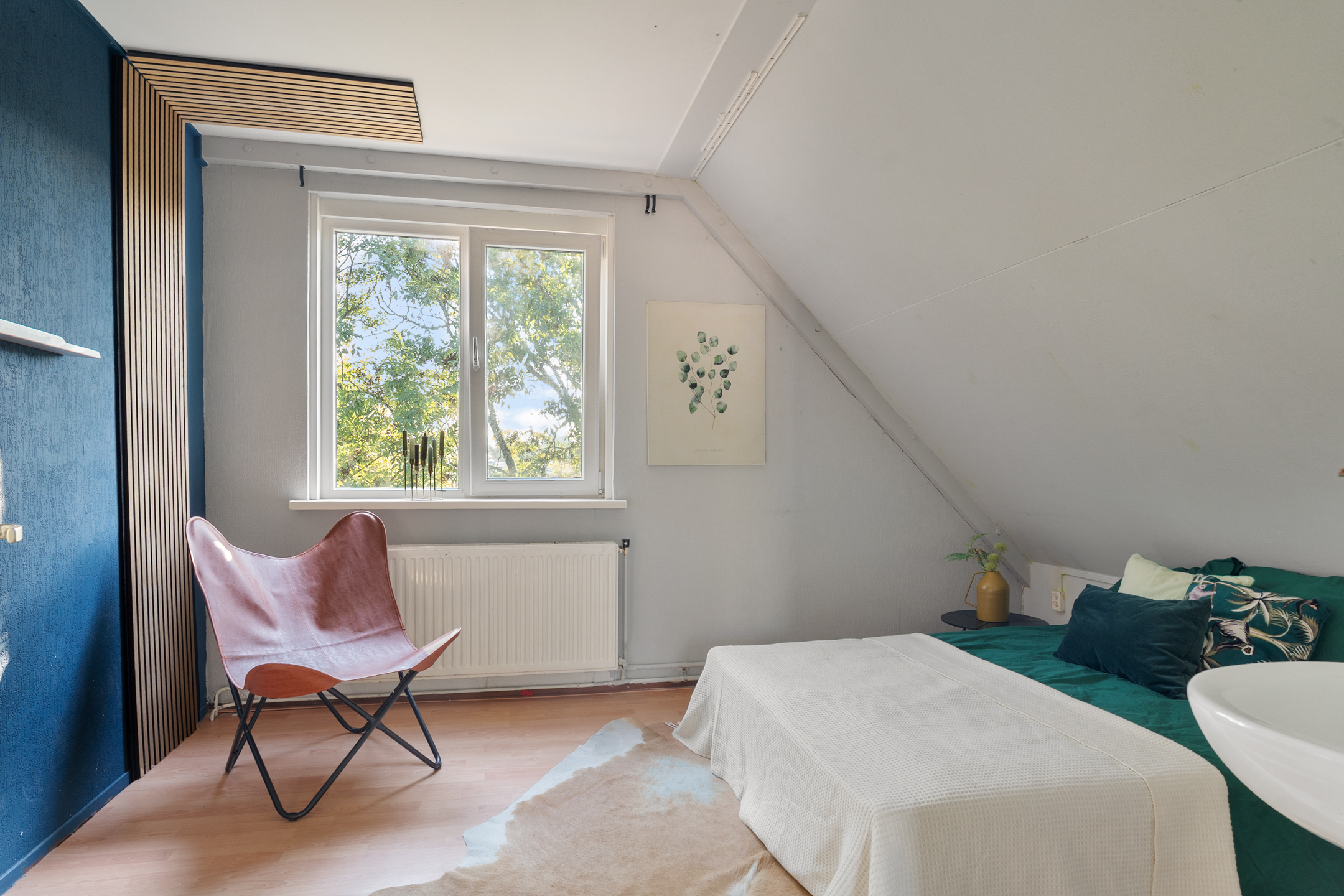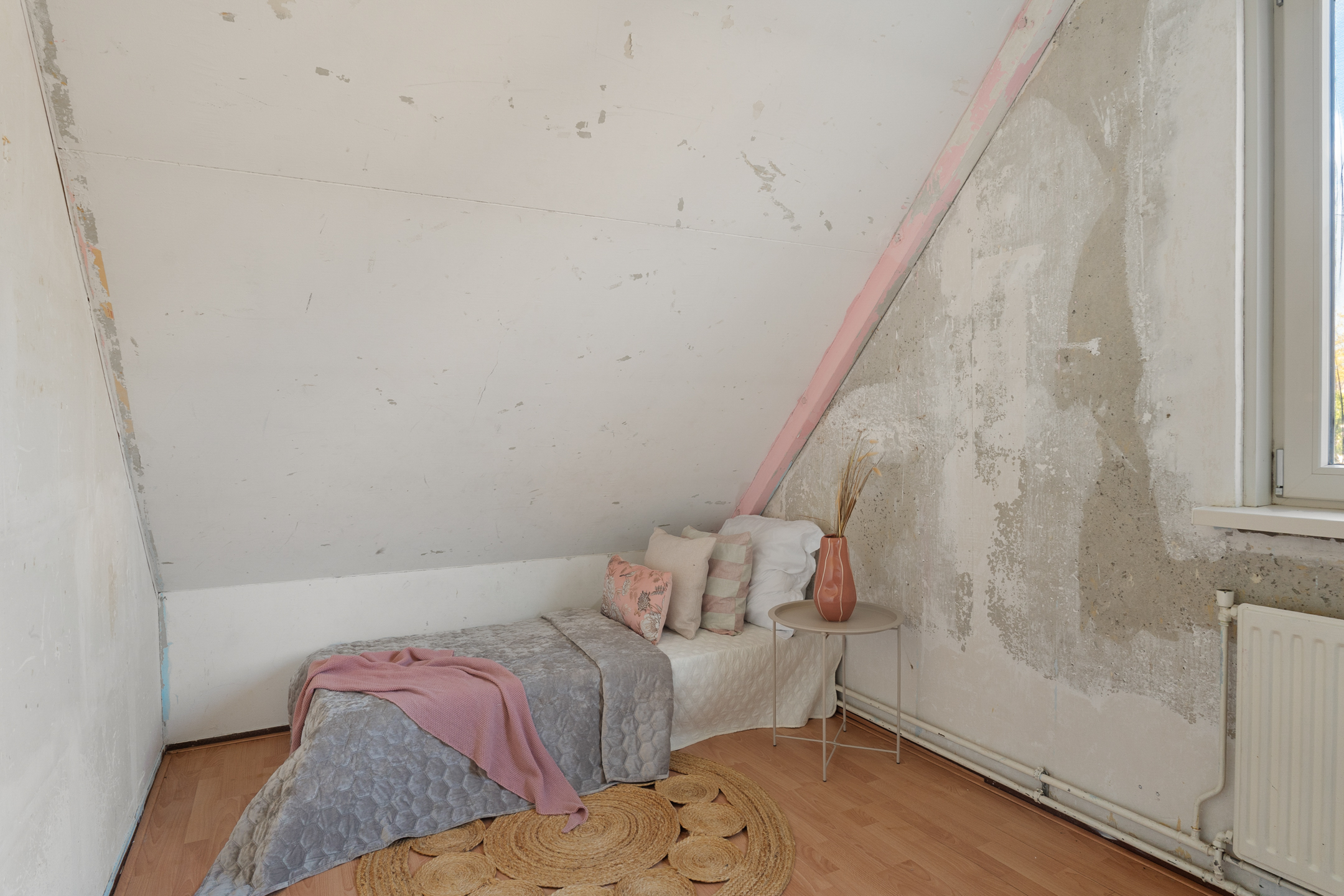 De zolderverdieping is praktisch ingedeeld met een overloop en twee extra slaapkamers. Beide kamers beschikken over daglicht via vaste ramen en zijn geschikt als slaap-, werk- of logeerkamer. Op de overloop zijn ook de aansluitingen voor de wasmachine en droger aanwezig, evenals de opstelling van de cv-ketel. De schuine daklijnen geven deze verdieping een speels karakter, terwijl de ruimte optimaal benut is.