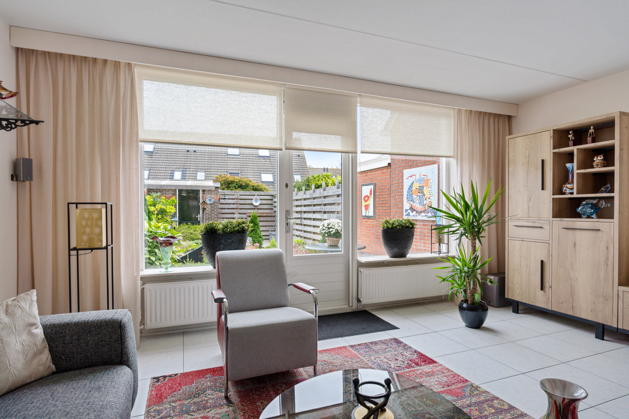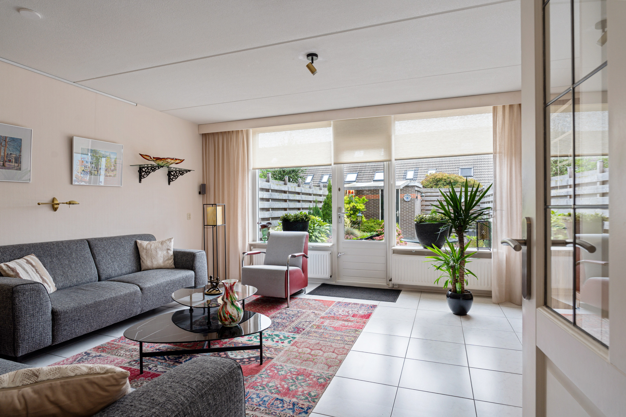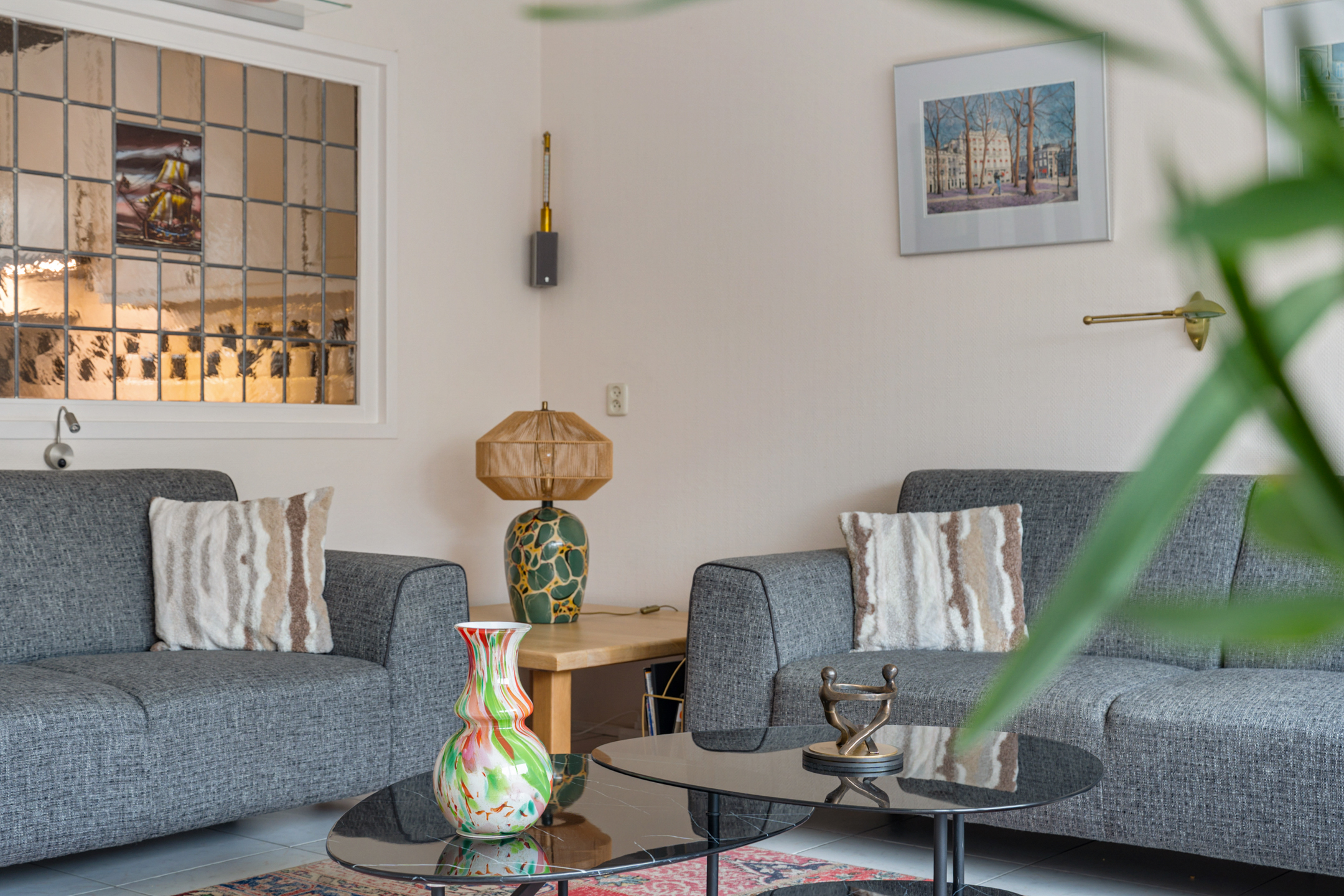 Dankzij de doorlopende tegelvloer met vloerverwarming voelt de begane grond comfortabel en ruimtelijk aan. Aan de achterzijde bevindt zich de lichte woonkamer met grote raampartijen en toegang tot de zonnige tuin.