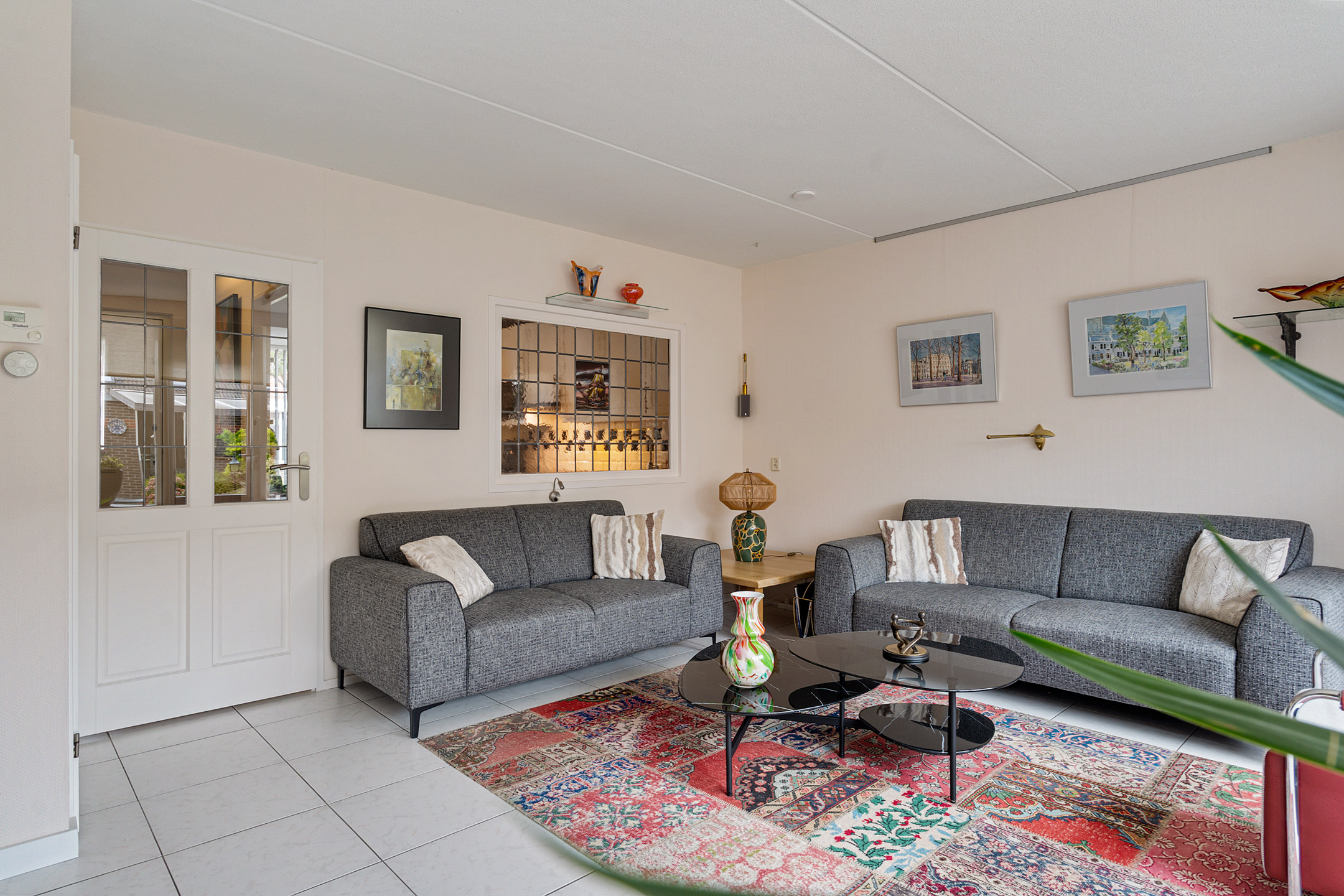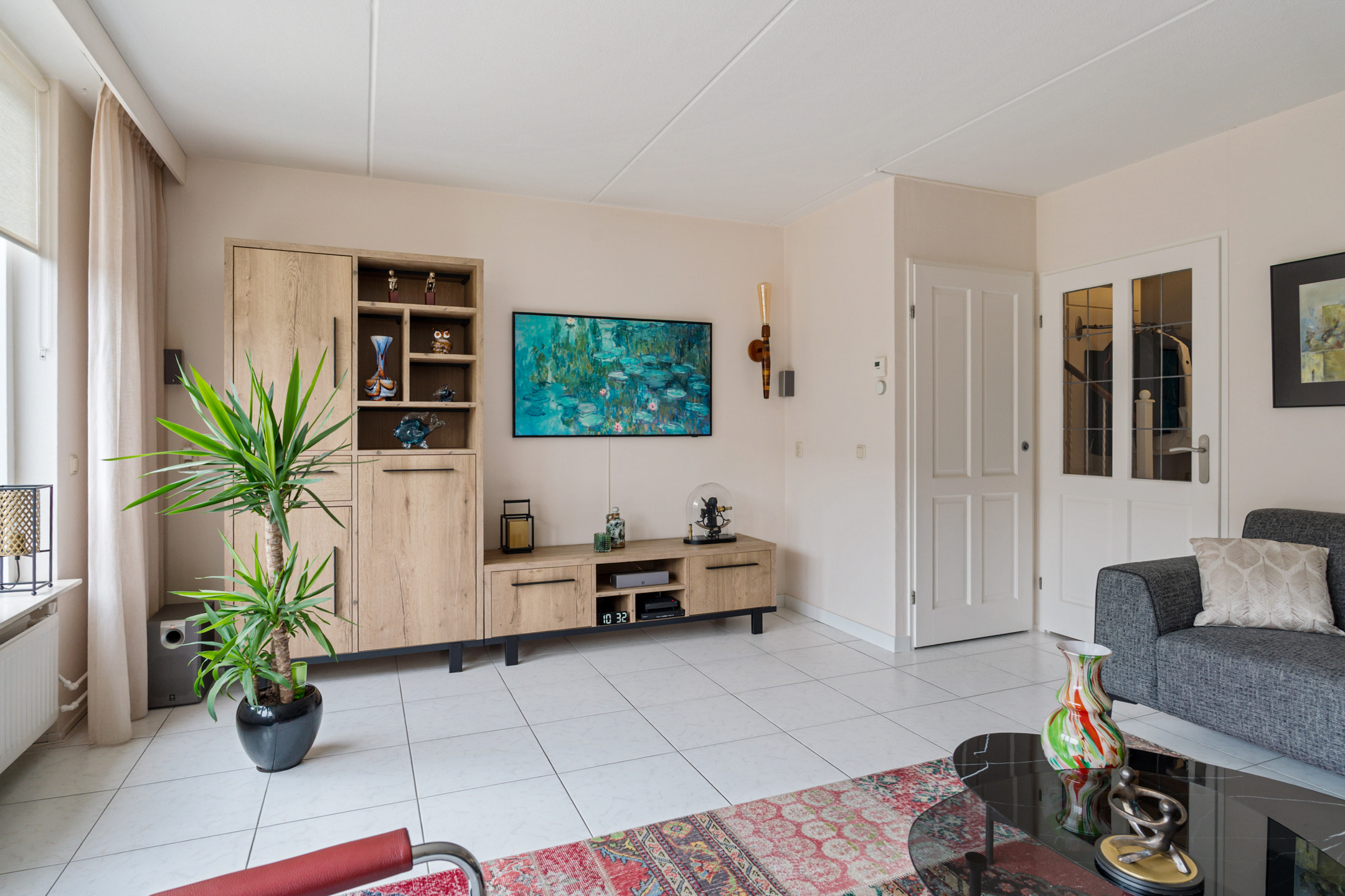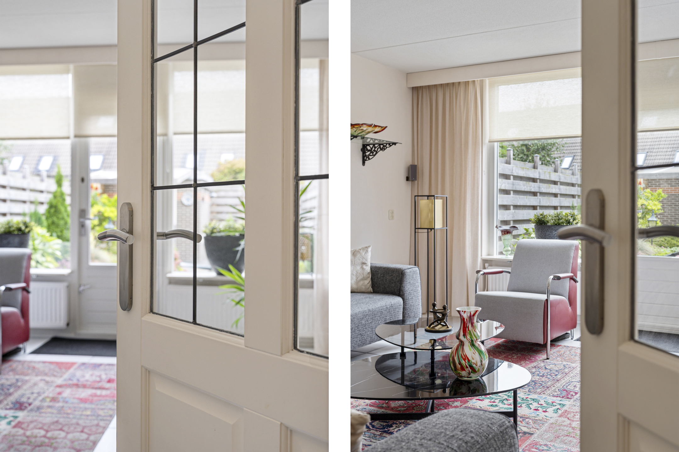 Dankzij de doorlopende tegelvloer met vloerverwarming voelt de begane grond comfortabel en ruimtelijk aan. Aan de achterzijde bevindt zich de lichte woonkamer met grote raampartijen en toegang tot de zonnige tuin.