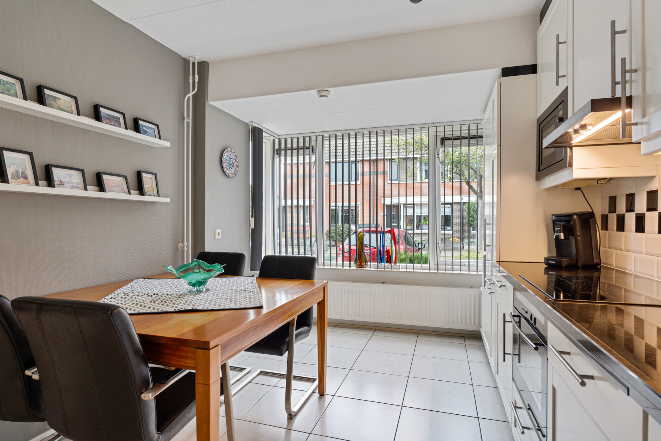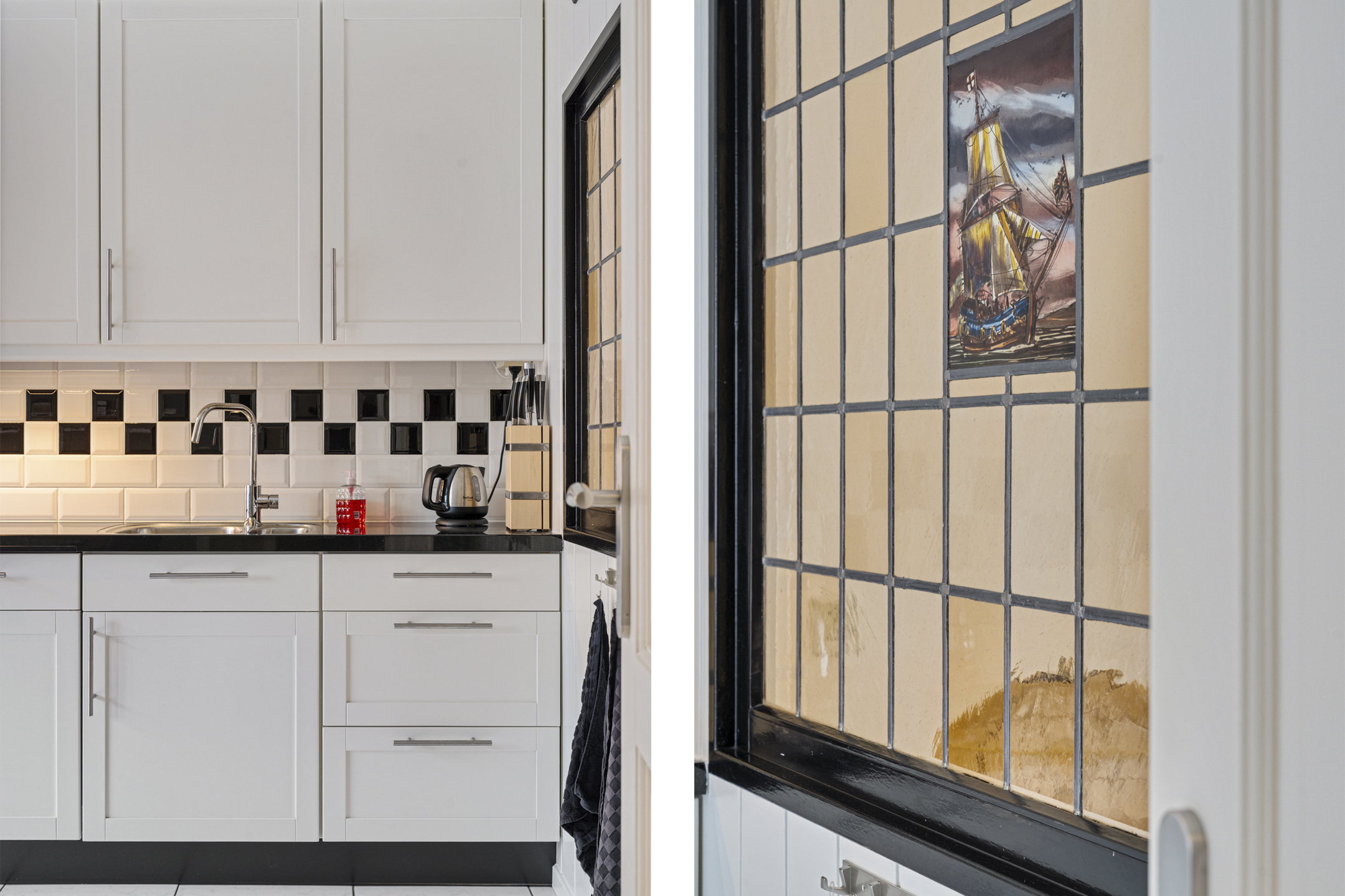 De hal aan de voorzijde geeft toegang tot een modern toilet (2010), de vernieuwde meterkast met 11 groepen en de trap naar boven. Aan de voorzijde ligt de eetkamer met sfeervolle erker, een fijne plek om samen te komen. De open keuken (2005) heeft een hardstenen blad, elektrische kookplaat en diverse inbouwapparatuur.
