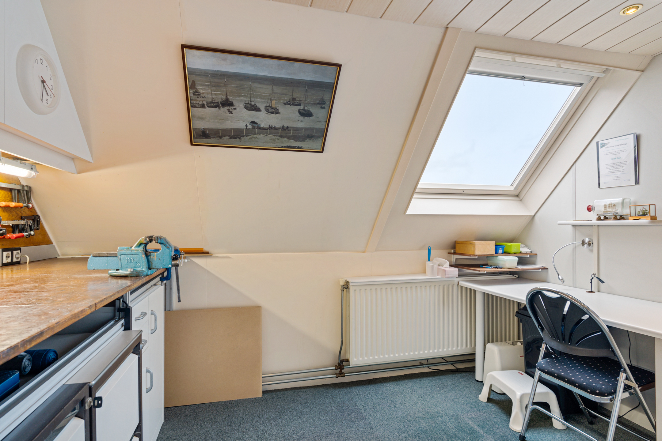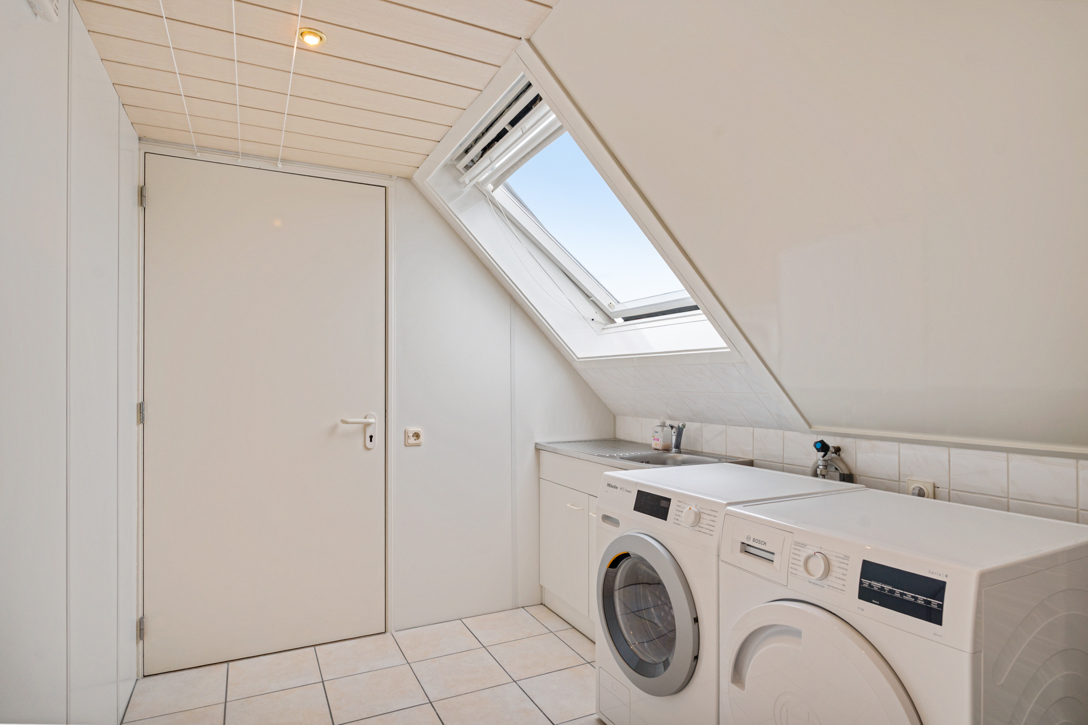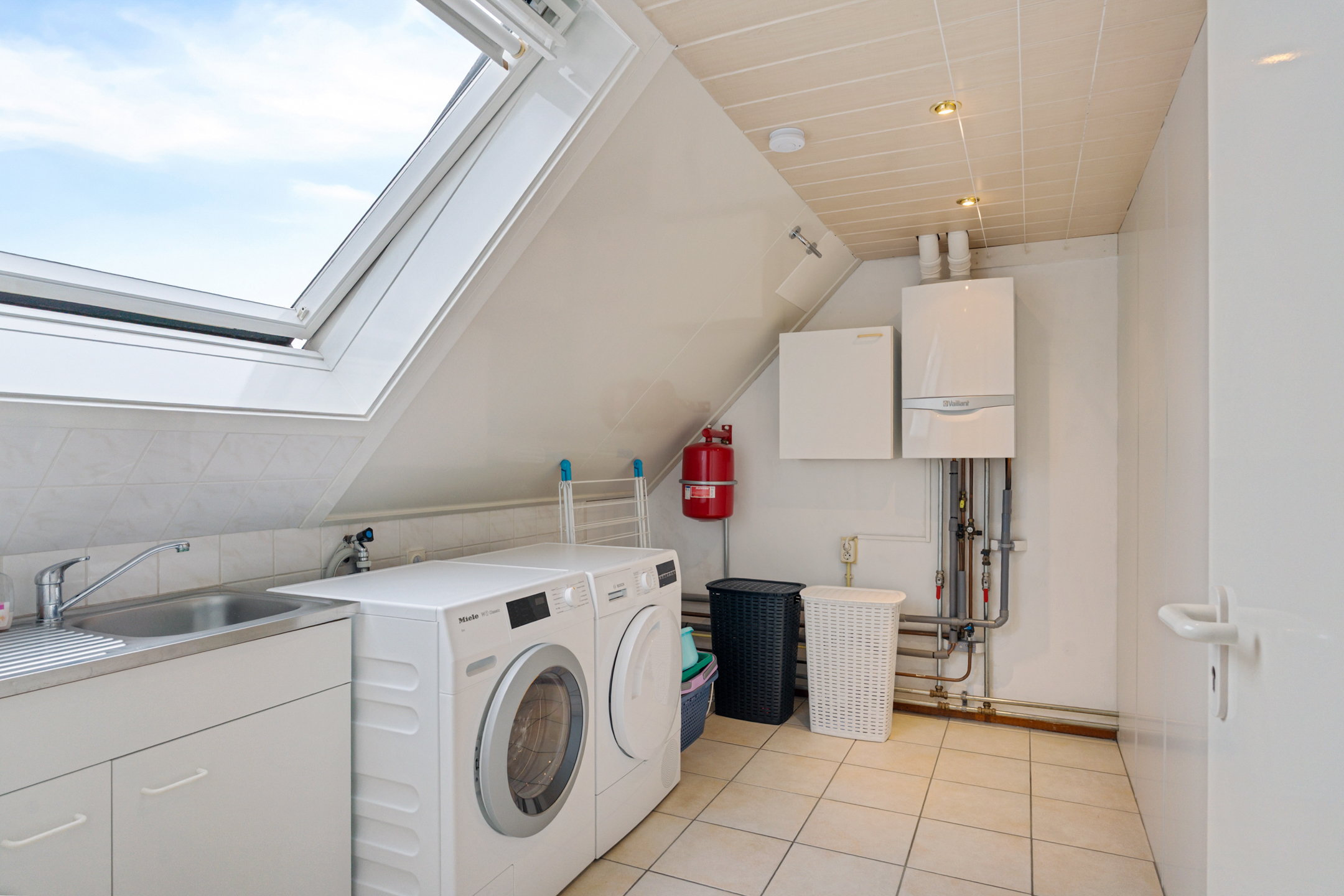 De vierde slaapkamer ligt aan de achterzijde en is voorzien van een dakraam. Aan de voorzijde vind je een praktische ruimte die dienstdoet als bijkeuken, wasruimte en stookruimte met cv-opstelling en keukenblok met wastafel. Via een vlizotrap bereik je de vliering, ideaal voor extra opslag.