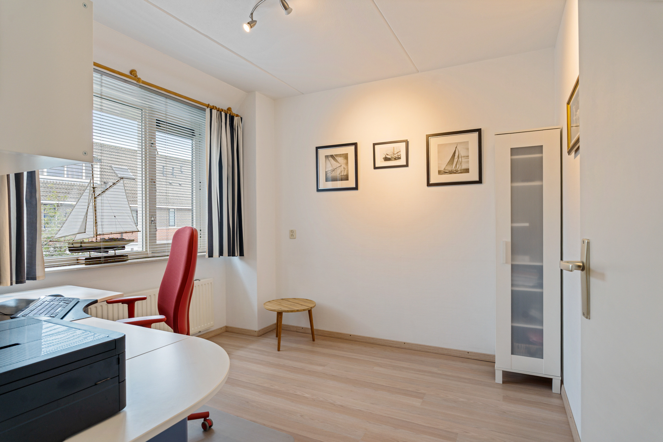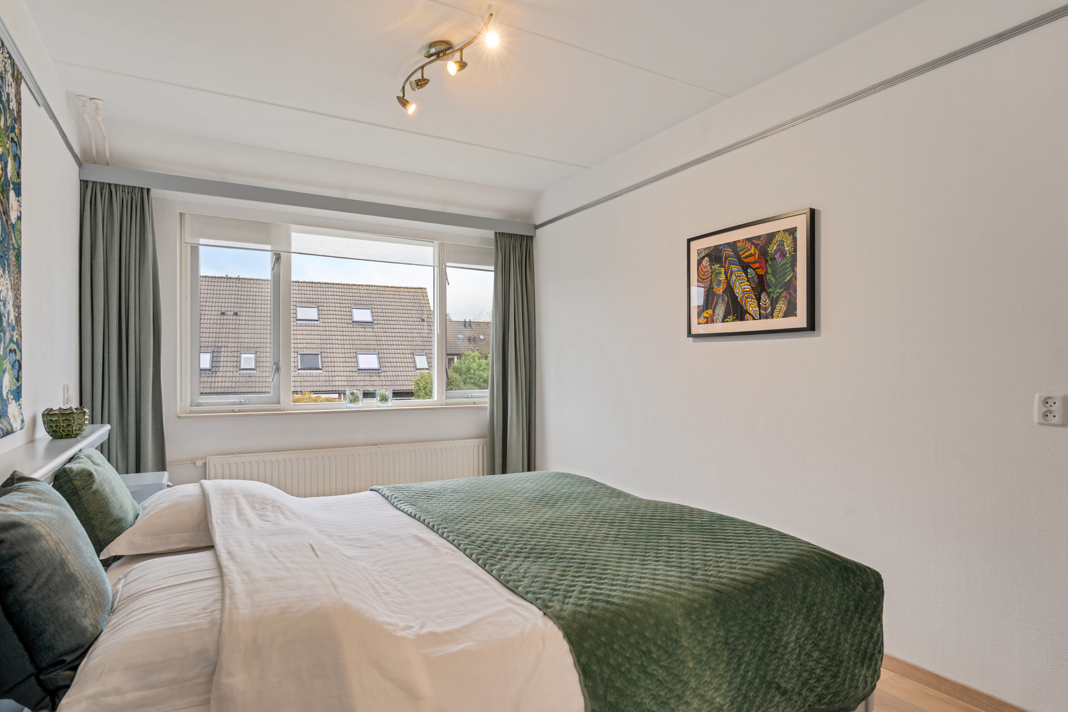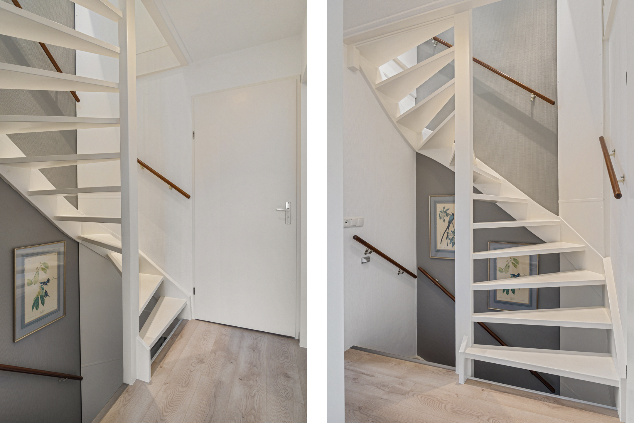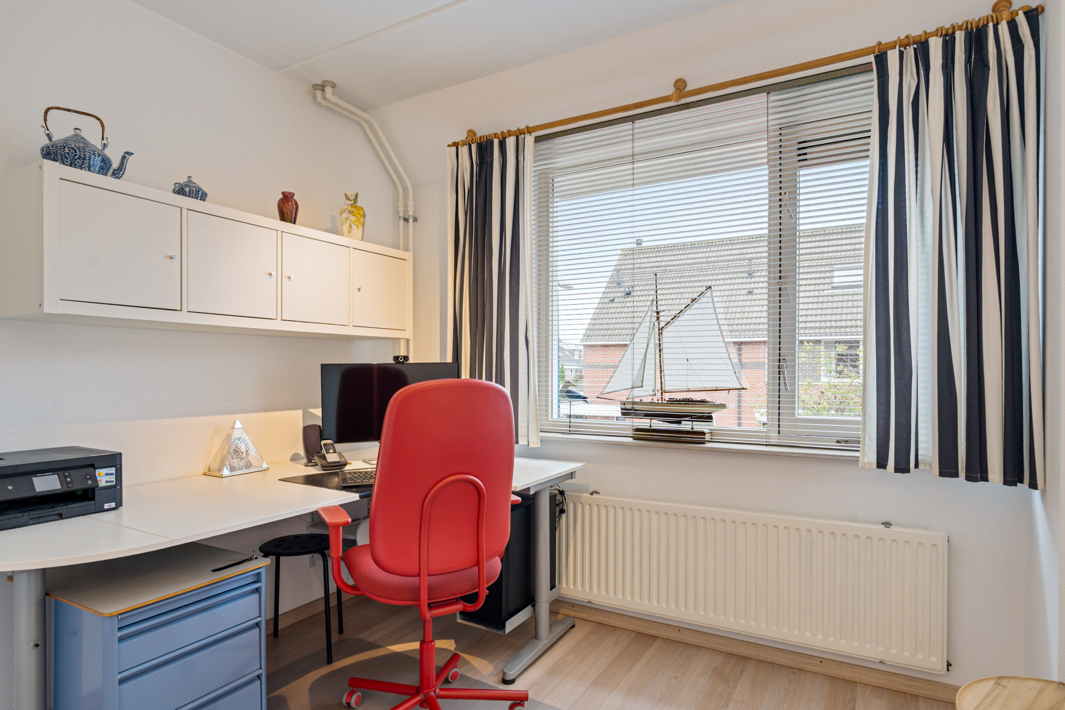 De vierde slaapkamer ligt aan de achterzijde en is voorzien van een dakraam. Aan de voorzijde vind je een praktische ruimte die dienstdoet als bijkeuken, wasruimte en stookruimte met cv-opstelling en keukenblok met wastafel. Via een vlizotrap bereik je de vliering, ideaal voor extra opslag.