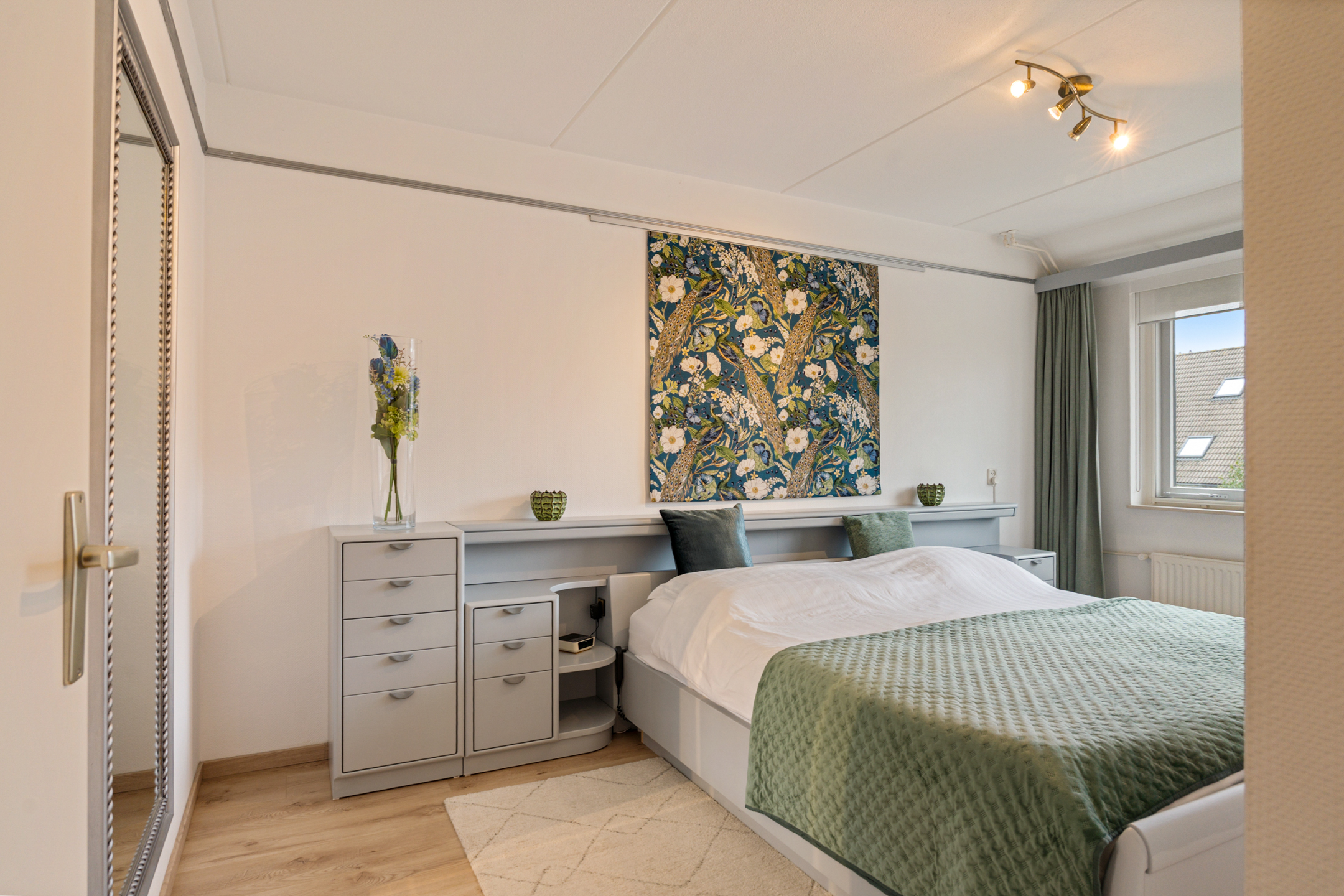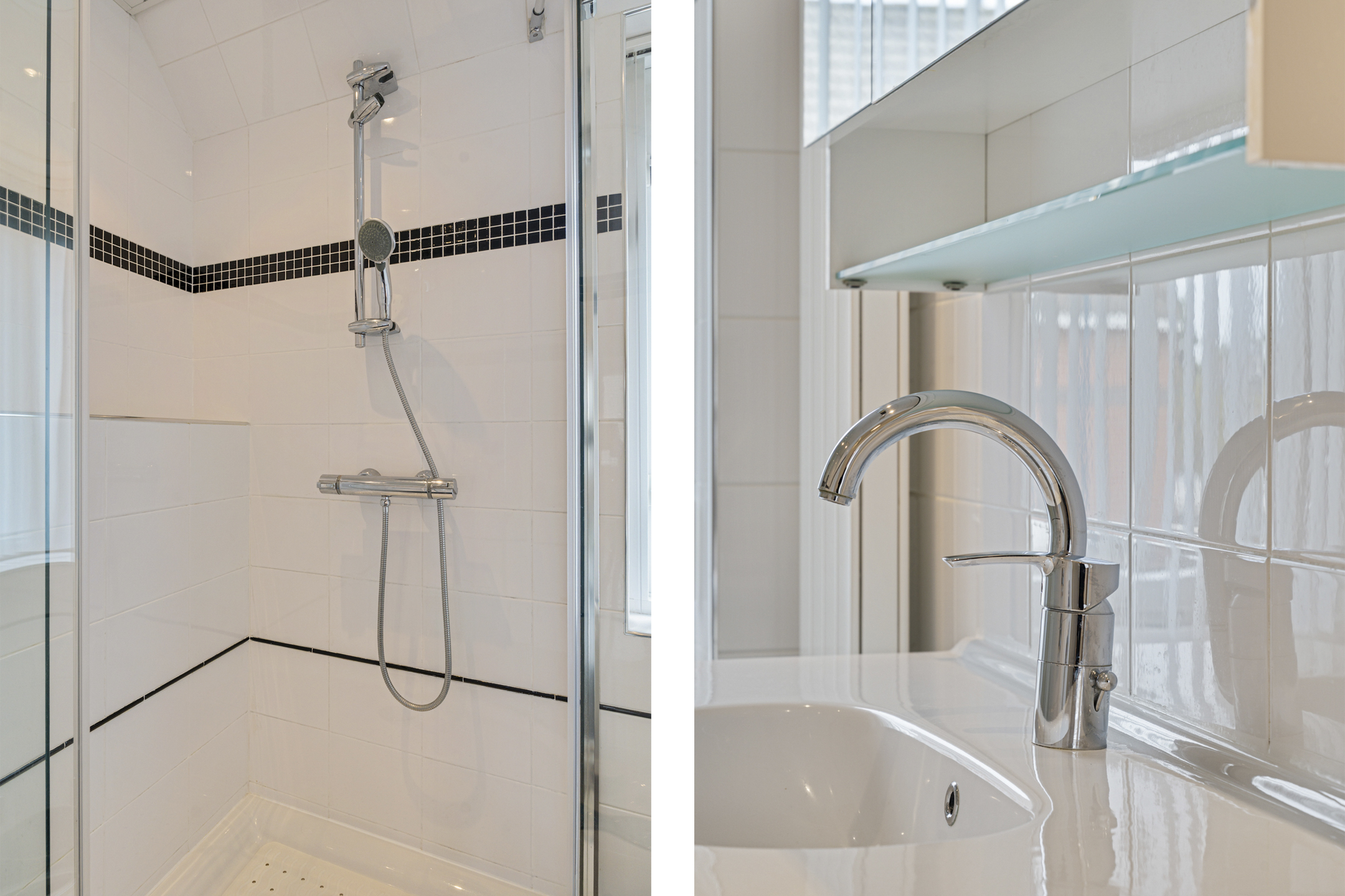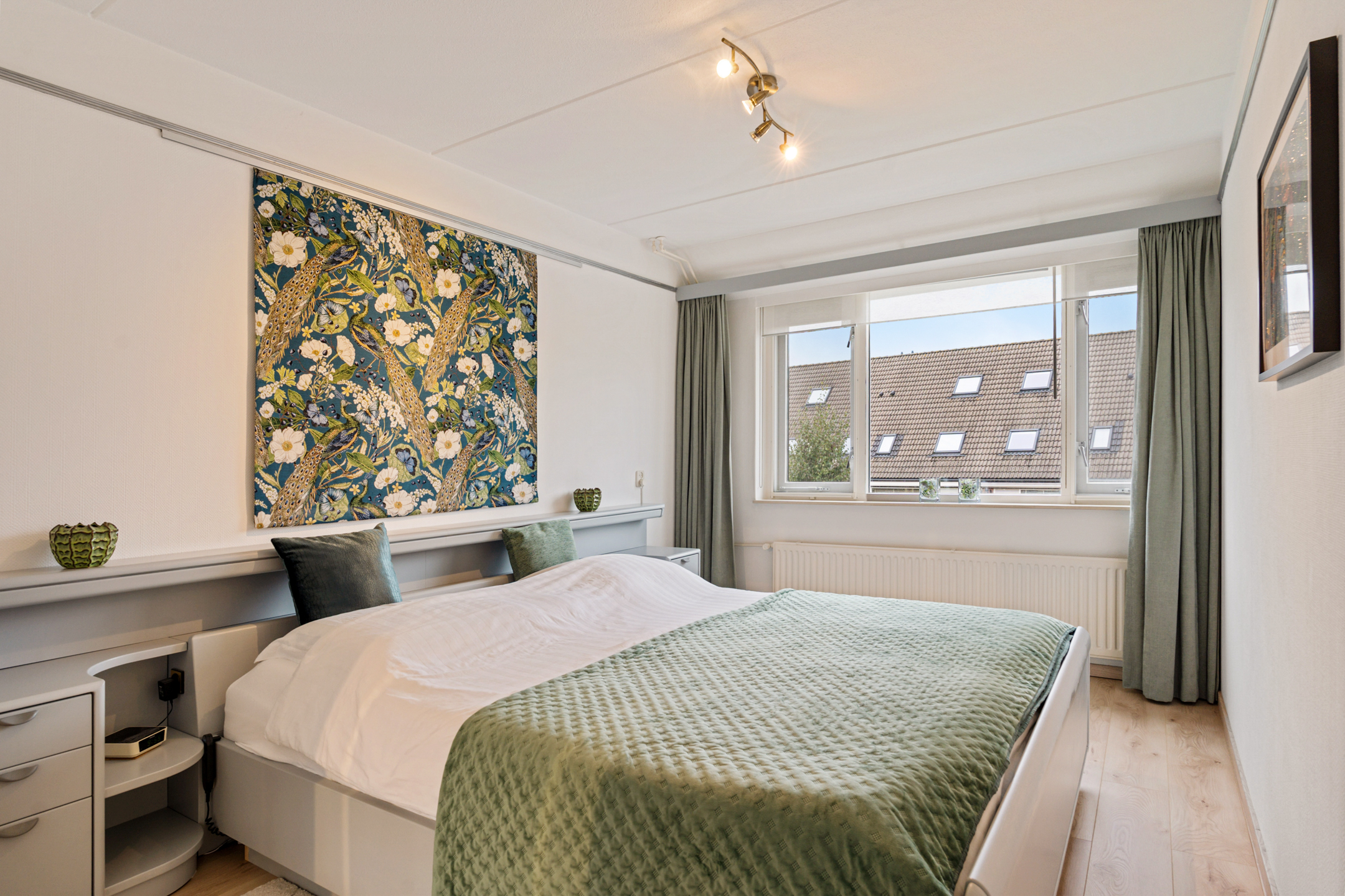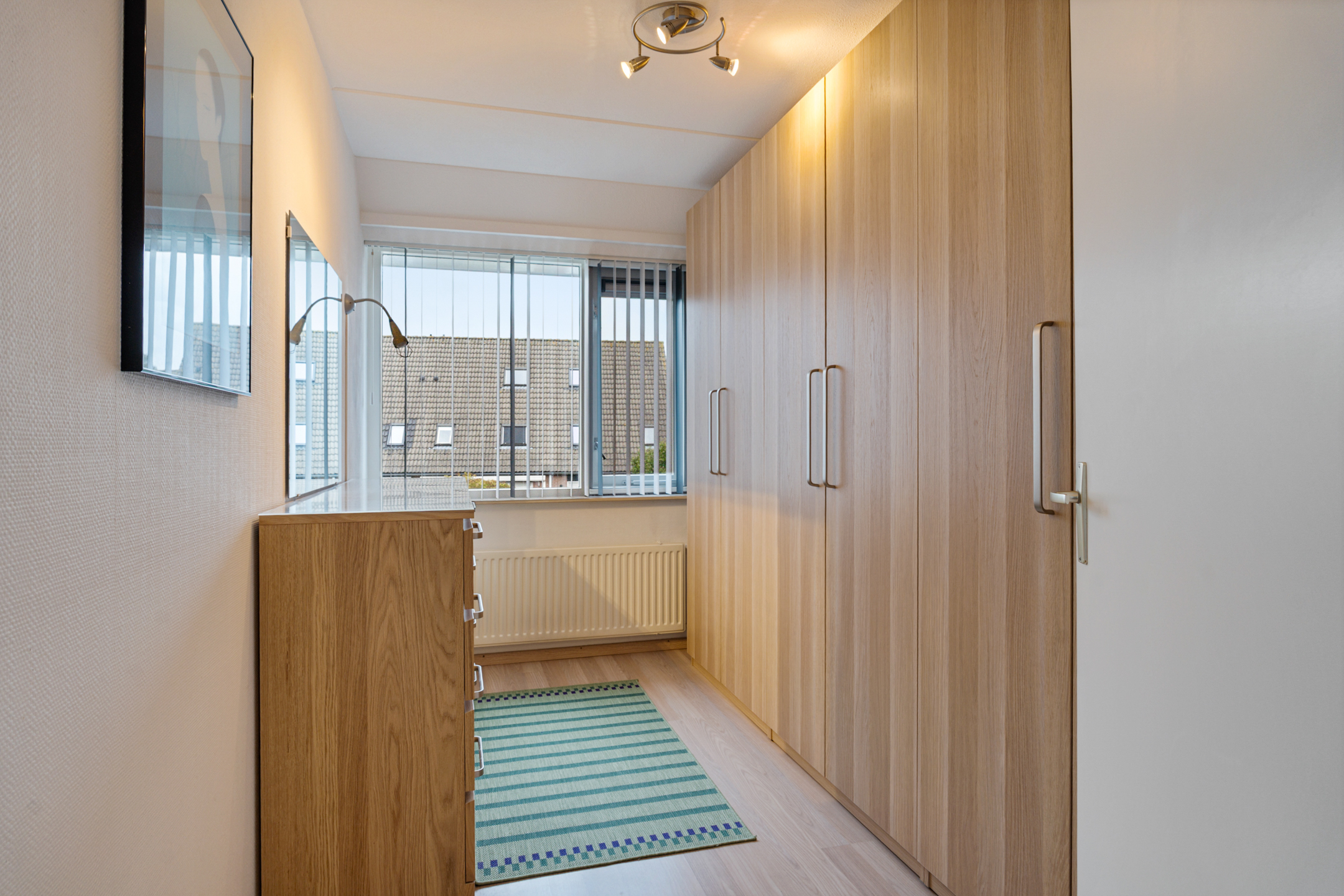 Op de eerste verdieping zijn drie slaapkamers. Aan de achterzijde ligt de ruime master bedroom en daarnaast een tweede kamer, nu ingericht als inloopkast. De derde slaapkamer ligt aan de voorzijde. De verzorgde badkamer is compleet met douchecabine, wastafelmeubel en toilet.