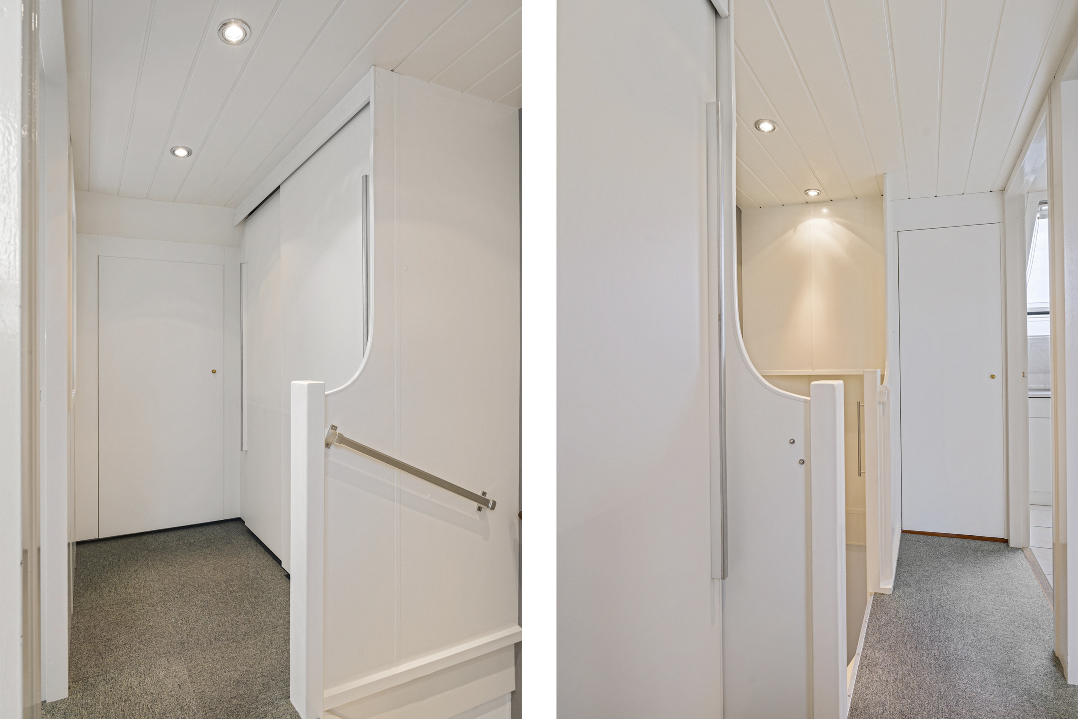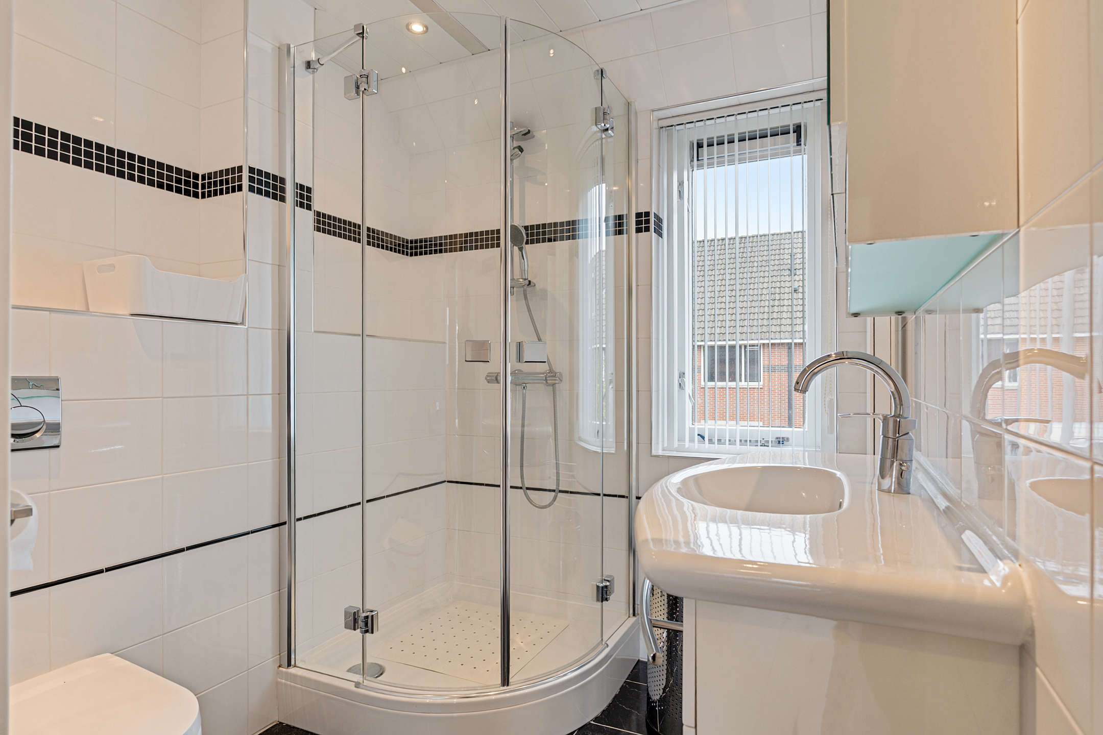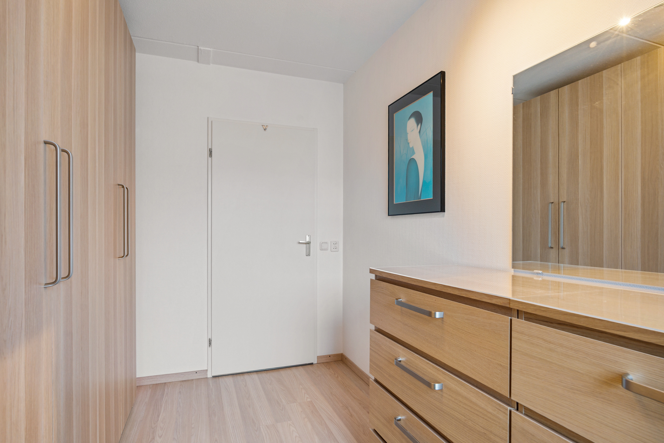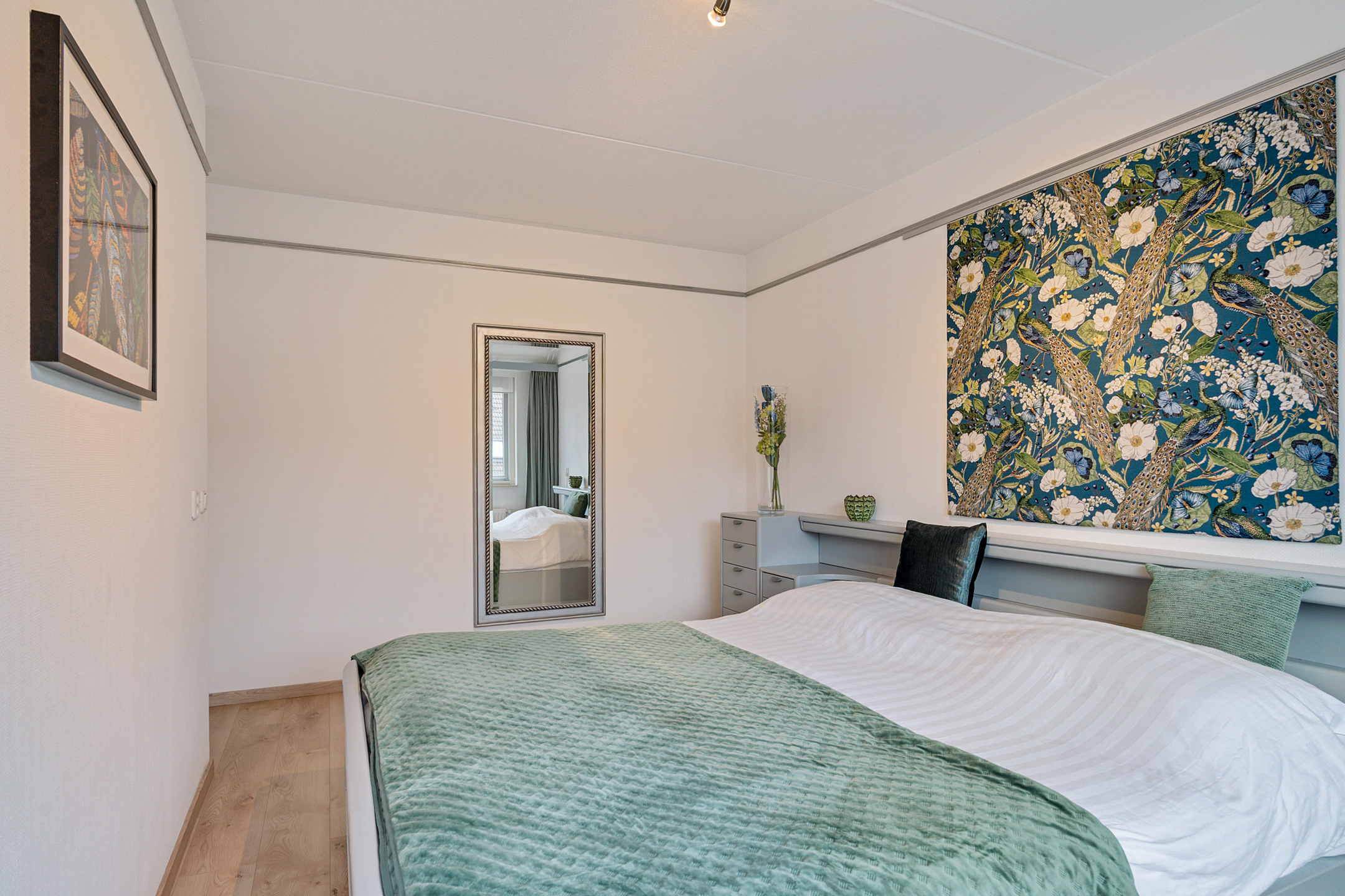 Op de eerste verdieping zijn drie slaapkamers. Aan de achterzijde ligt de ruime master bedroom en daarnaast een tweede kamer, nu ingericht als inloopkast. De derde slaapkamer ligt aan de voorzijde. De verzorgde badkamer is compleet met douchecabine, wastafelmeubel en toilet.