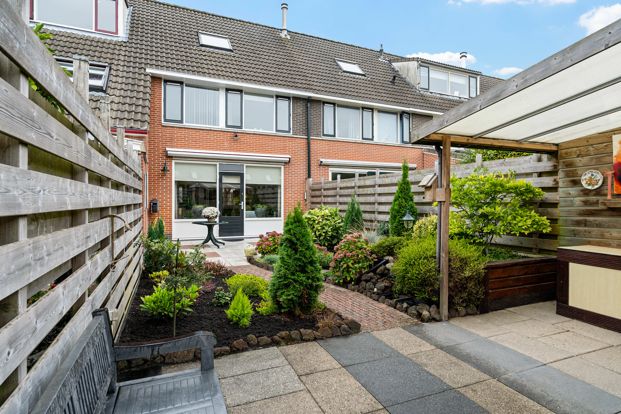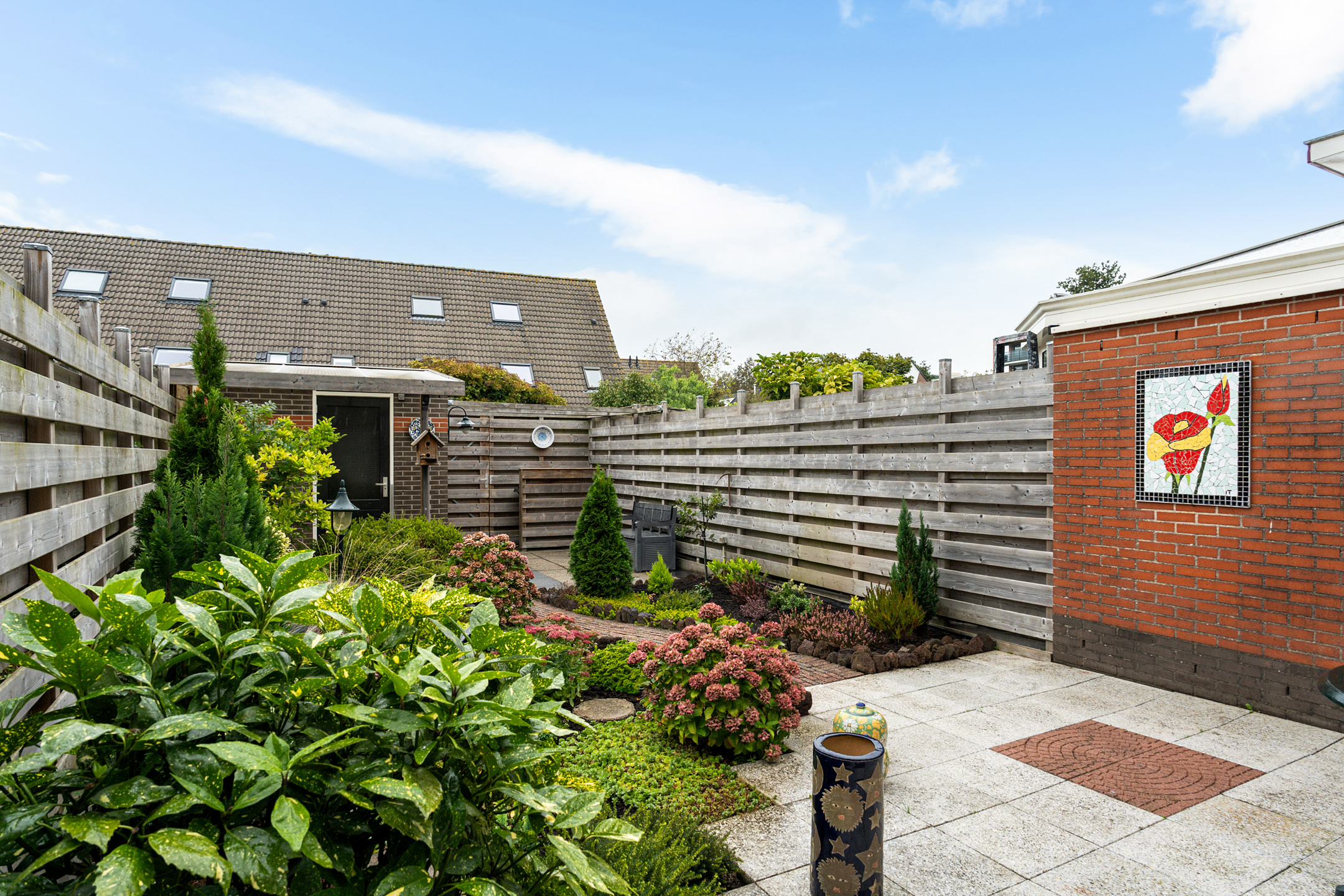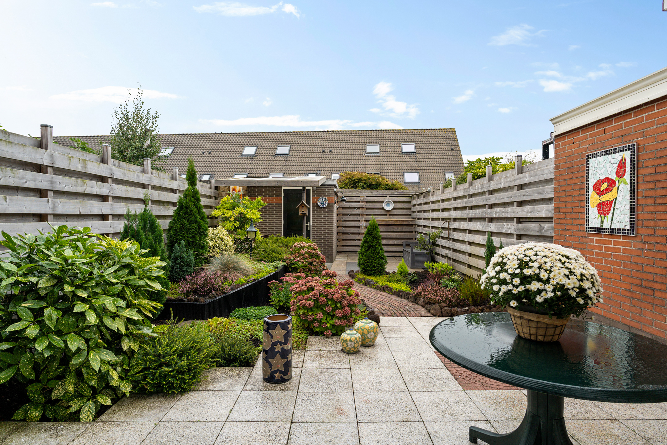 De diepe achtertuin op het noordwesten is fraai aangelegd en goed onderhouden. Hier vind je altijd een plekje in de zon. Achter in de tuin staat een vrijstaande stenen berging met elektra en een aangebouwde houten overkapping, perfect voor fietsen en extra bergruimte. Op warme dagen biedt het zonnescherm de nodige verkoeling.