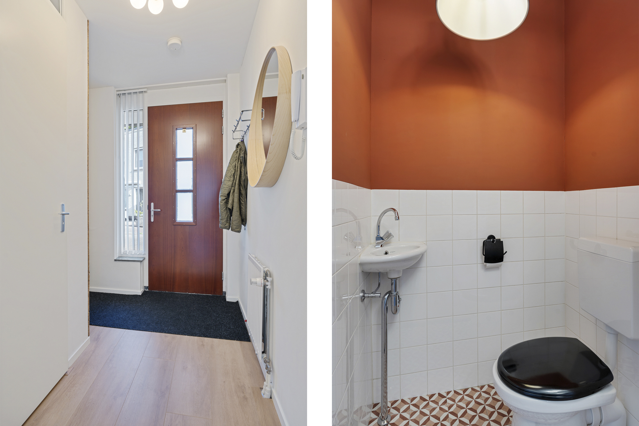 Middels de hardhouten voordeur komt u in de hal met garderoberuimte, meterkast en toilet.