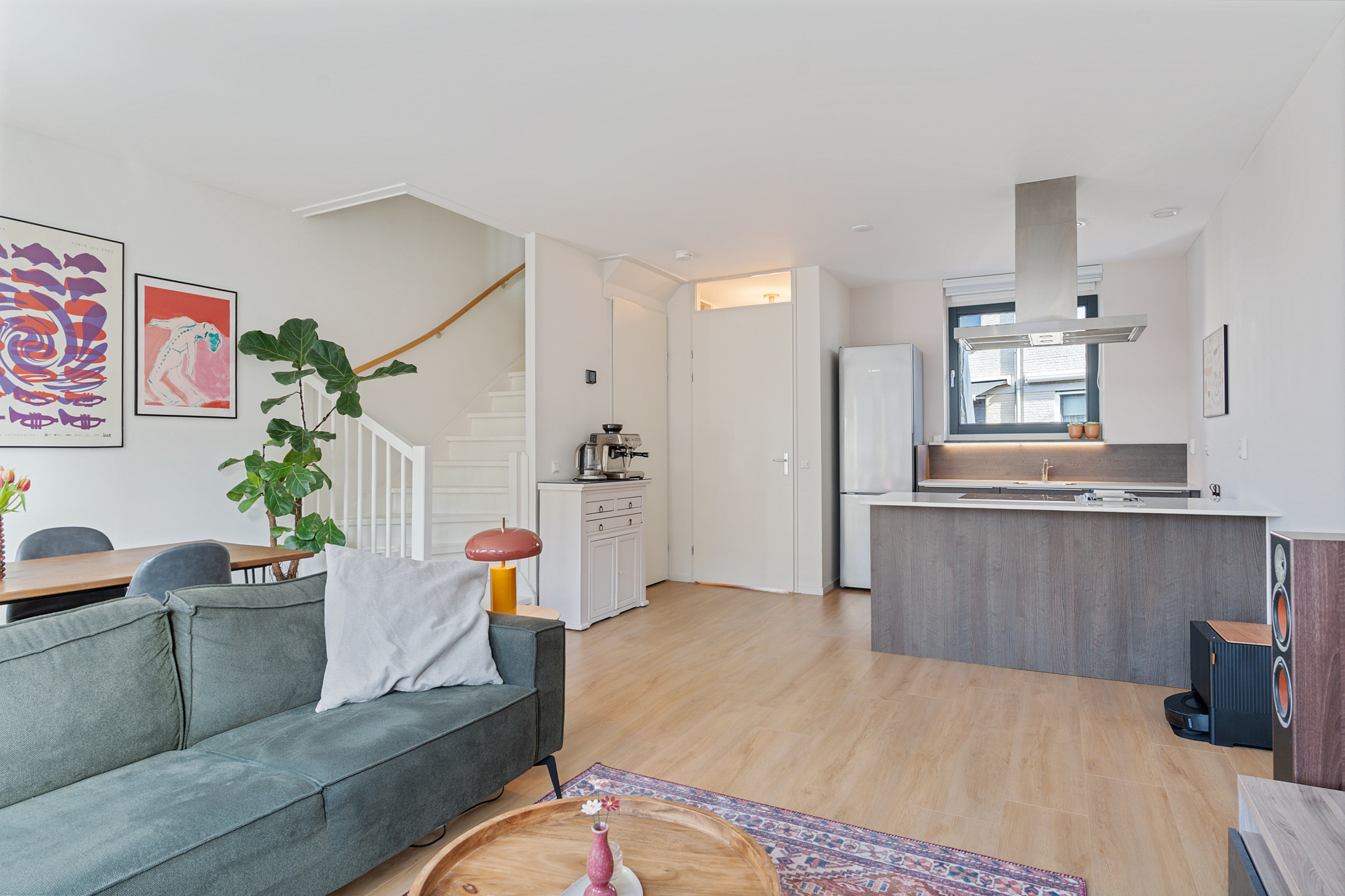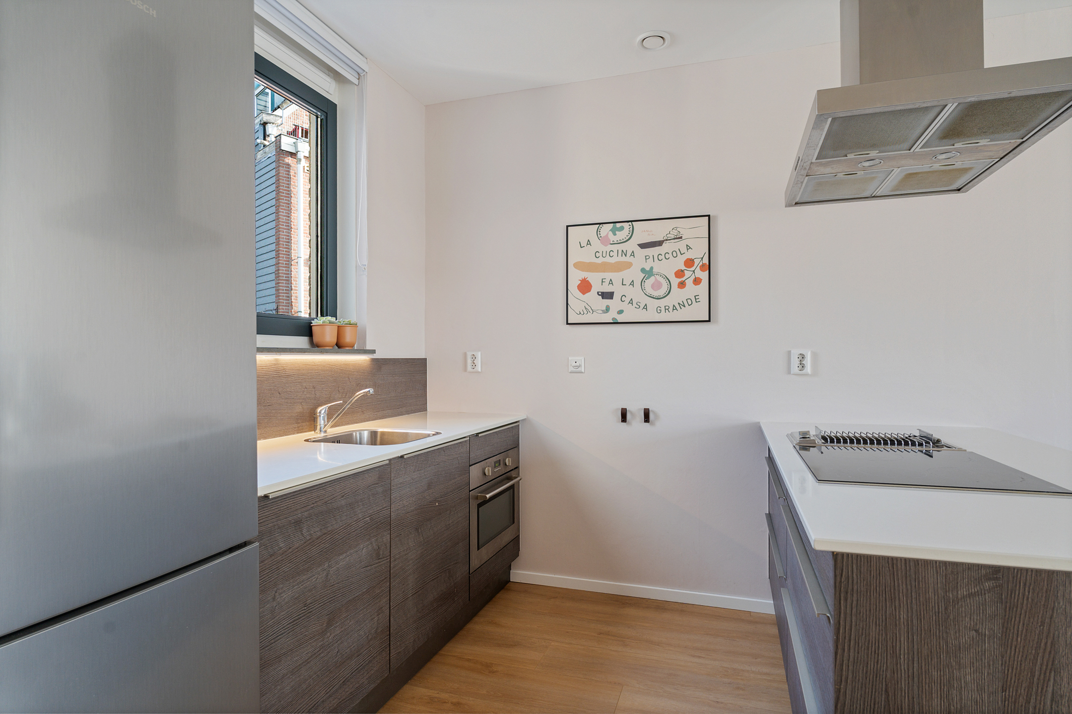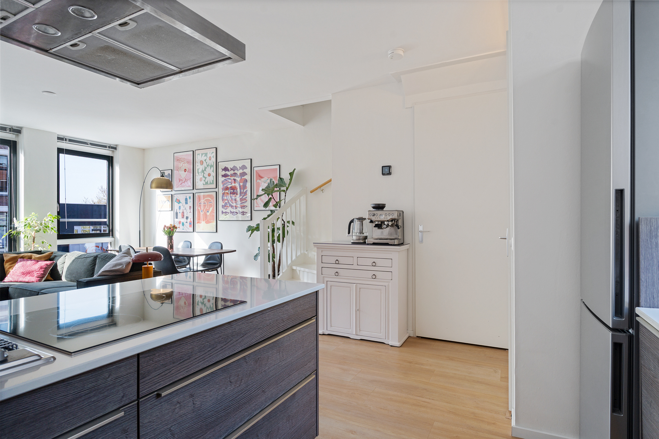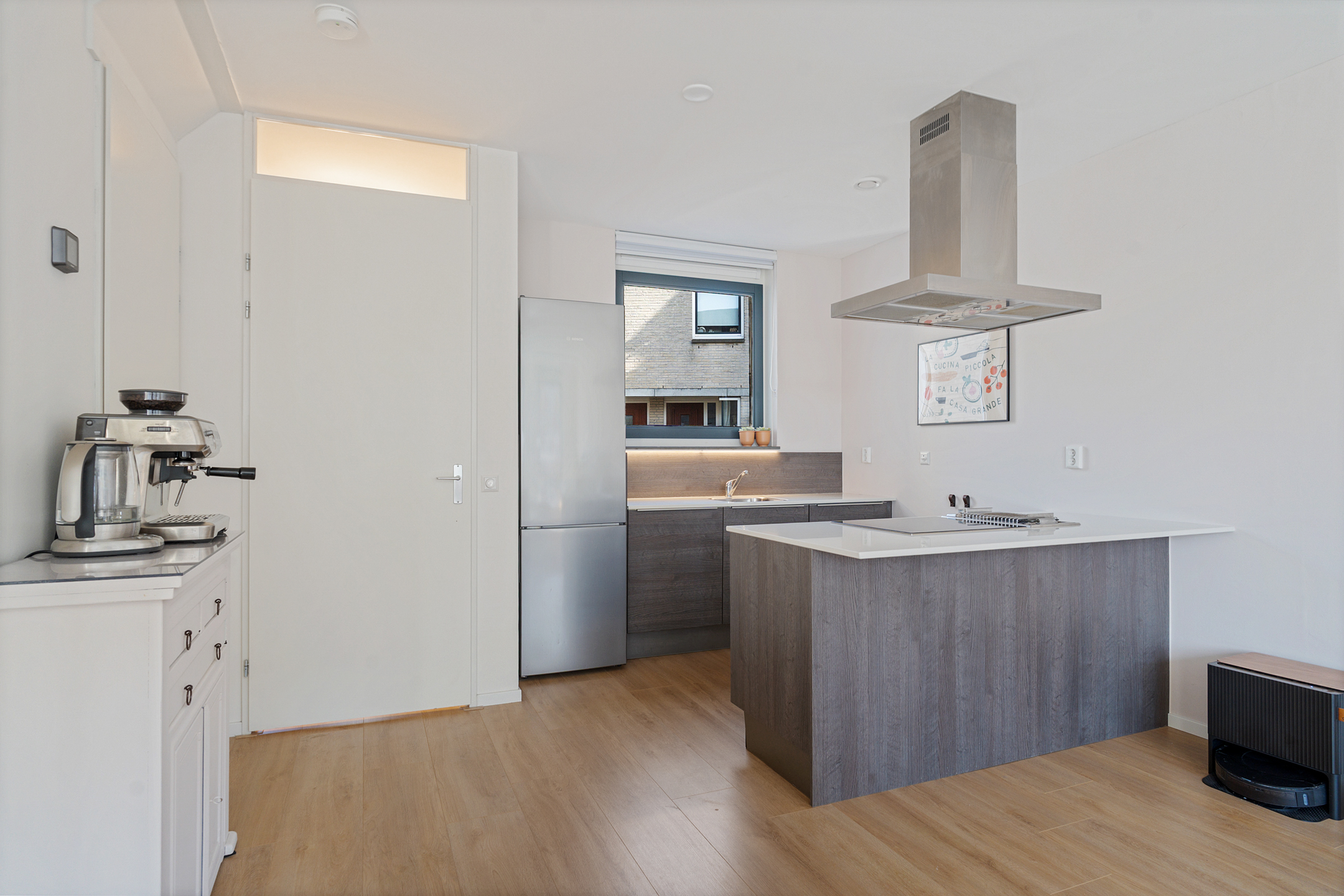 De woonkamer heeft een fijne lichtinval dankzij de Franse balkons en beschikt over een voorraadkast onder de trap en een open keuken met kookeiland, diverse inbouwapparatuur en een natuurstenen werkblad.