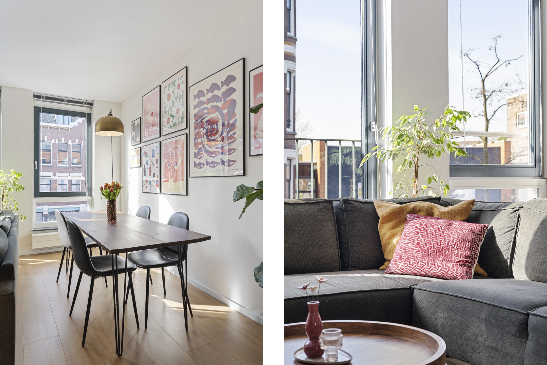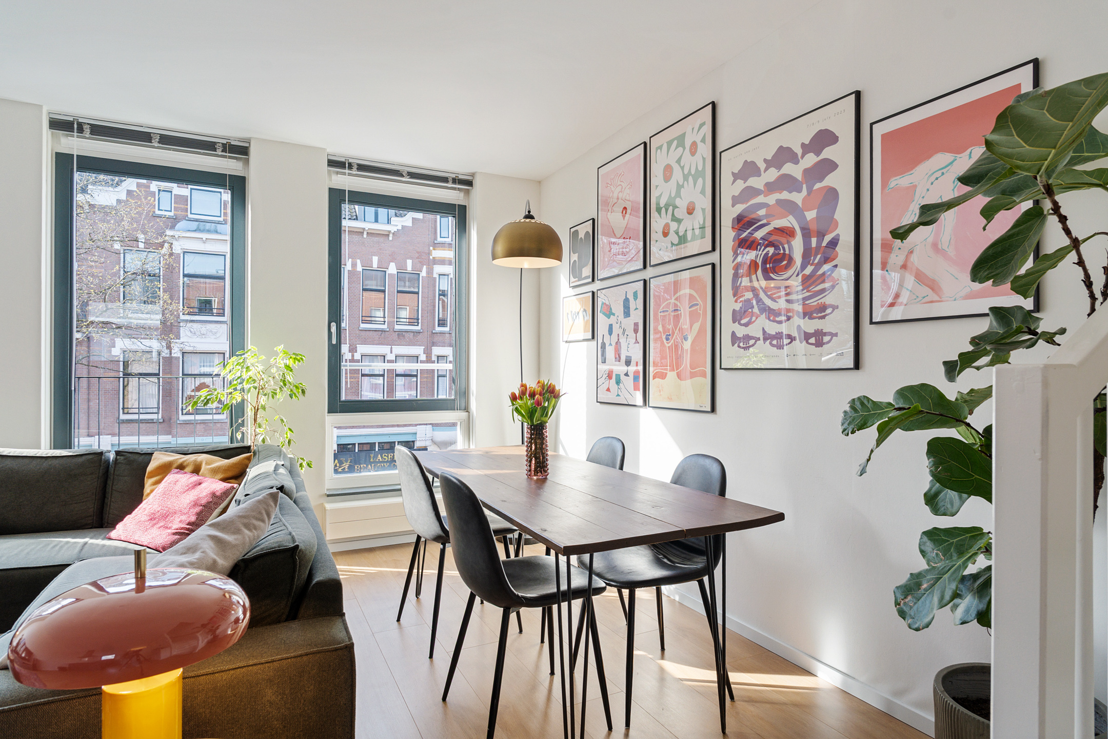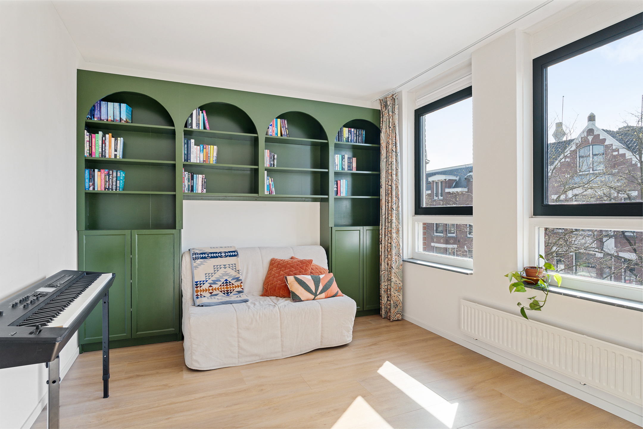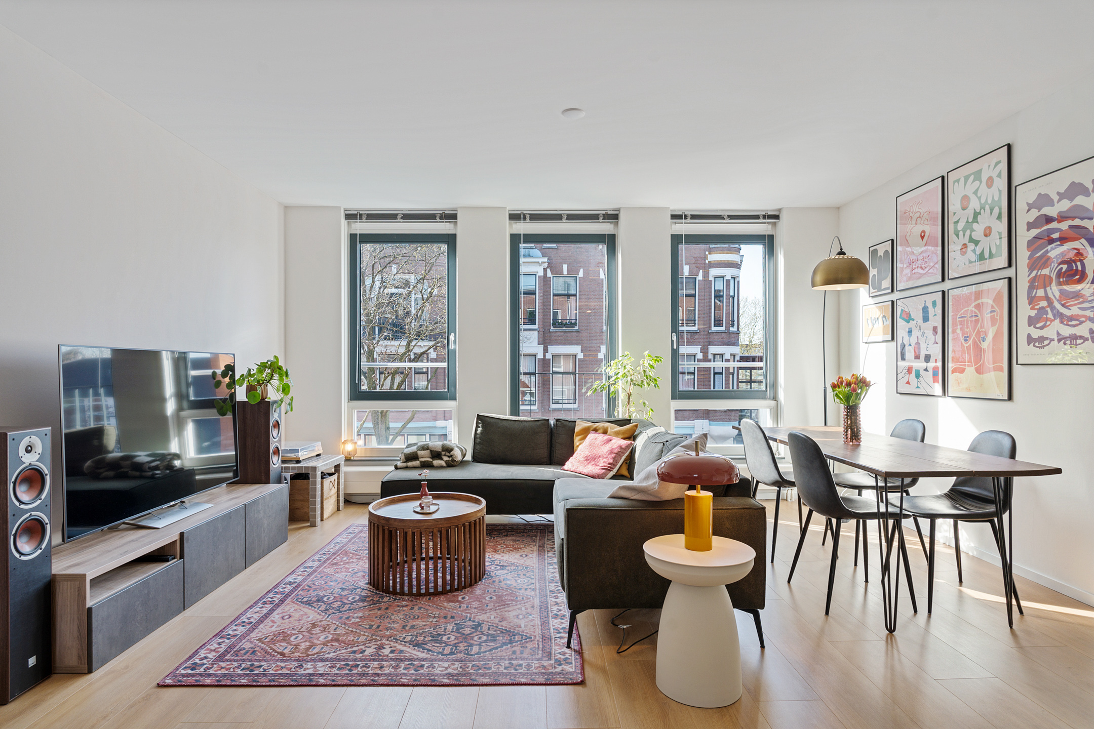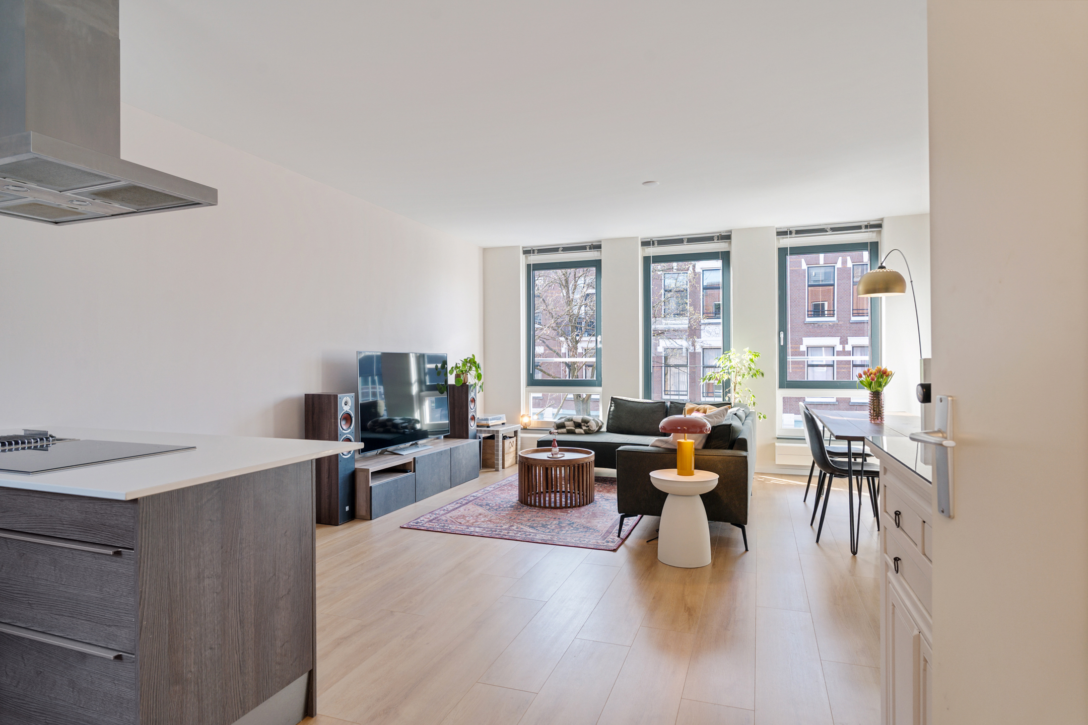 De woonkamer heeft een fijne lichtinval dankzij de Franse balkons en beschikt over een voorraadkast onder de trap en een open keuken met kookeiland, diverse inbouwapparatuur en een natuurstenen werkblad.