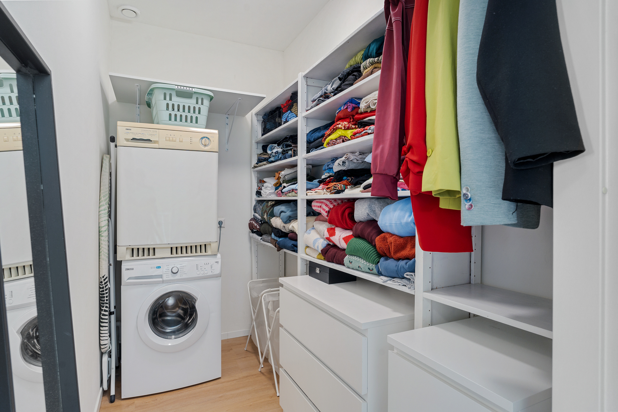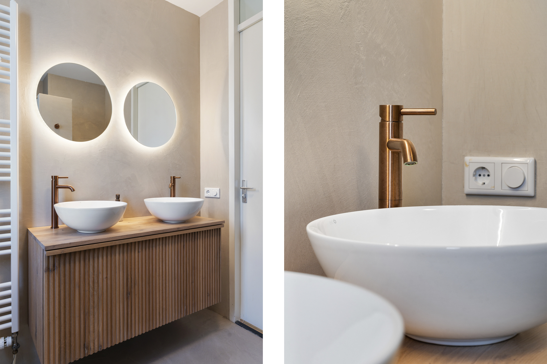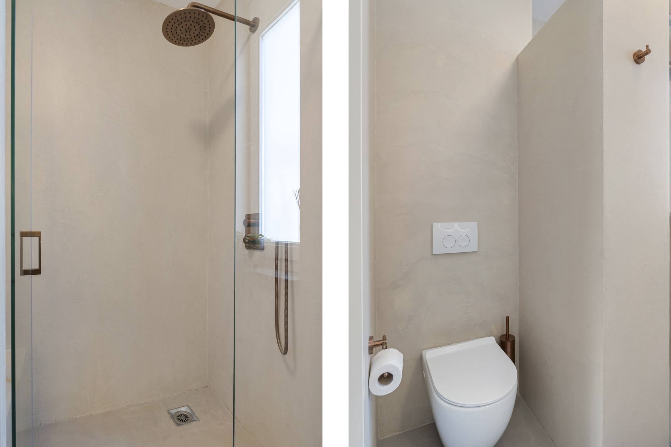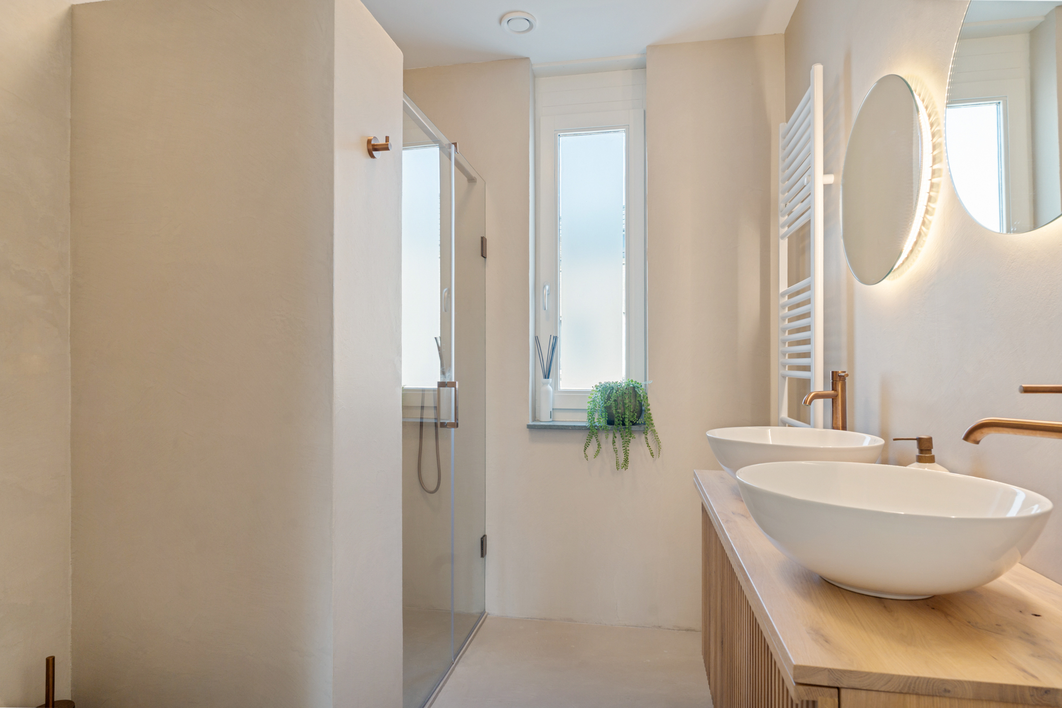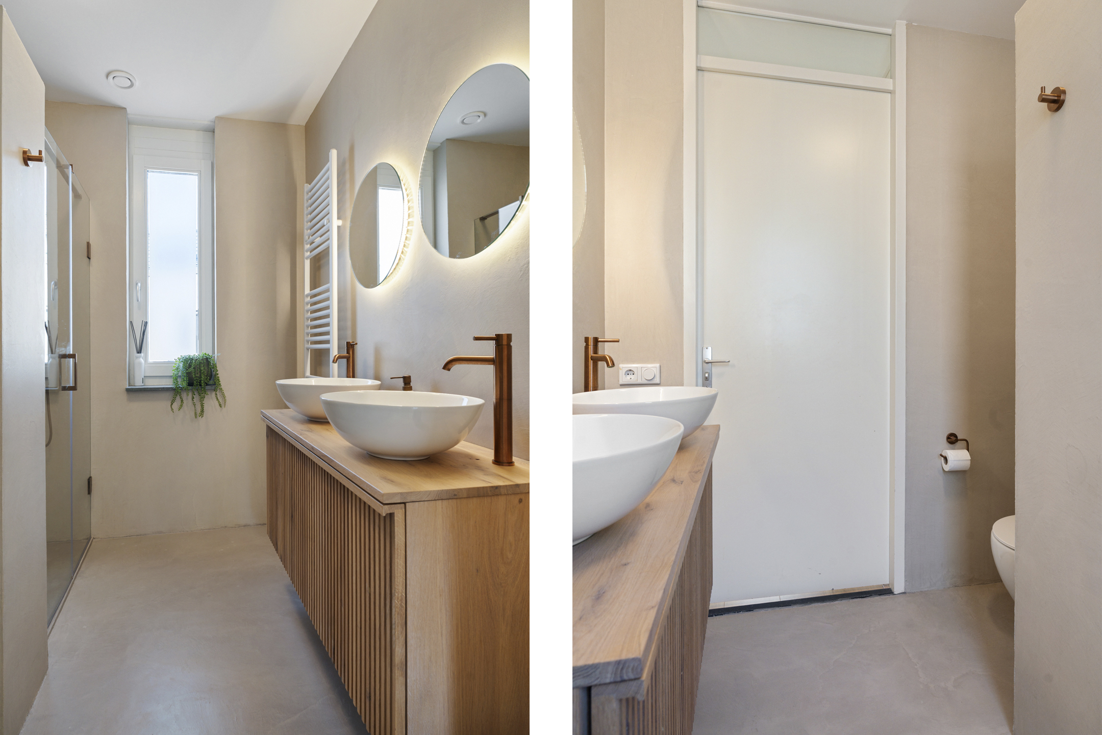 Daarnaast bereik je via de overloop de diepe inloopkast met wasmachineaansluiting. De luxe badkamer, afgewerkt met beton ciré, is compleet ingericht met een inloopdouche, een wastafelmeubel met twee waskommen en een toilet.