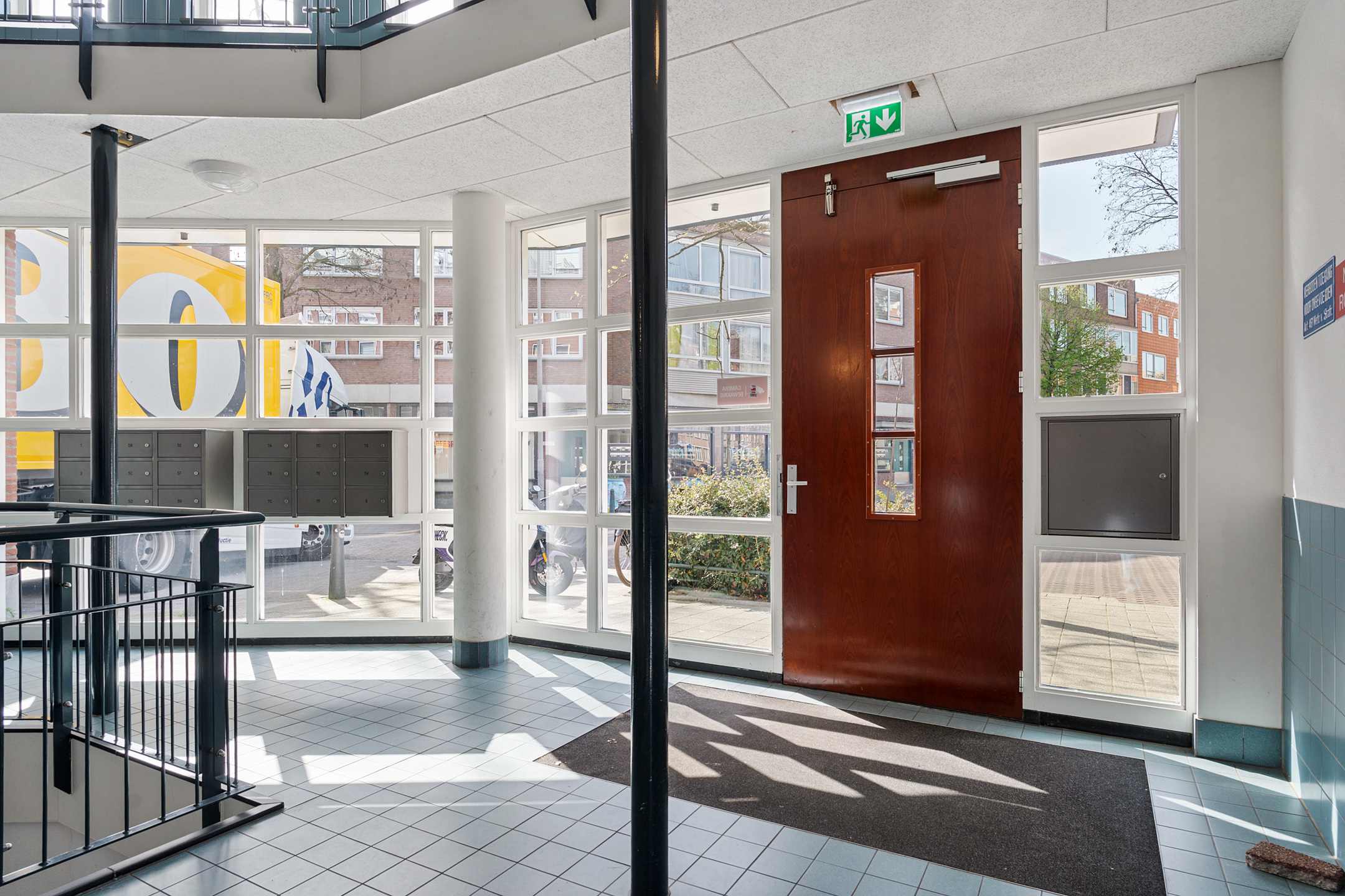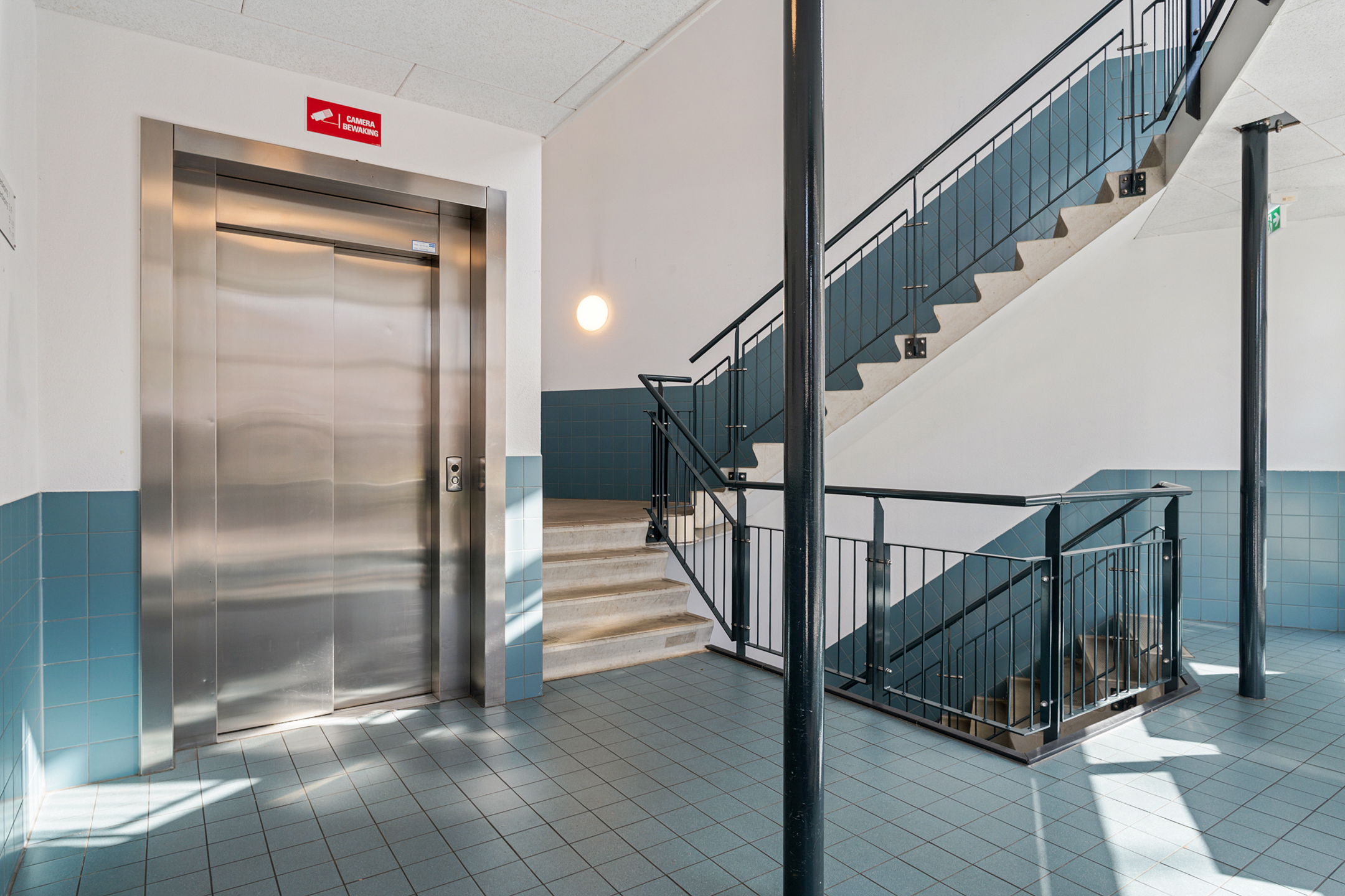 Via de afgesloten entree op de begane grond kom je in de centrale hal met lift, trappenhuis en toegang tot de gezamenlijke berging. De gezamenlijke fietsenberging is apart bereikbaar.