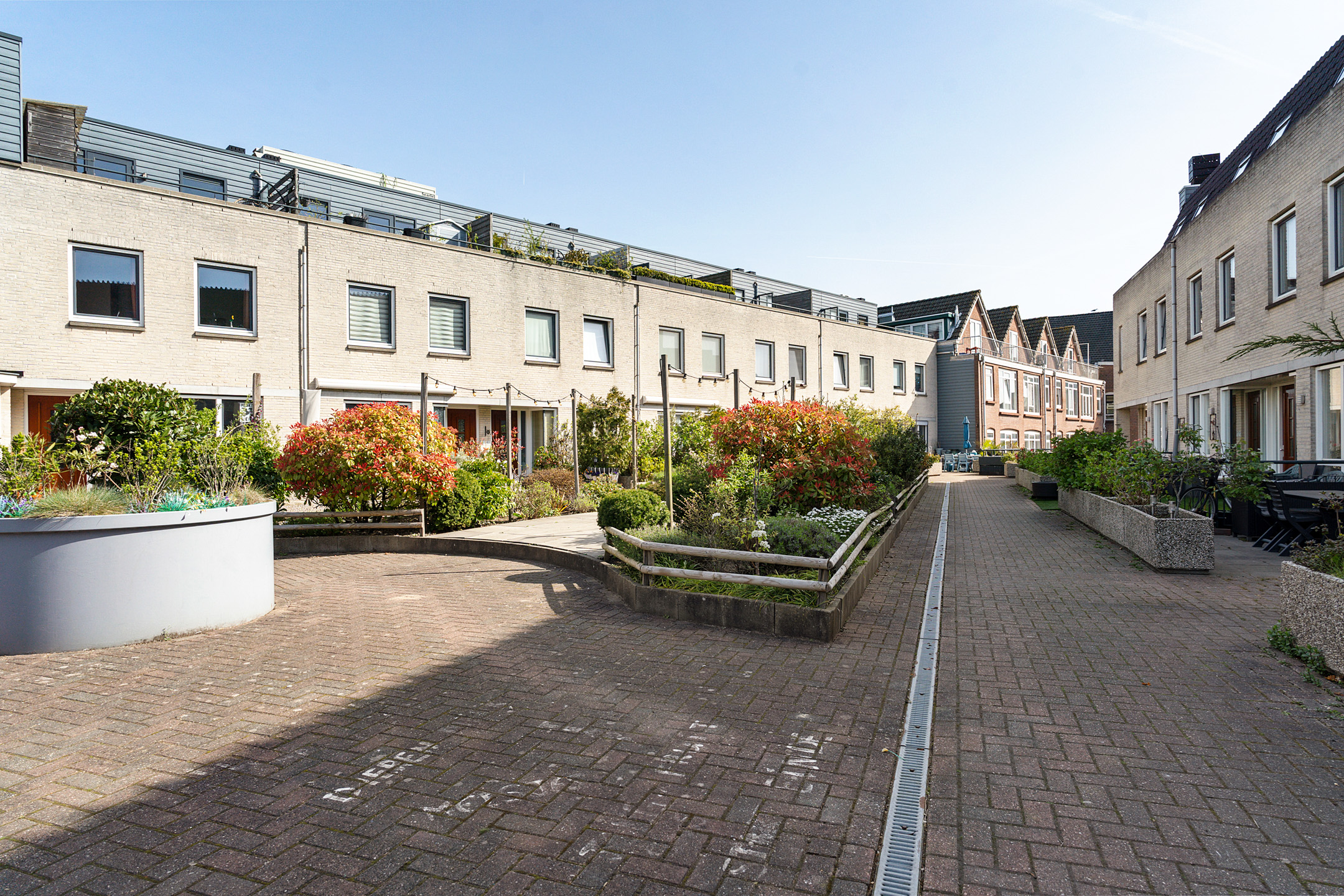 Op de eerste woonlaag bereik je de woning via de bestrate binnentuin met toegangen tot de verschillende appartementen. De indeling is zo opgezet dat iedereen een stukje voortuin heeft wat wel zo prettig en veilig is.
