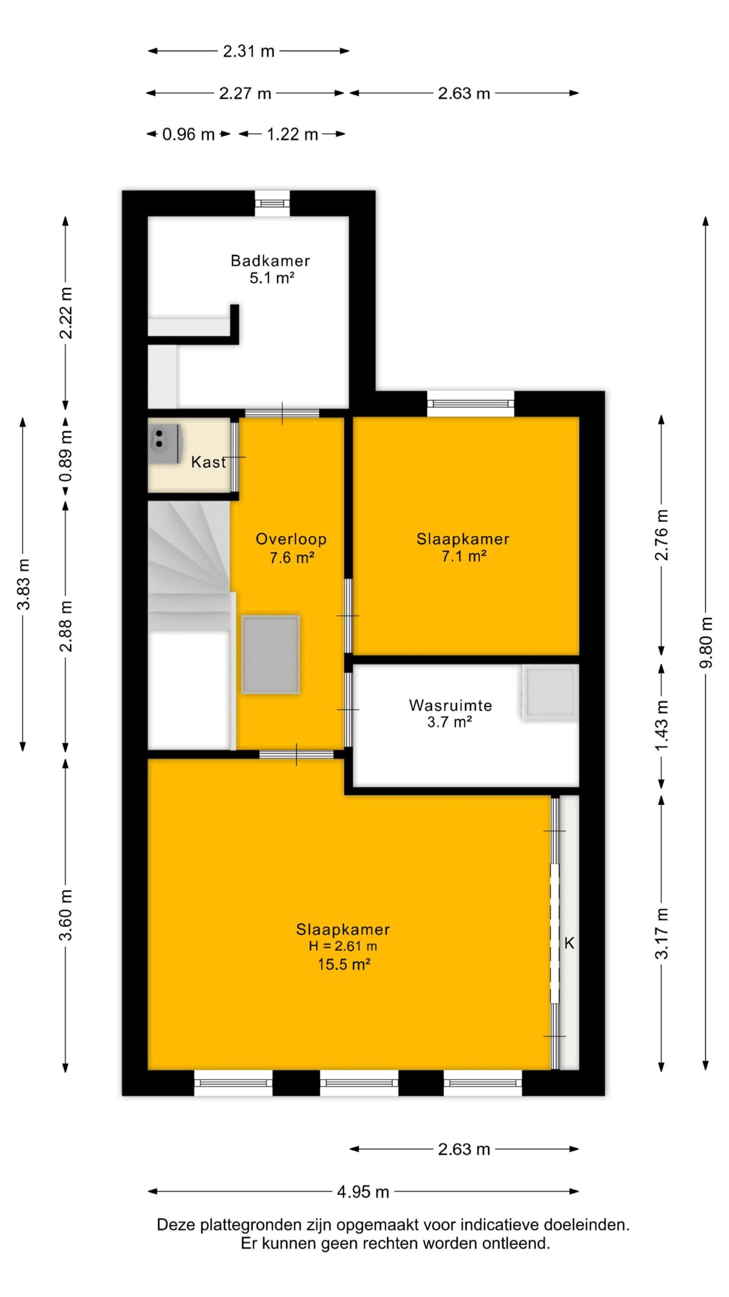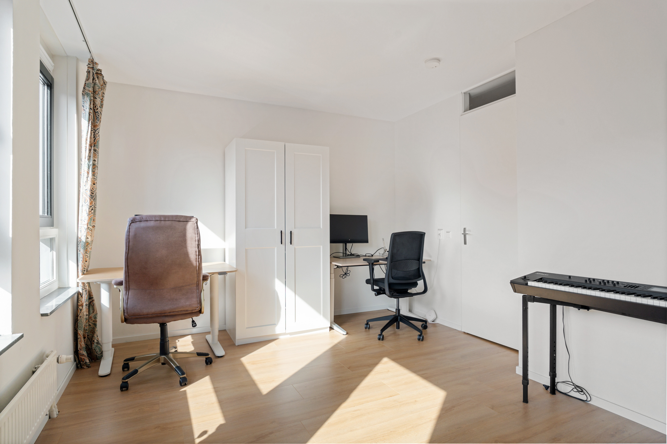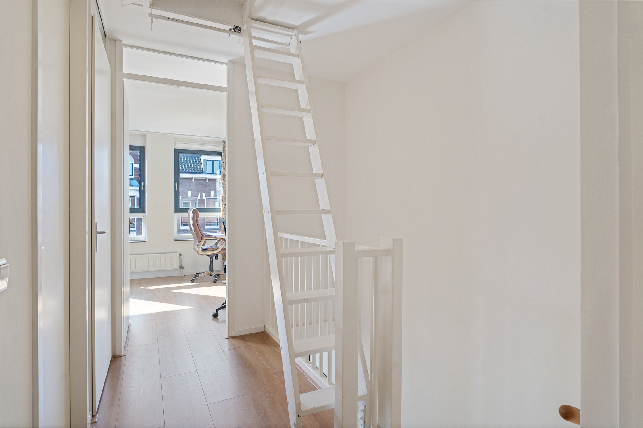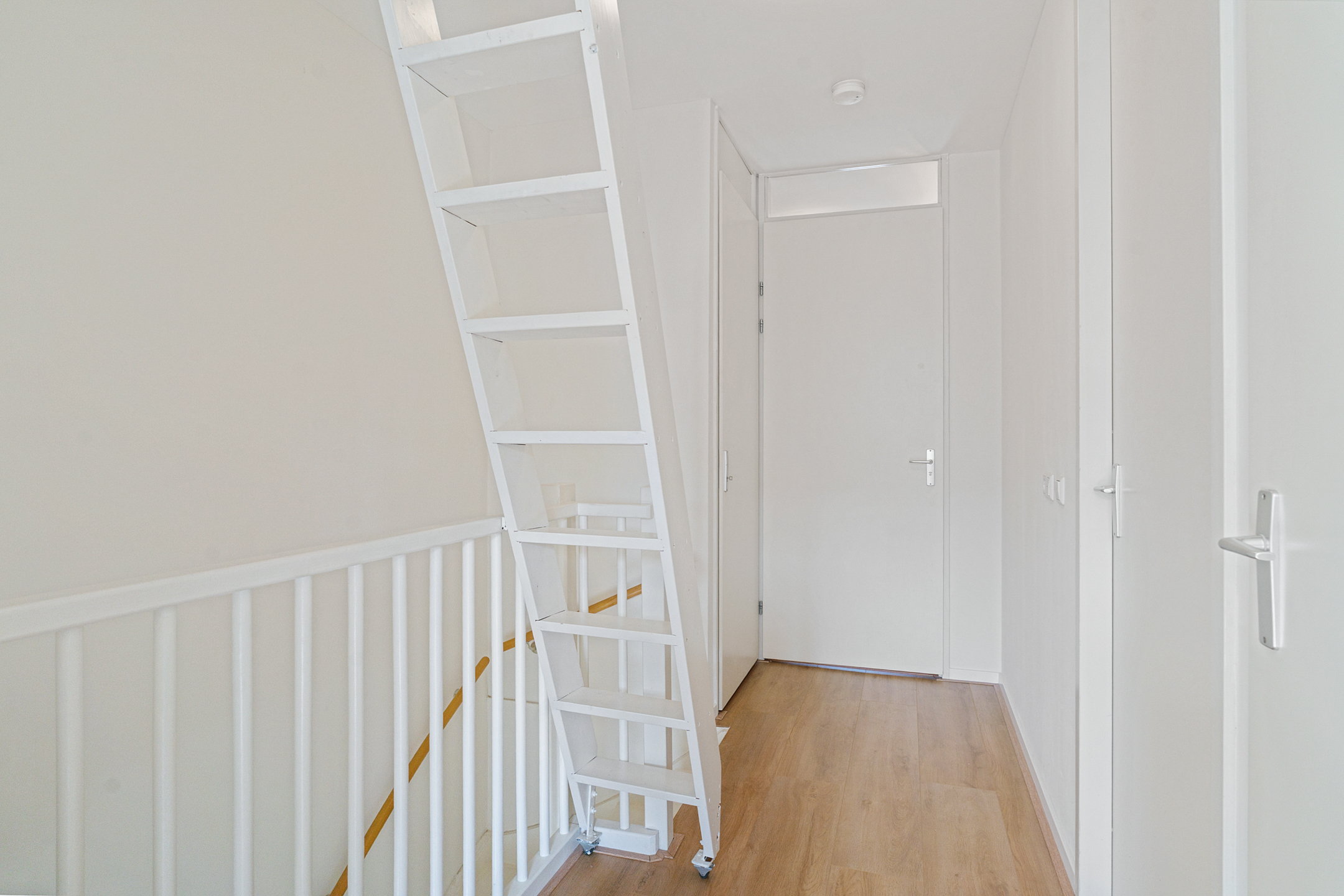 Vanuit de overloop heb je heb je toegang tot alle ruimtes op deze verdieping. Er is een praktische kast met de opstelling van de cv-ketel en de mechanische ventilatiebox. Aan de voorzijde ligt een slaapkamer, terwijl de ruime tweede slaapkamer zich aan de achterzijde bevindt.