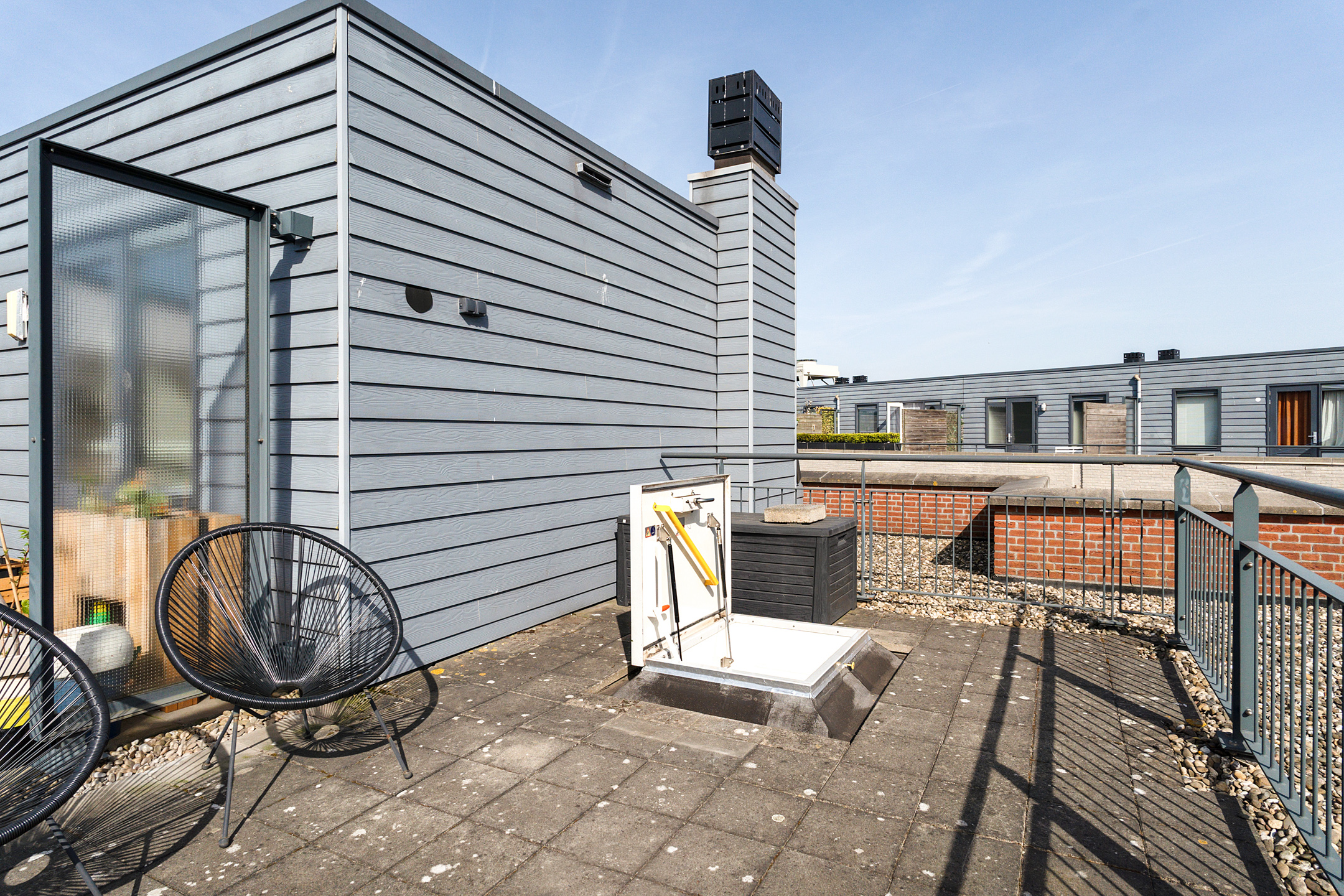 Het dakterras bereik je via een luik op de overloop. Hier geniet je de hele dag van de zon en het uitzicht.