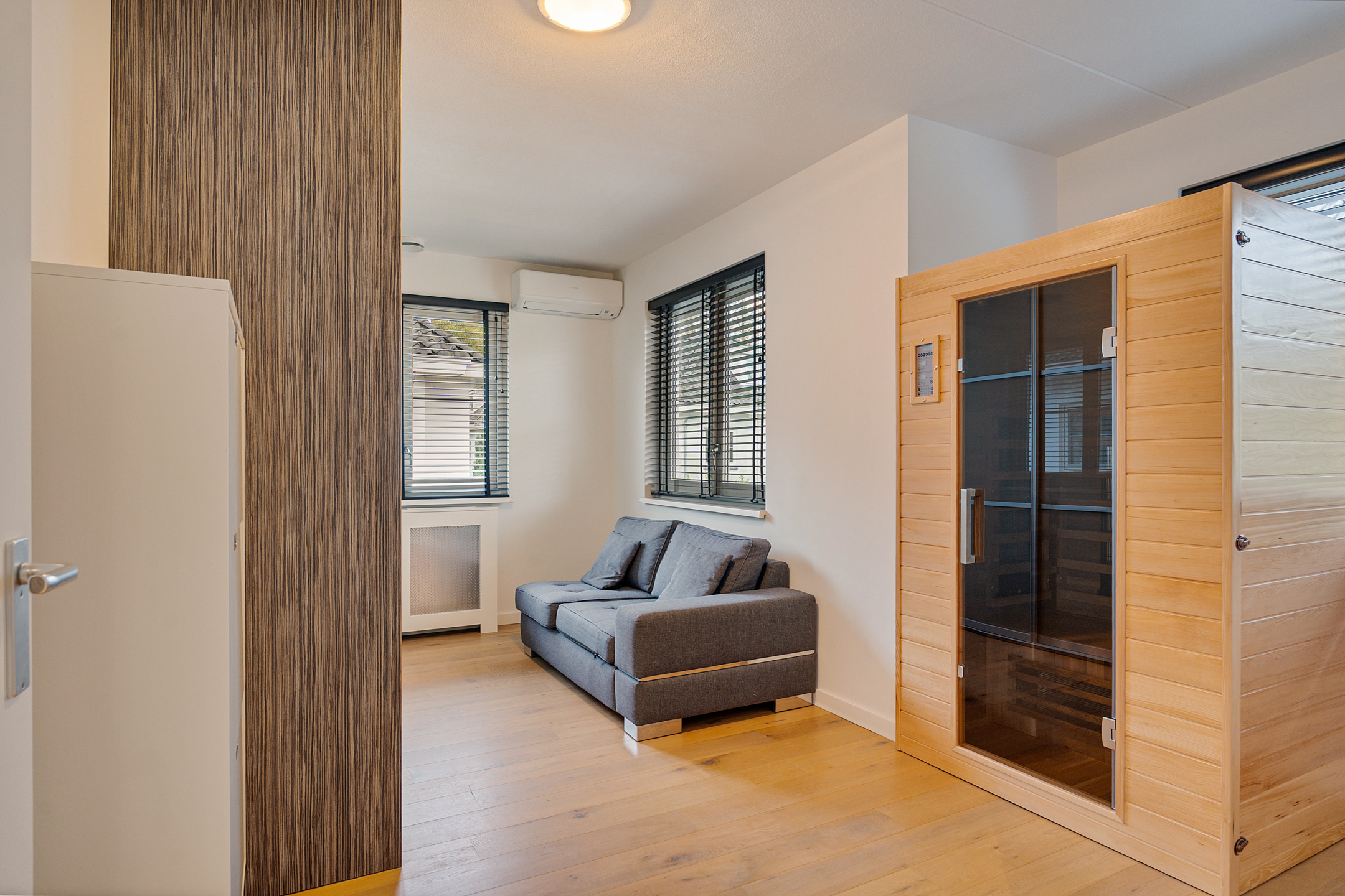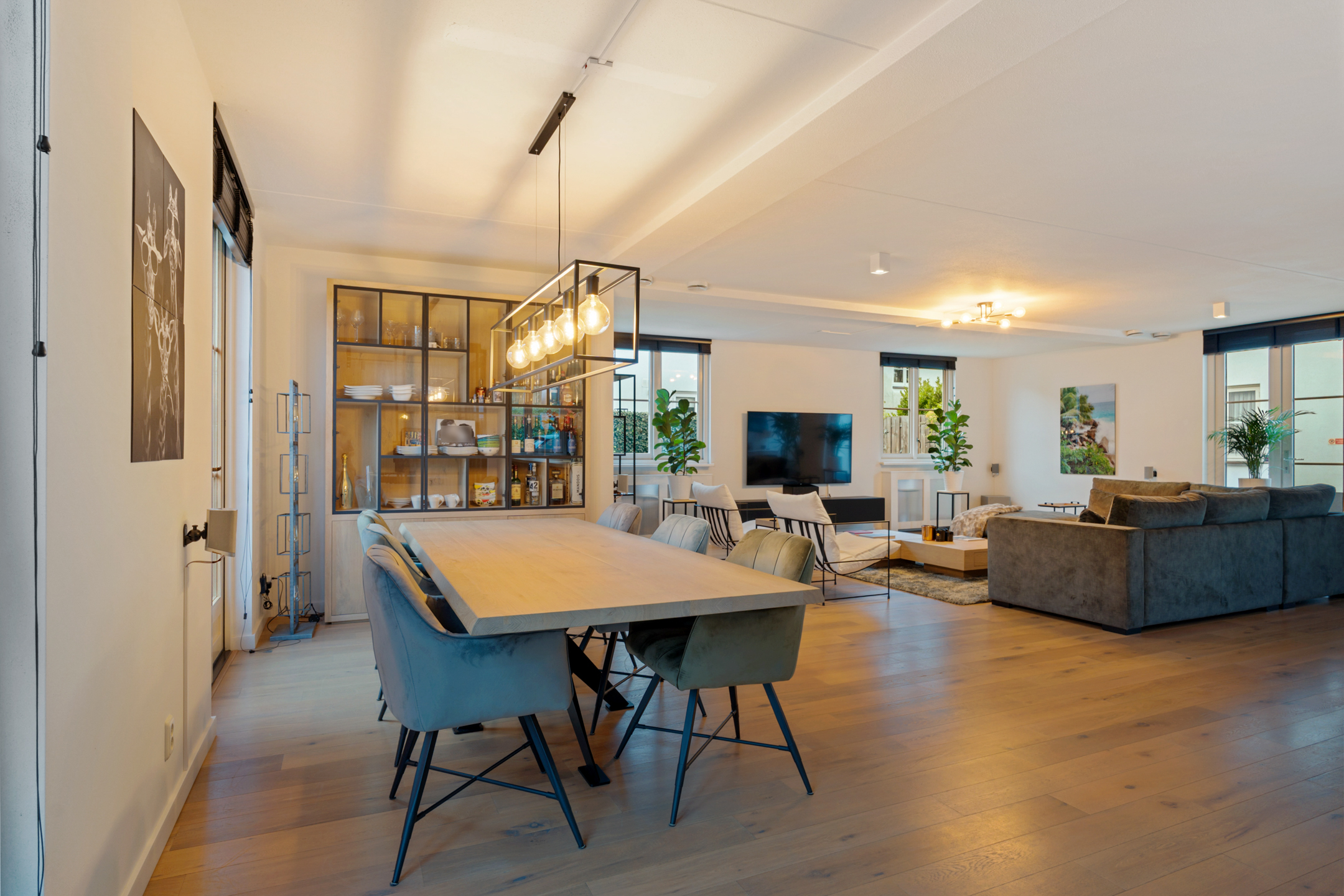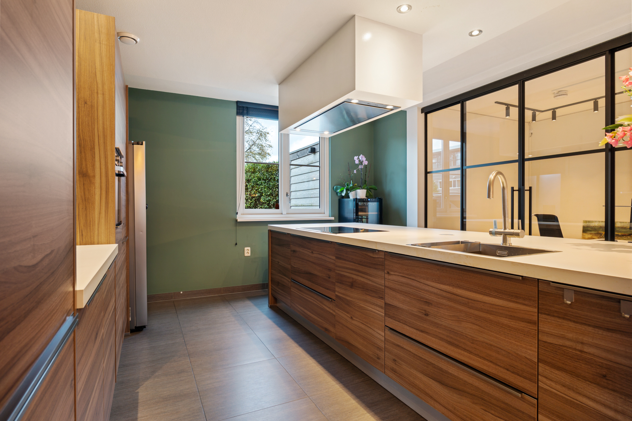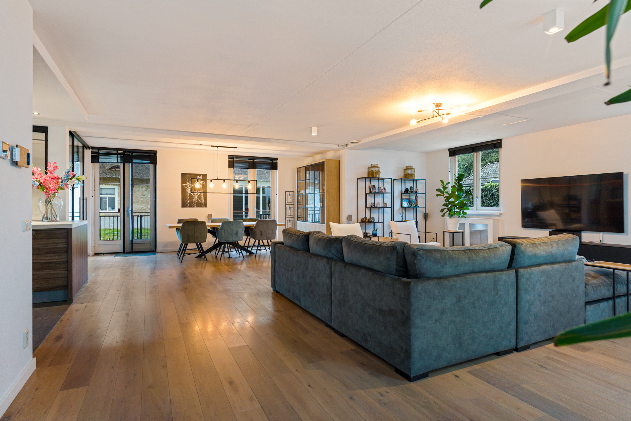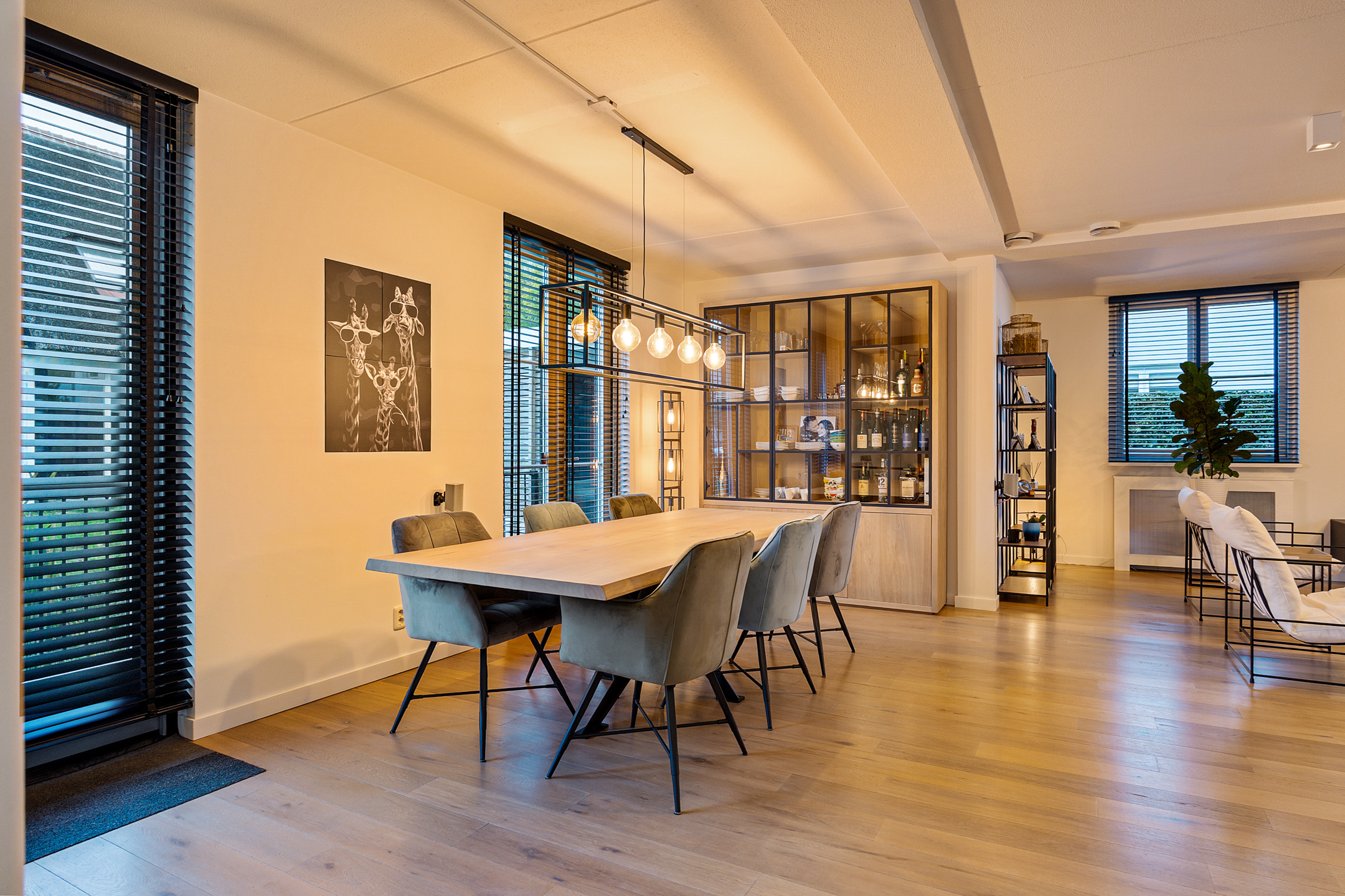 De entree straalt direct klasse uit. Een ruime hal met design zwevend toilet, moderne afwerking en stijlvolle taatsdeuren leidt naar de indrukwekkende living van circa 100 m². De woonkamer is uitgebouwd, heeft grote raampartijen en een prachtig zicht op de tuin. De open woonkeuken is voorzien van een kookeiland en uitgerust met alle denkbare inbouwapparatuur, waaronder een nieuwe vaatwasser, combimagnetron en inductiekookplaat. Dankzij de glazen aluminium wanden is er een aparte, lichte ruimte gecreëerd die nu in gebruik is als kantoor, maar ook perfect geschikt is als speelkamer of tv-kamer.