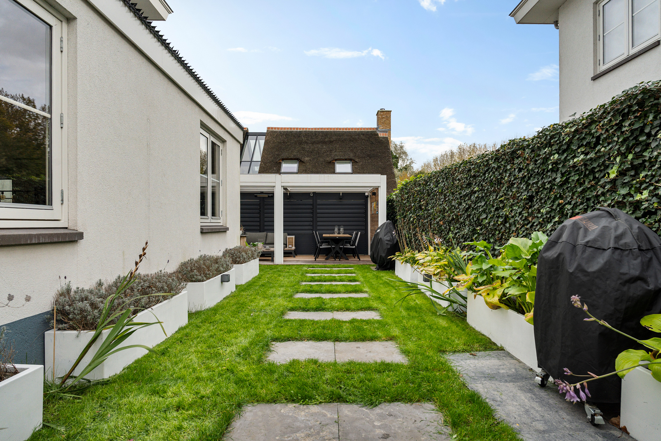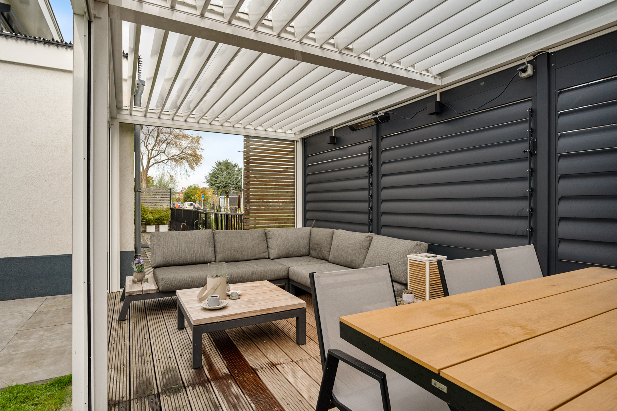 + Prachtige tuin met luxe lamellenoverkapping en twee parkeerplaatsen op eigen terrein