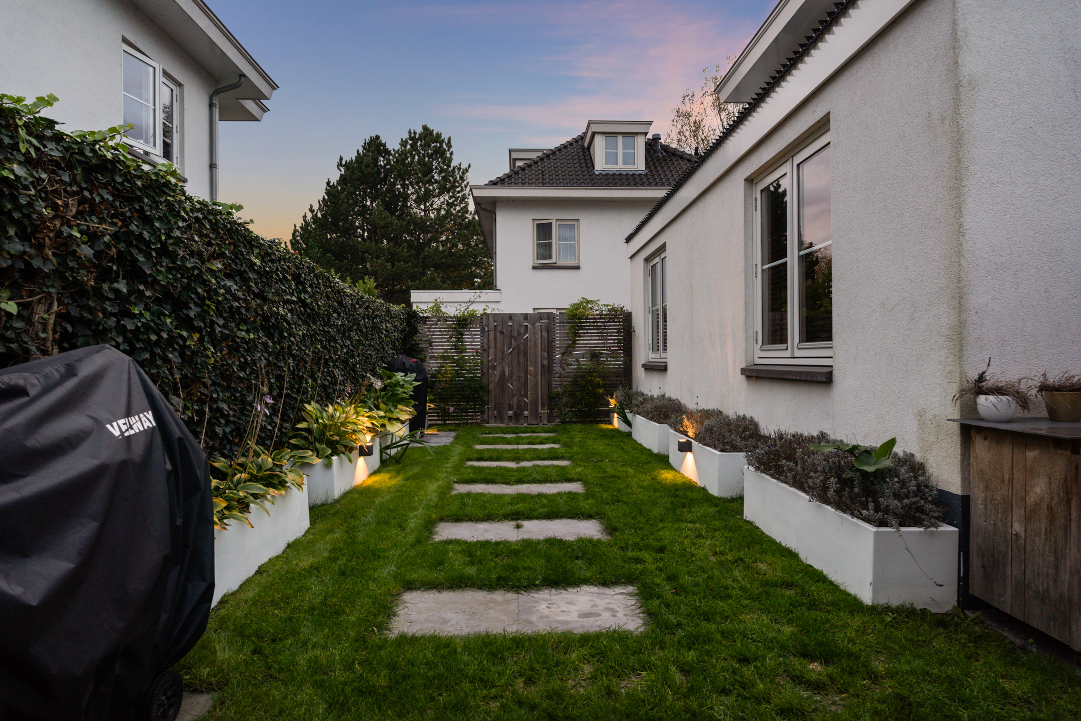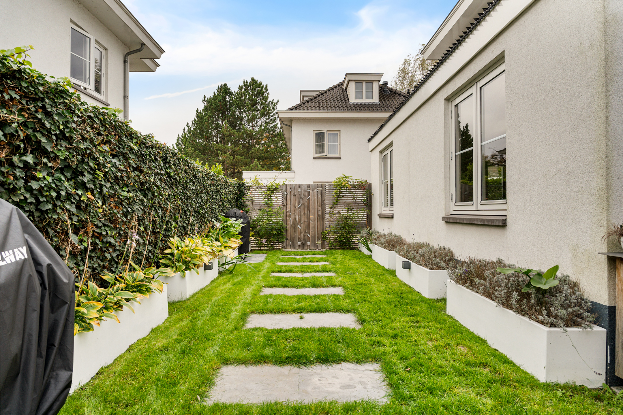 De tuin rondom de woning is met zorg aangelegd en biedt meerdere terrassen en een prachtig houten deck aan de zij- en voorkant. De hoofdtuin is voorzien van een luxe lamellenoverkapping waar je heerlijk kunt ontspannen en genieten van de middag- en avondzon. Daarnaast is er een berging met twee ingangen en ruimte voor het parkeren van twee auto’s op eigen terrein.