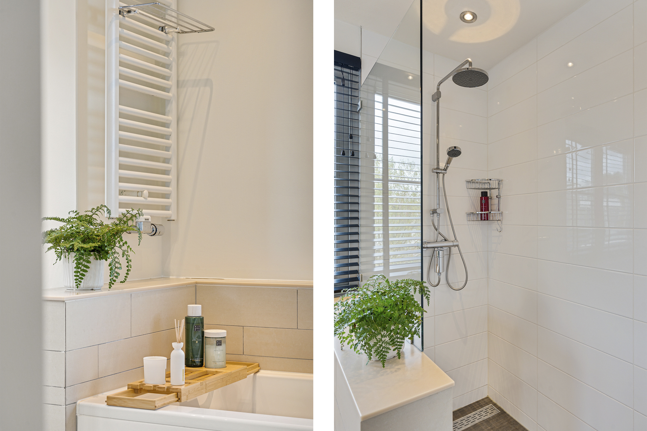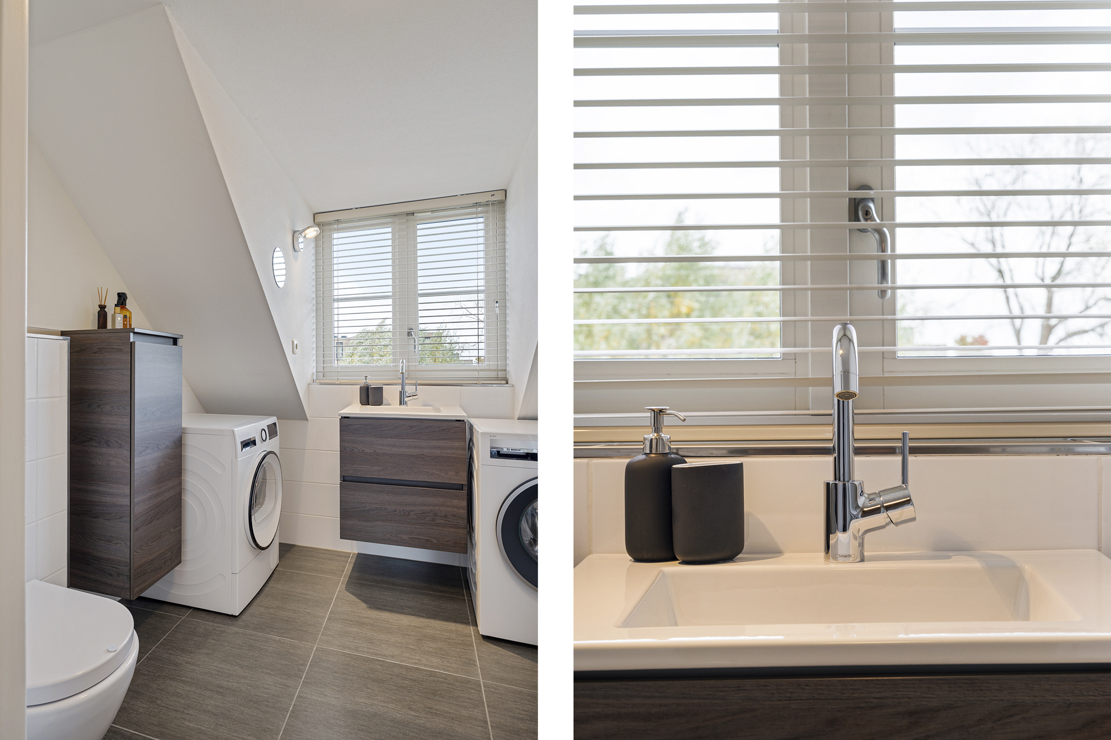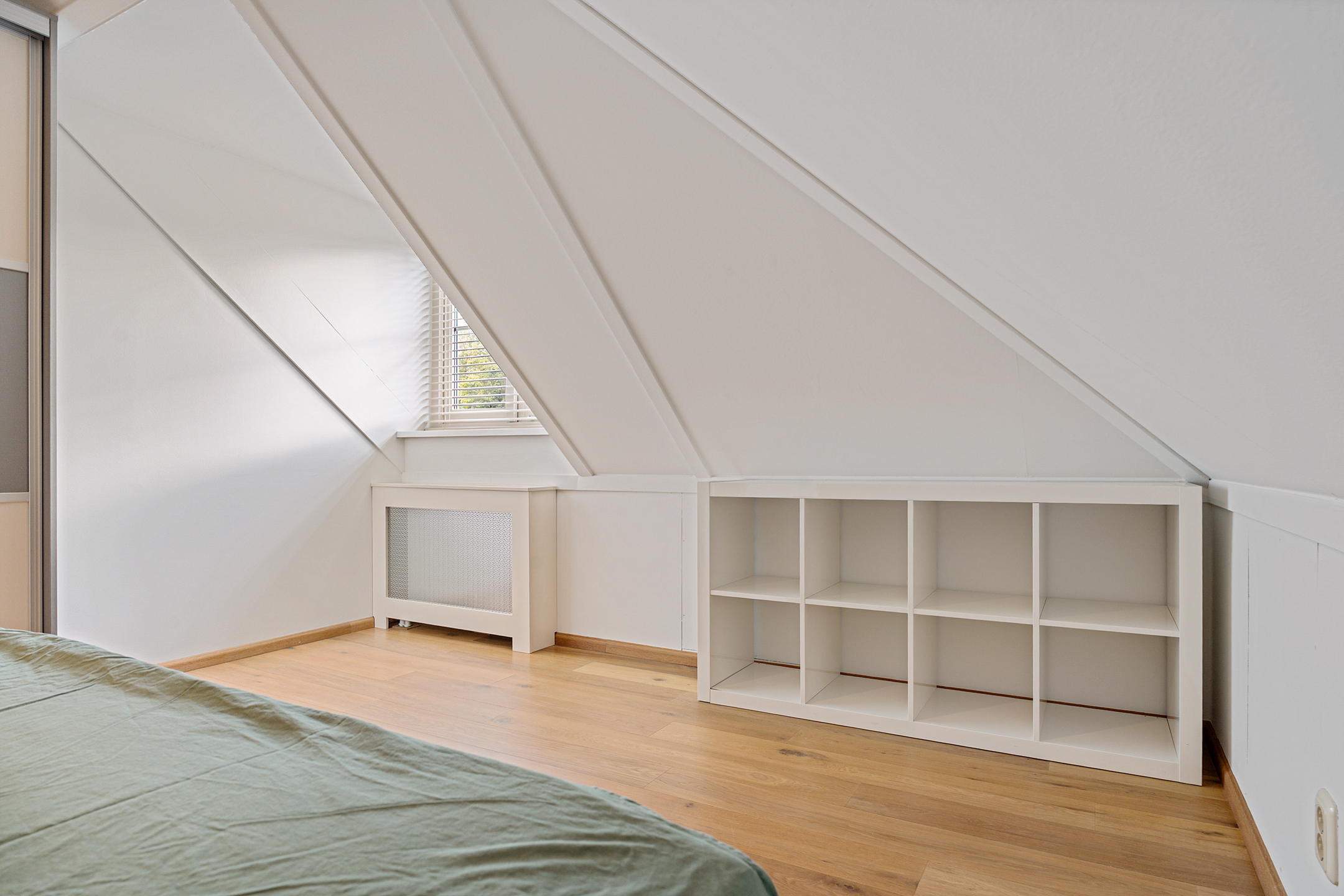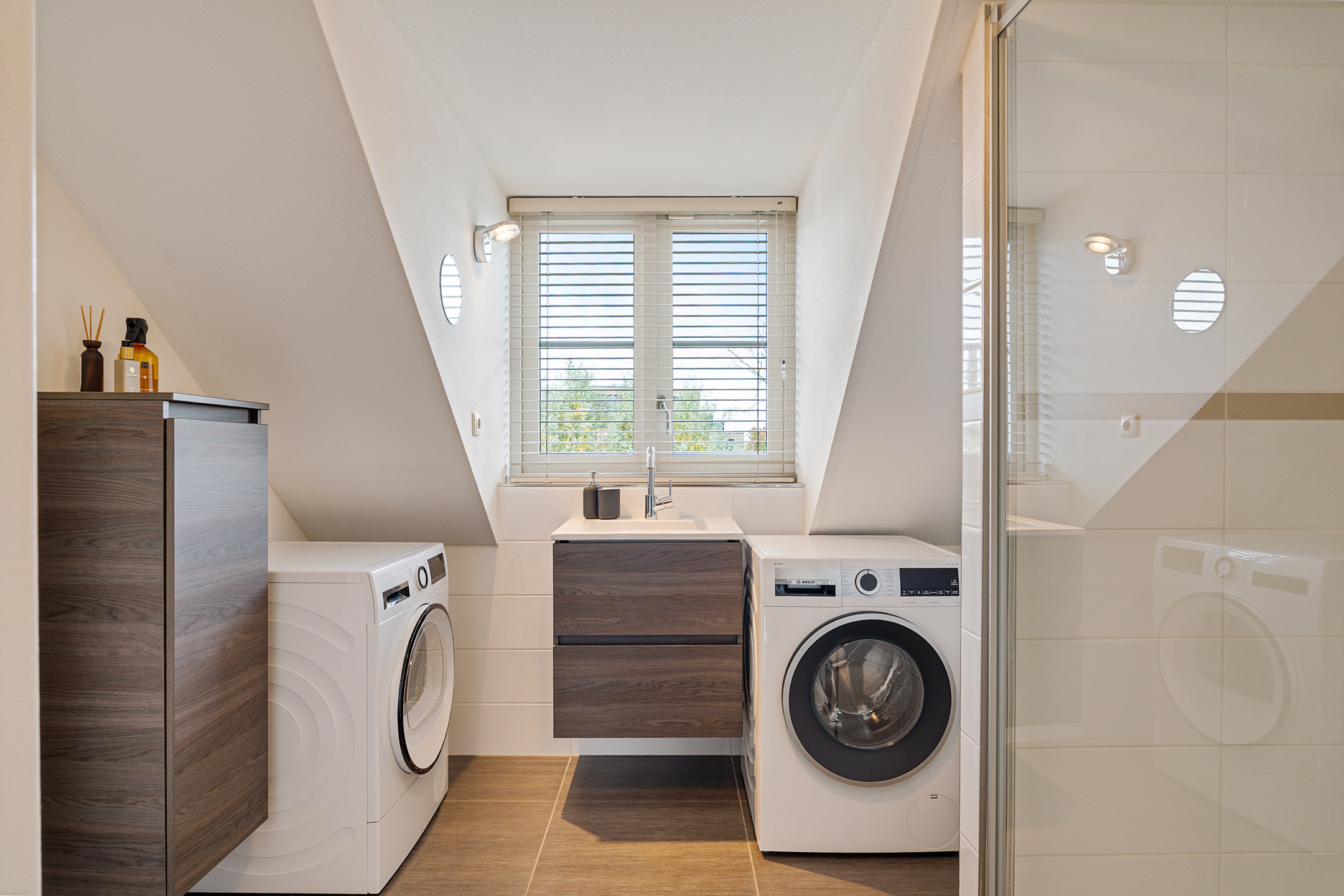 Hier bevinden zich nog twee royale slaapkamers met dakkapellen, diverse bergruimten en een tweede moderne badkamer met douche, wastafel, zwevend toilet en aansluitingen voor wasmachine en droger.