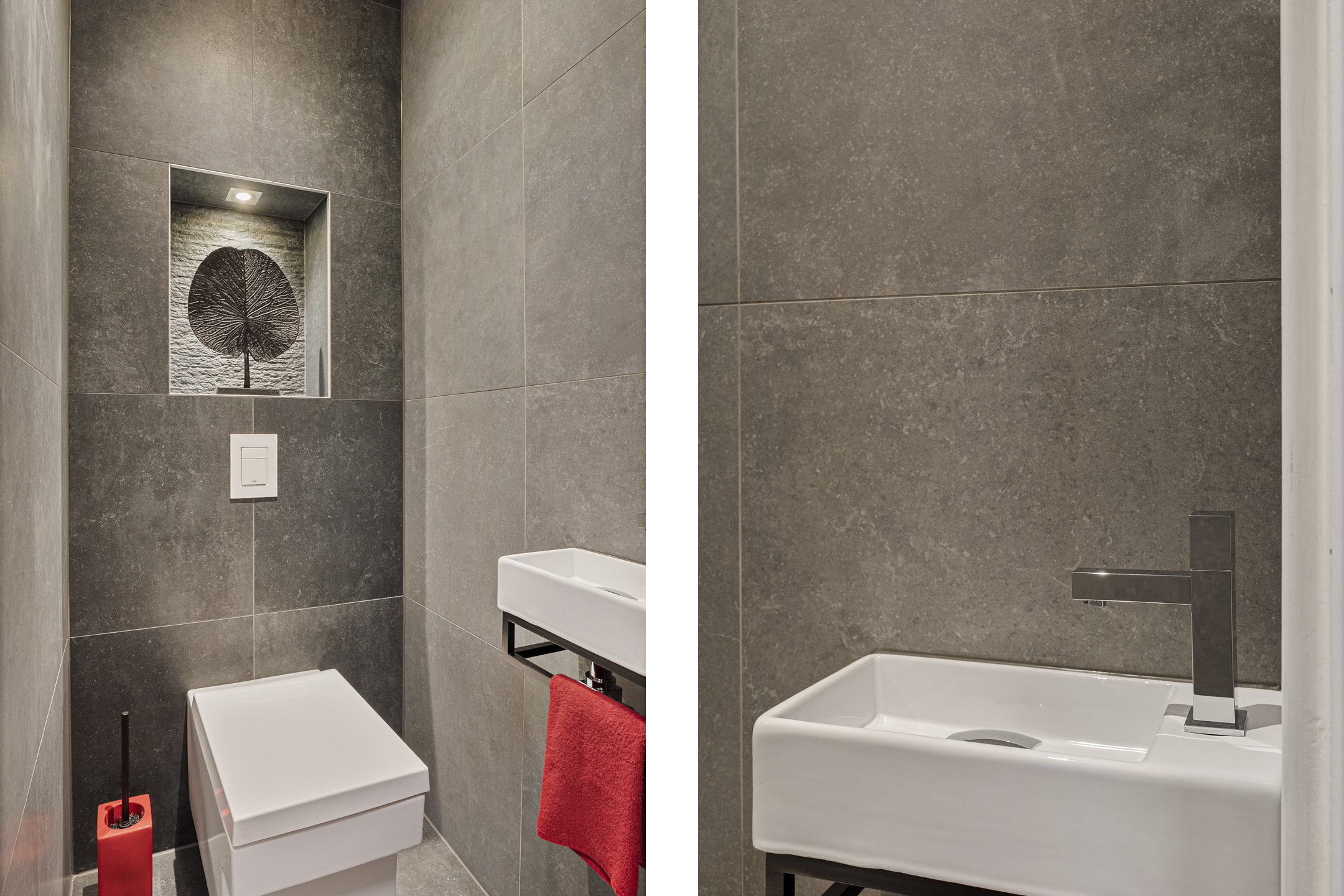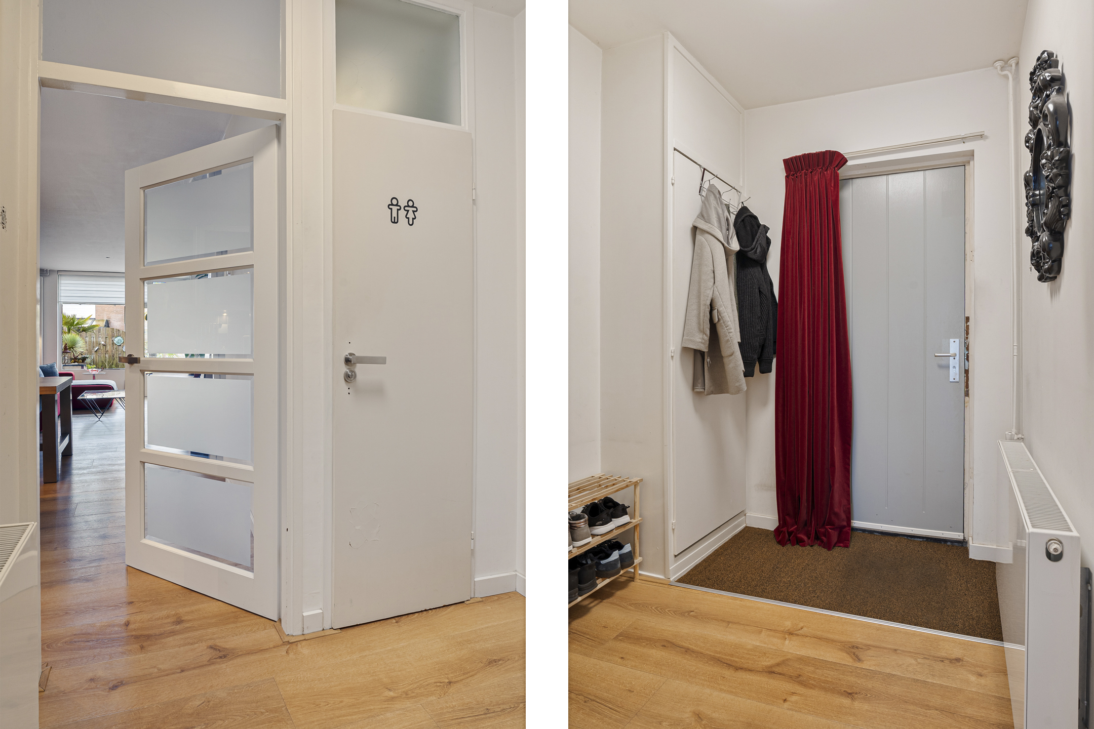 Bij aankomst word je al welkom geheten door de verzorgde voortuin met sierbestrating. De overdekt entree leidt naar een ruime hal met de meterkast en een stijlvolle toiletruimte (2023), voorzien van luxe hangend toilet, fonteintje en betegelde nis met verlichting.