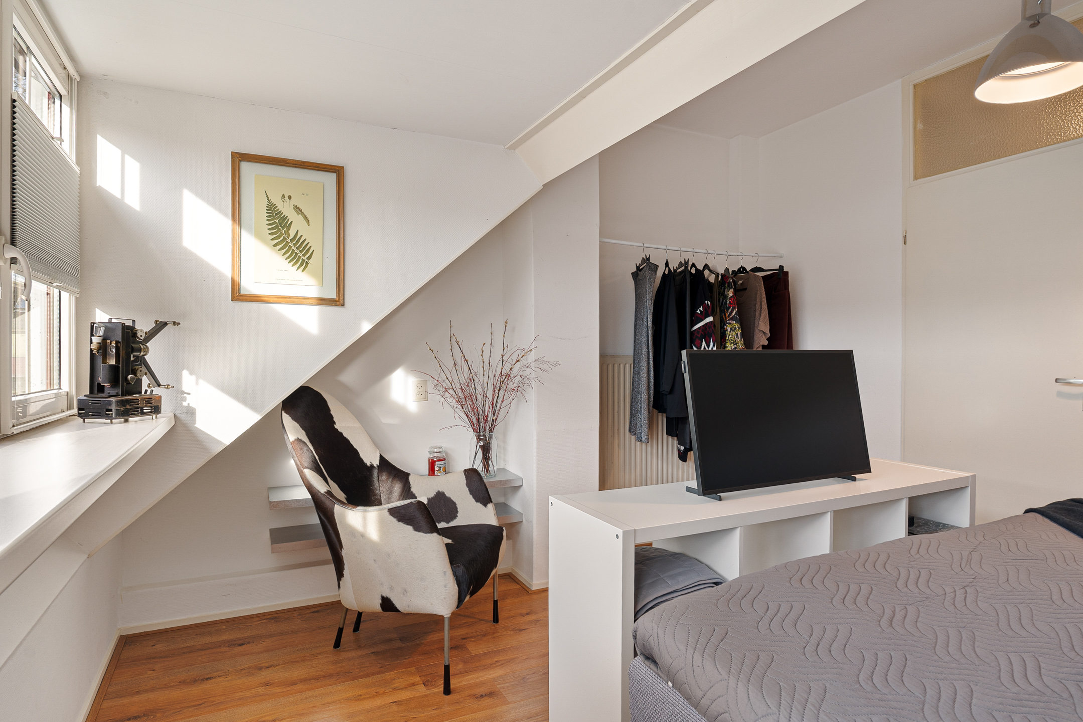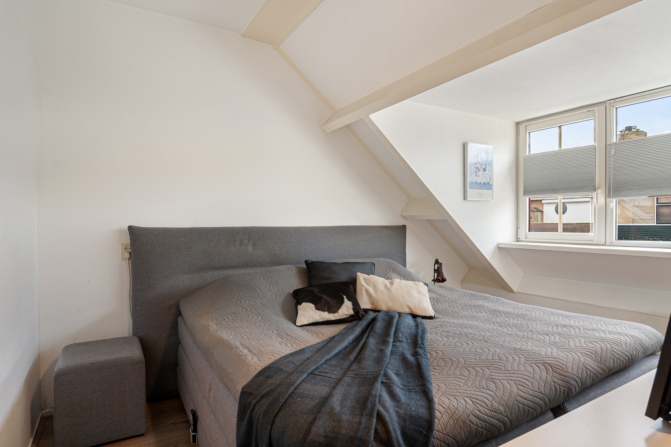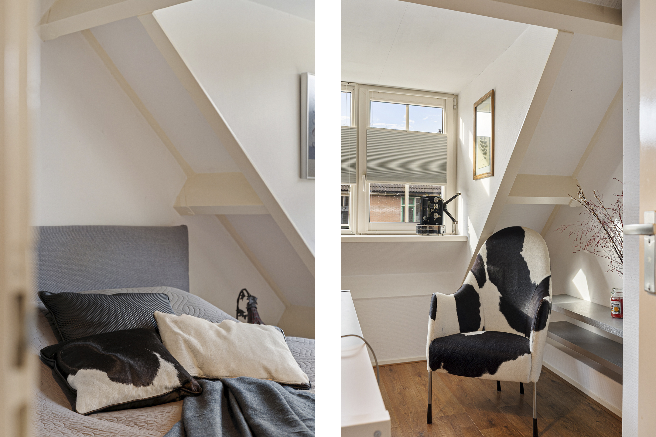Ook de slaapkamer aan de achterzijde beschikt over een laminaatvloer en heeft daarnaast een fraaie, kunststof dakkapel (2008), met ramen met speelse vakverdeling en bijpassende inzethorren.