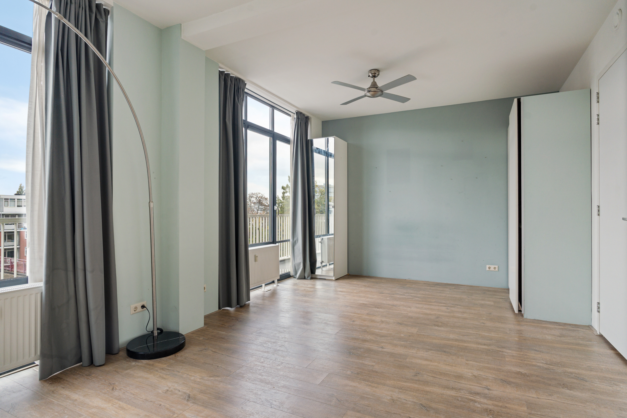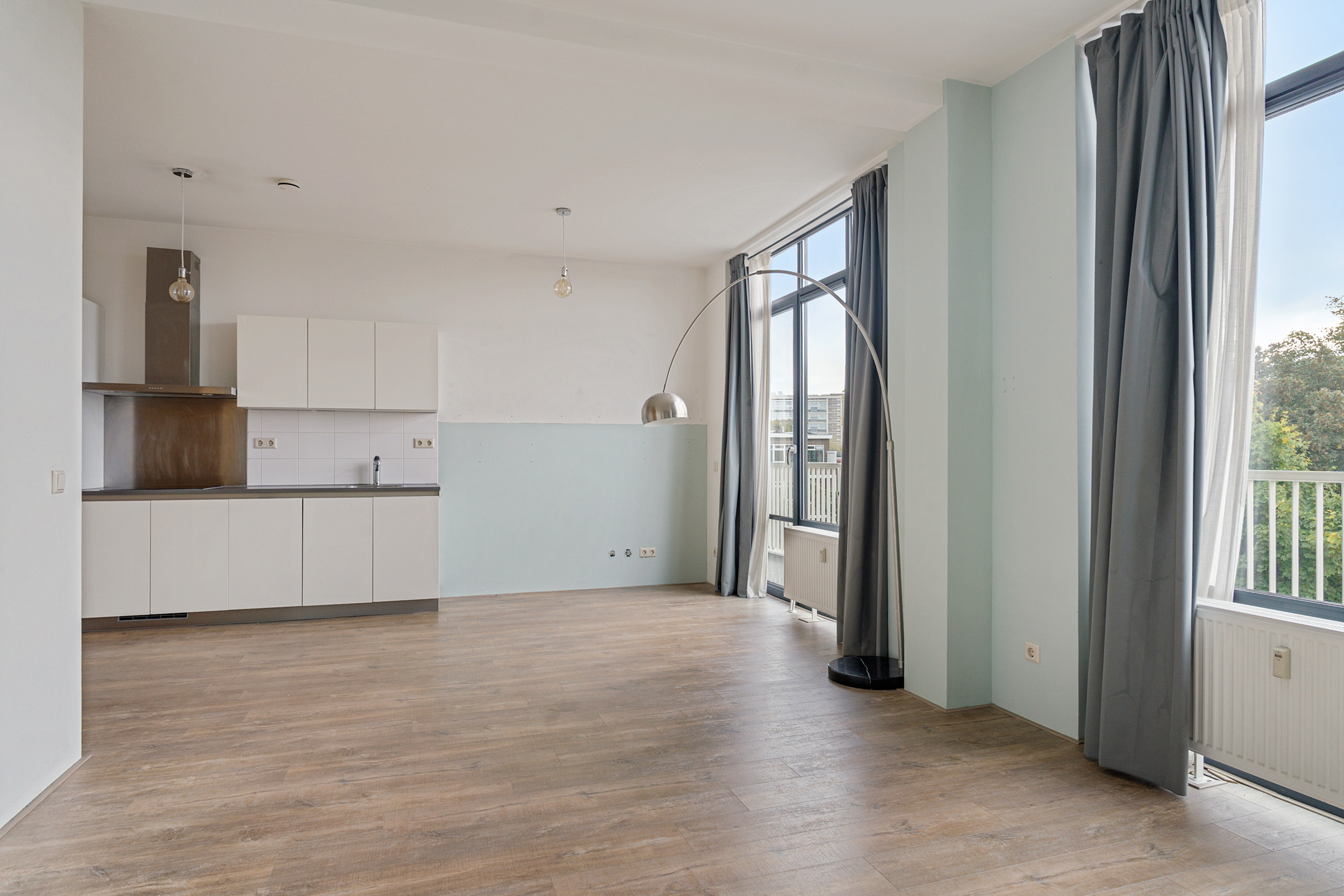 De woonkamer en slaapruimte vormen één open geheel en zijn prettig ingedeeld. Grote raampartijen zorgen voor veel daglicht en geven de ruimte een uitnodigende uitstraling. De nette laminaatvloer en strakke afwerking zorgen voor een moderne look. Vanuit de woonkamer stap je het zonnige balkon op, gelegen op het zuidwesten – perfect om in de middag en avond van de zon te genieten.