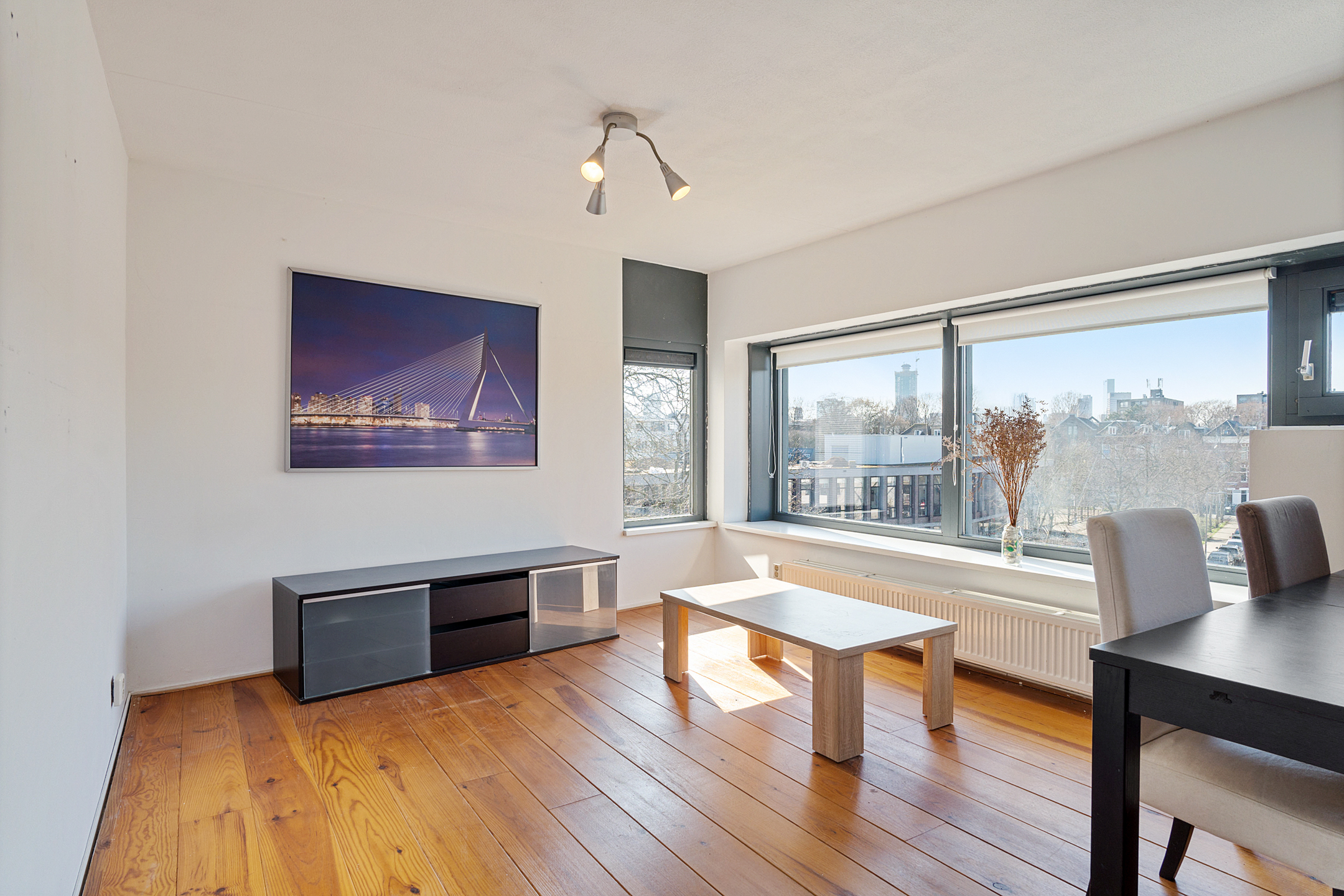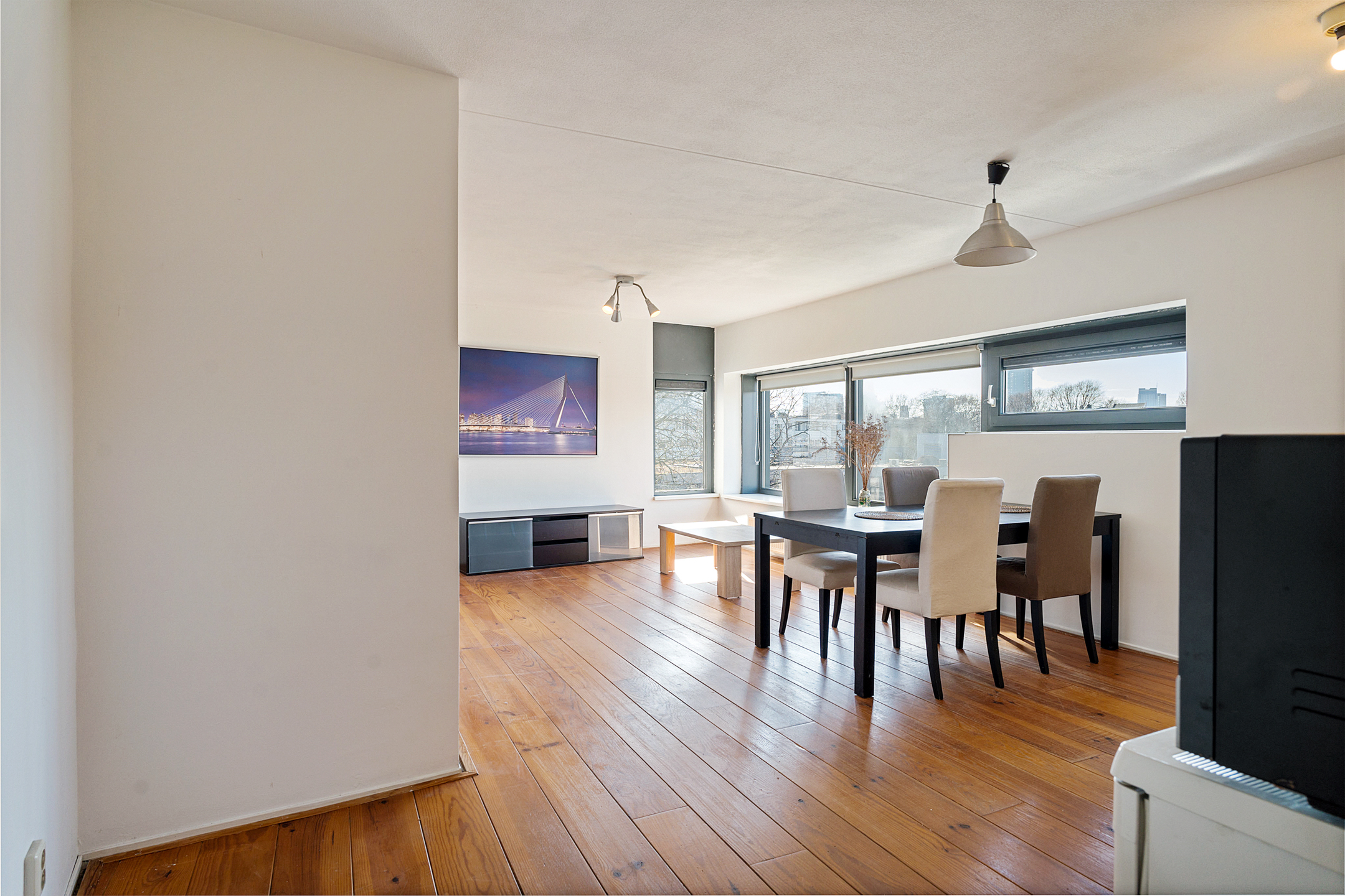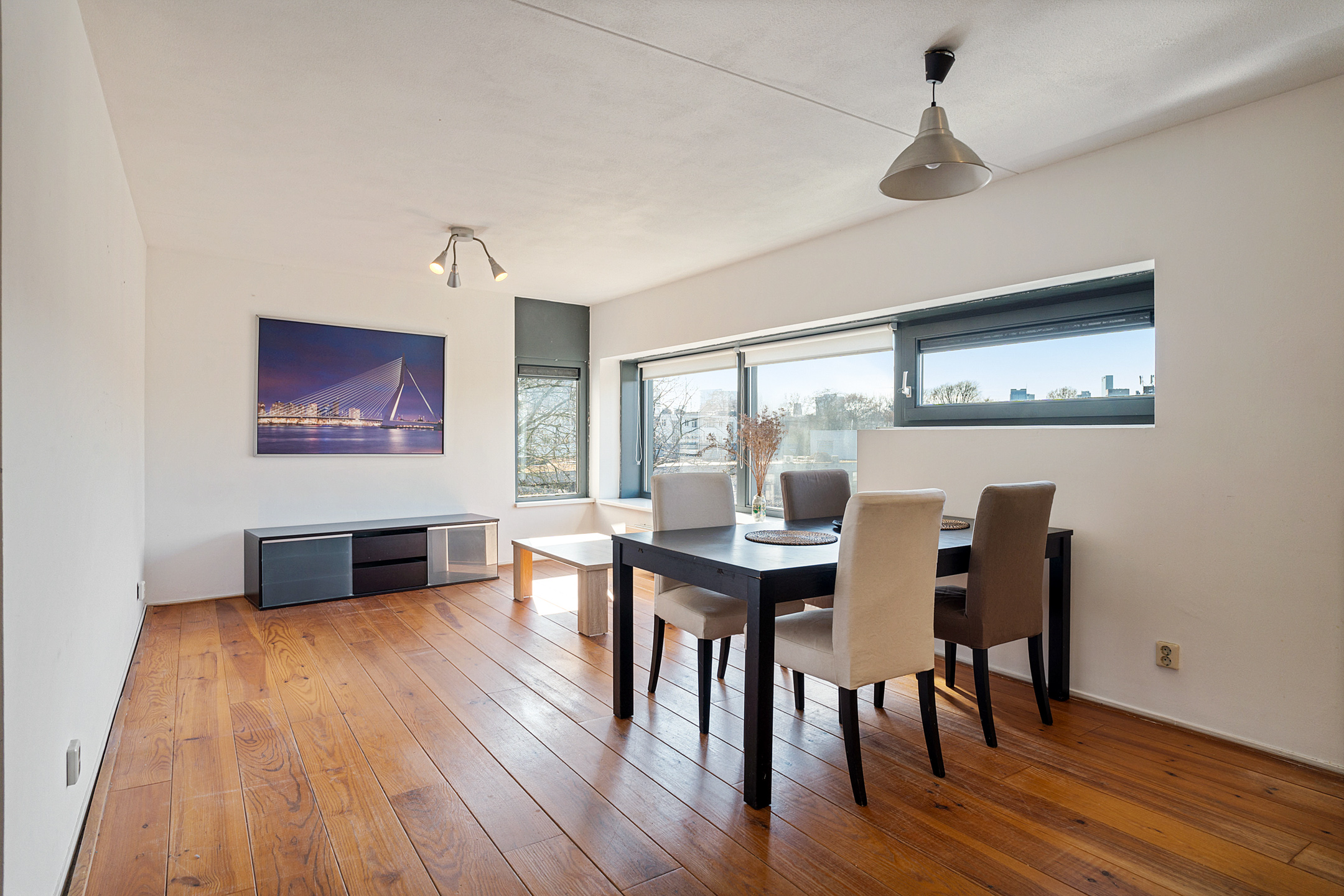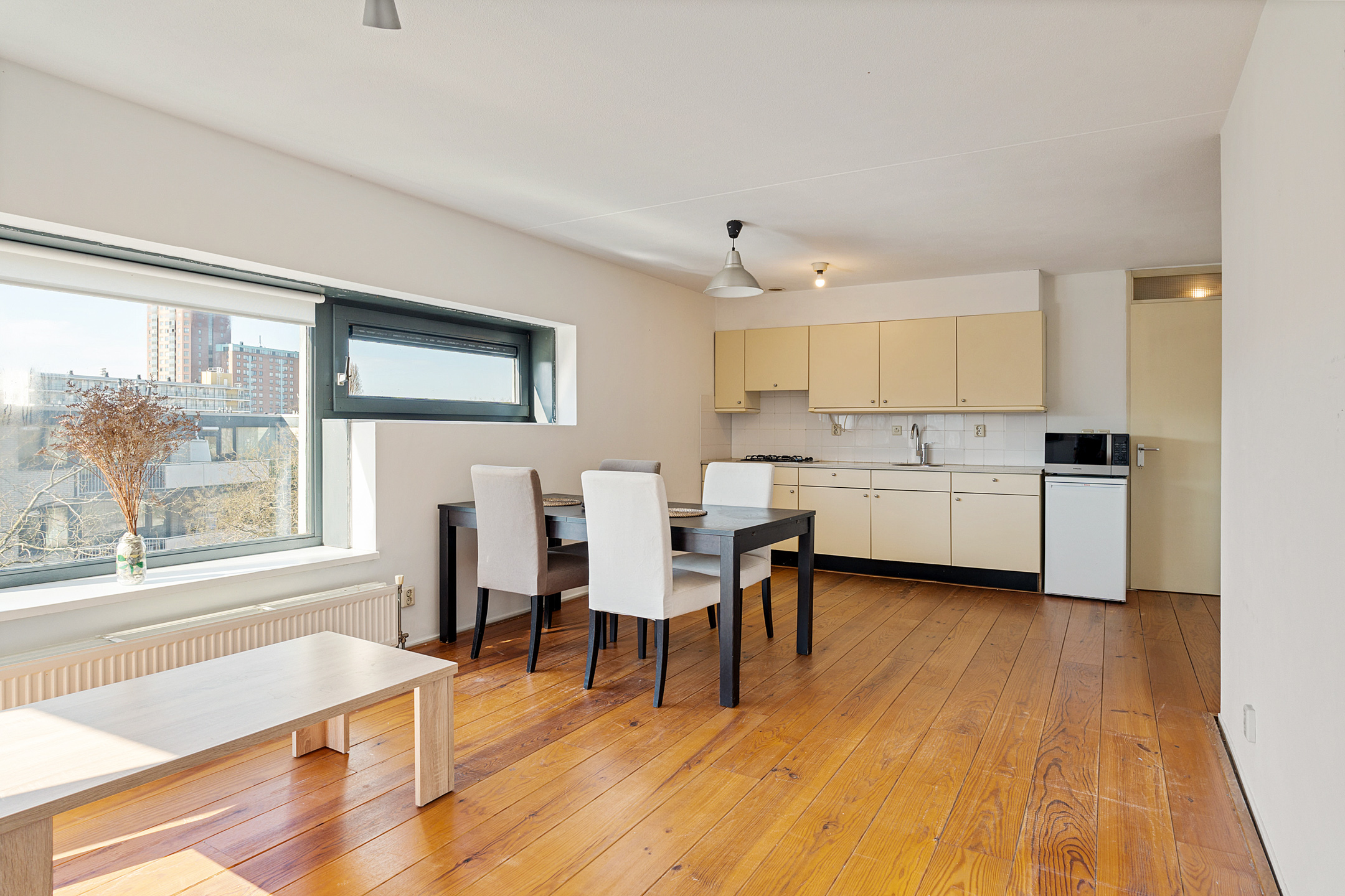 Bij binnenkomst in het appartement kom je in een hal die toegang biedt tot alle vertrekken. De ruime woonkamer is licht en luchtig, dankzij de grote raampartijen die zorgen voor een prachtig uitzicht op het Vredenoordplein en de skyline van Rotterdam. De woonkamer is verbonden met de eenvoudige maar praktische open keuken.