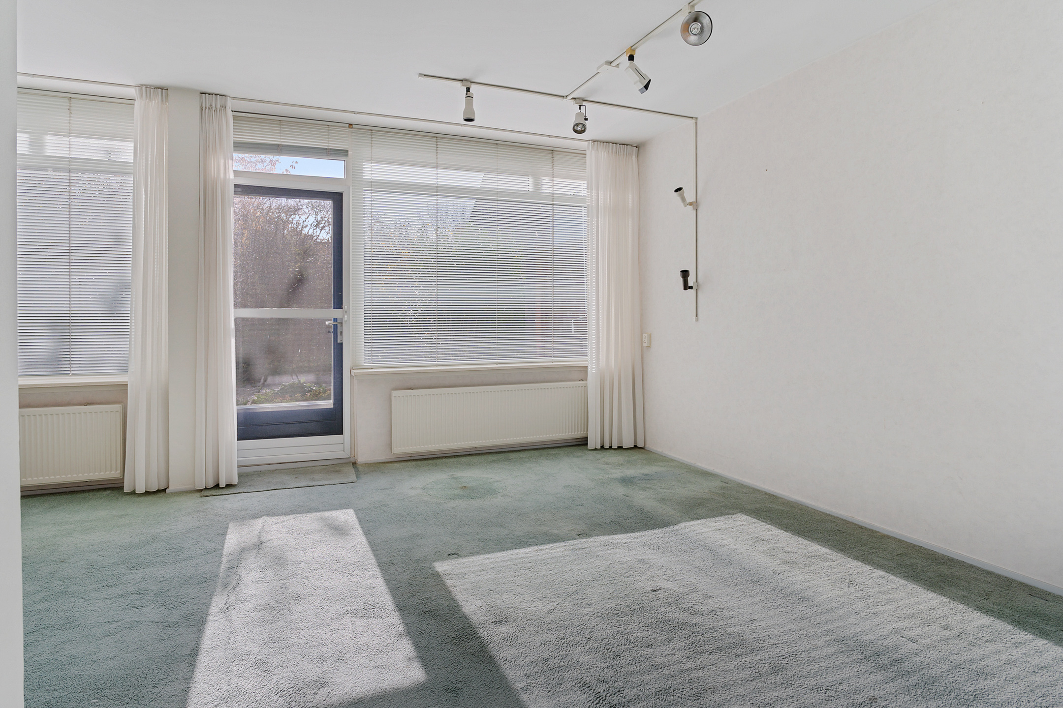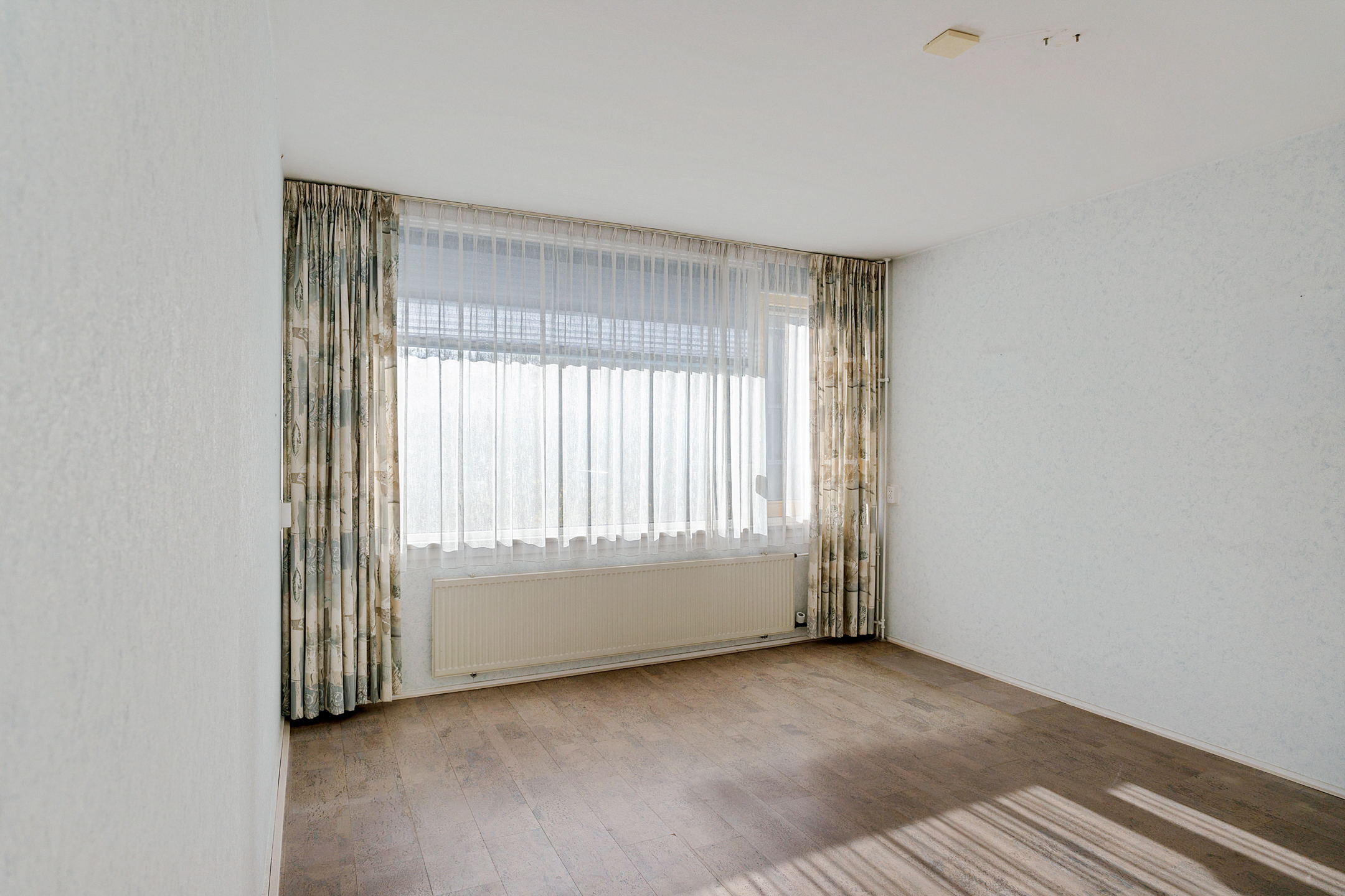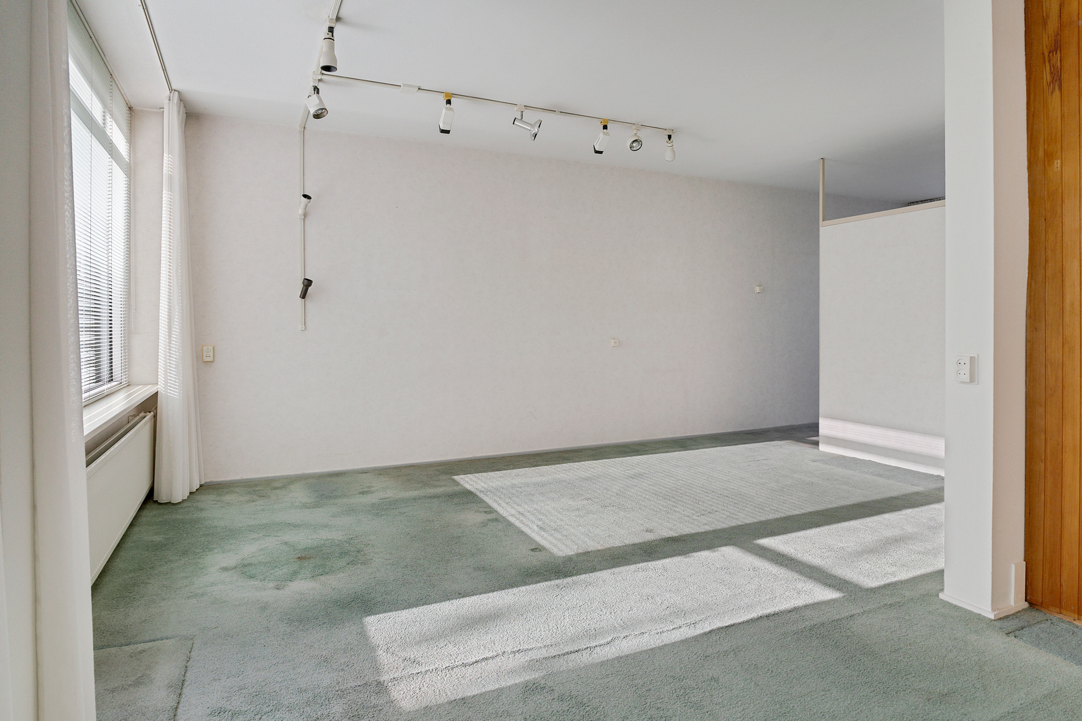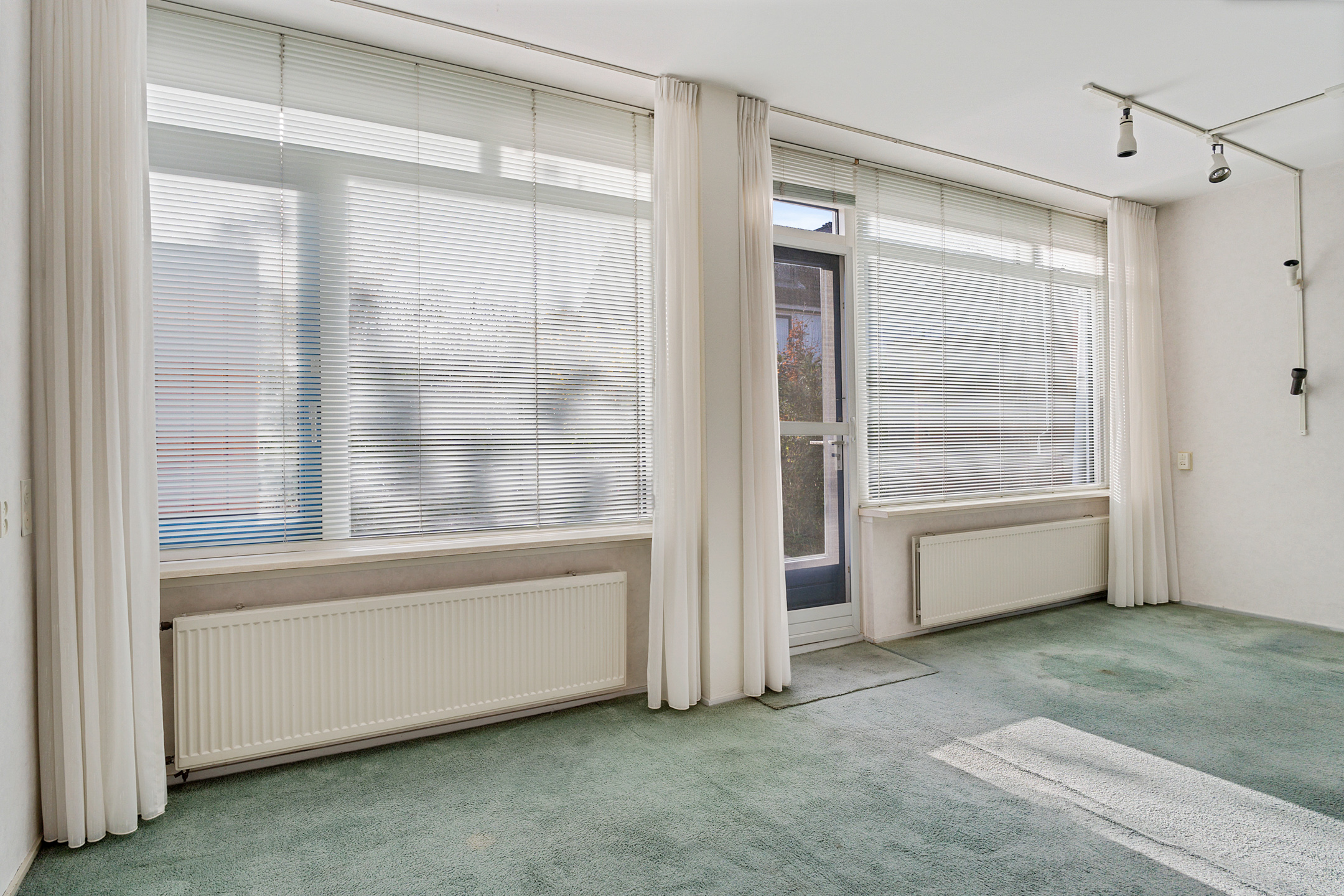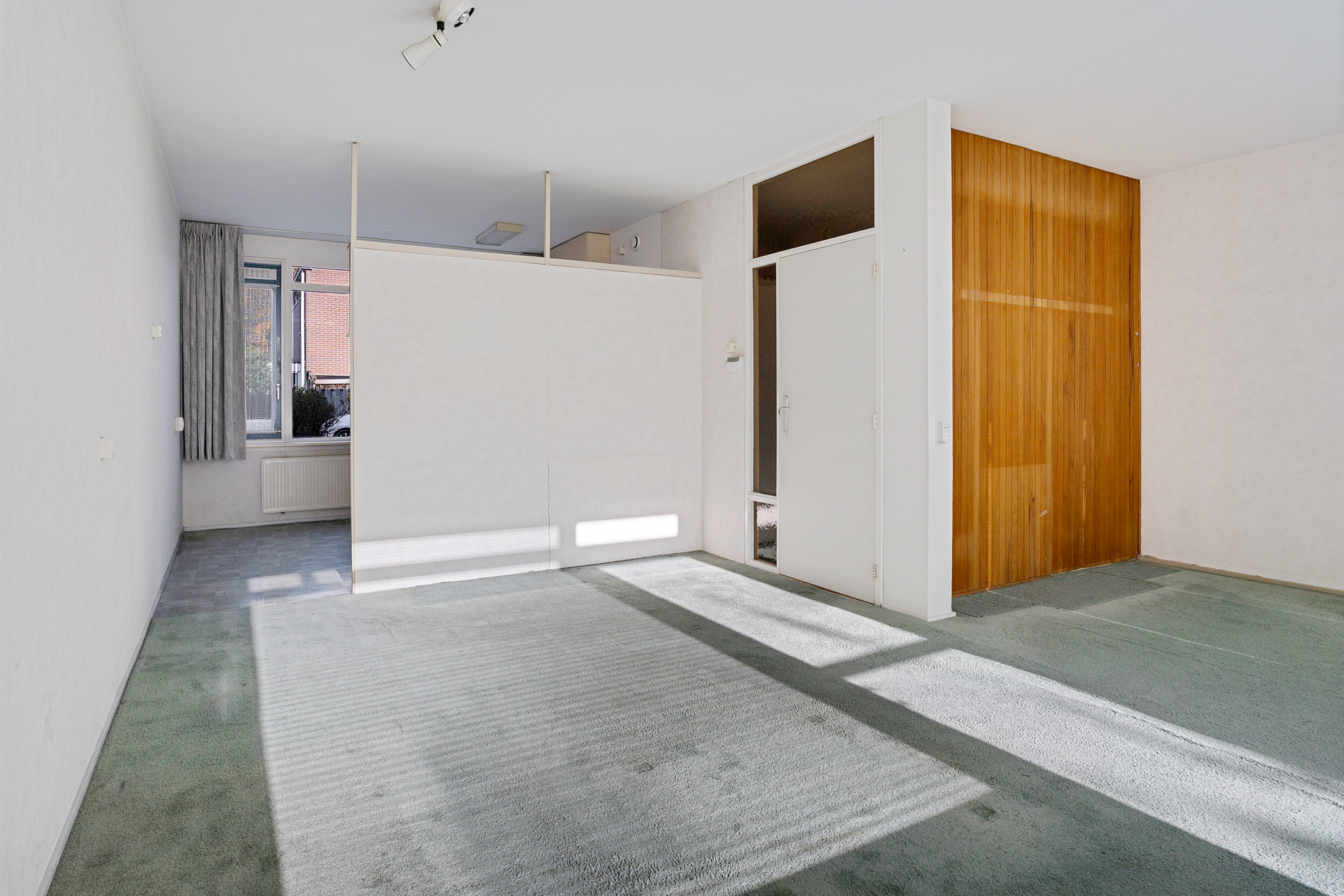 Aan de voorzijde bevindt zich de halfopen keuken. Deze is eenvoudig uitgevoerd en niet voorzien van inbouwapparatuur, waardoor je hier alle vrijheid hebt om een moderne keuken naar eigen smaak te realiseren. De brede woonkamer aan de achterzijde biedt dankzij de grote raampartijen veel lichtinval en zicht op de tuin. Wil je graag een open woonkeuken? Door de breedte en indeling behoort een keuken aan de achterzijde zeker tot de mogelijkheden.
