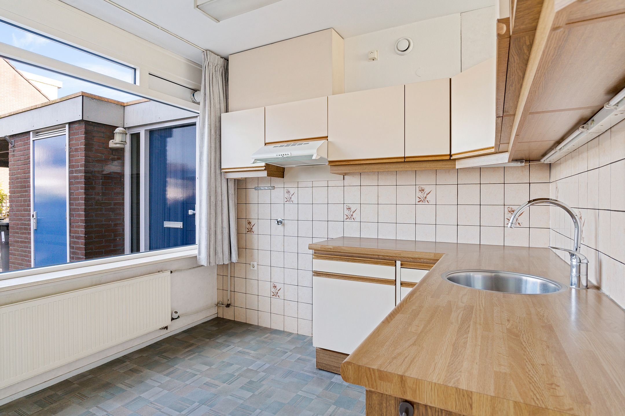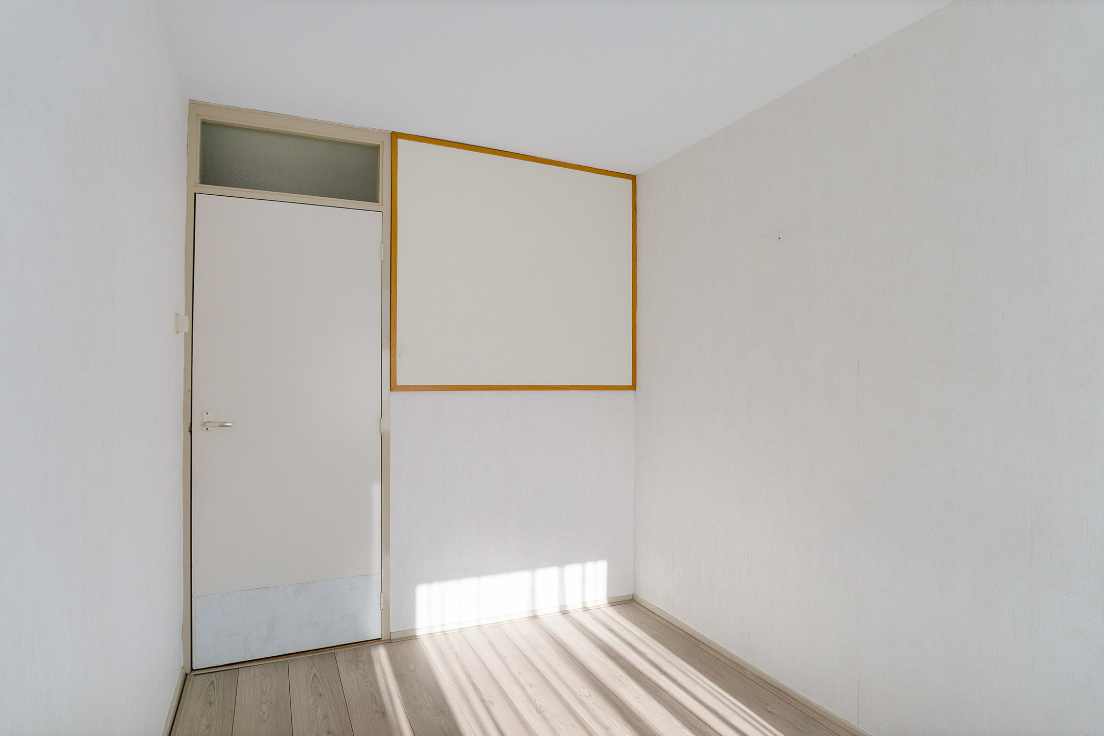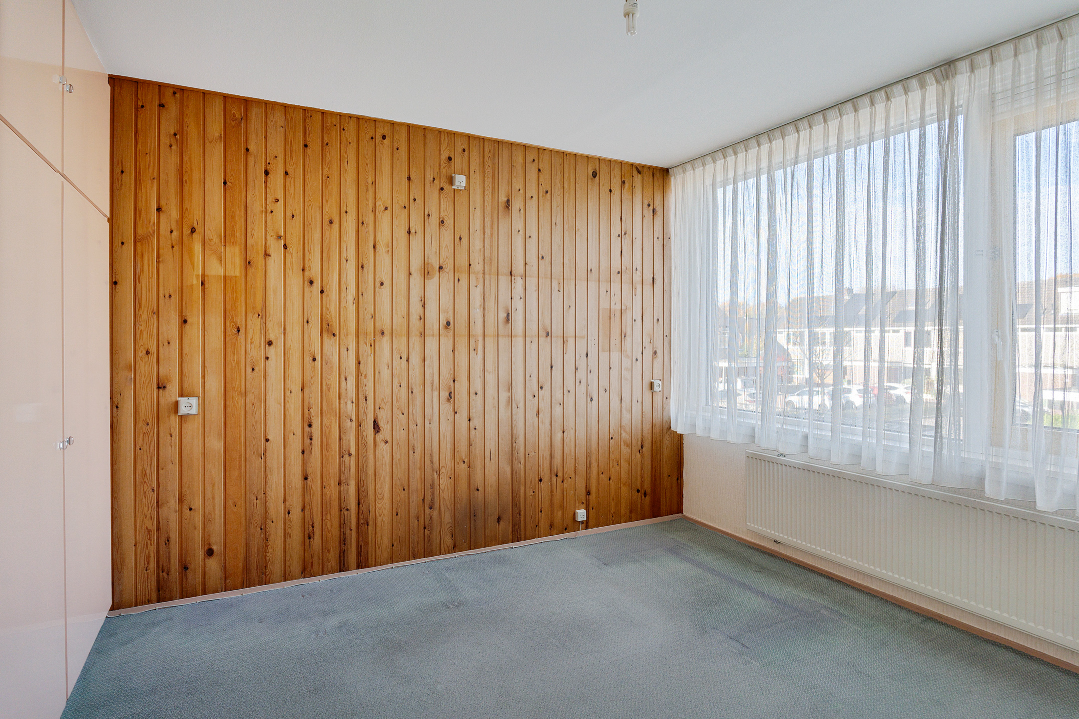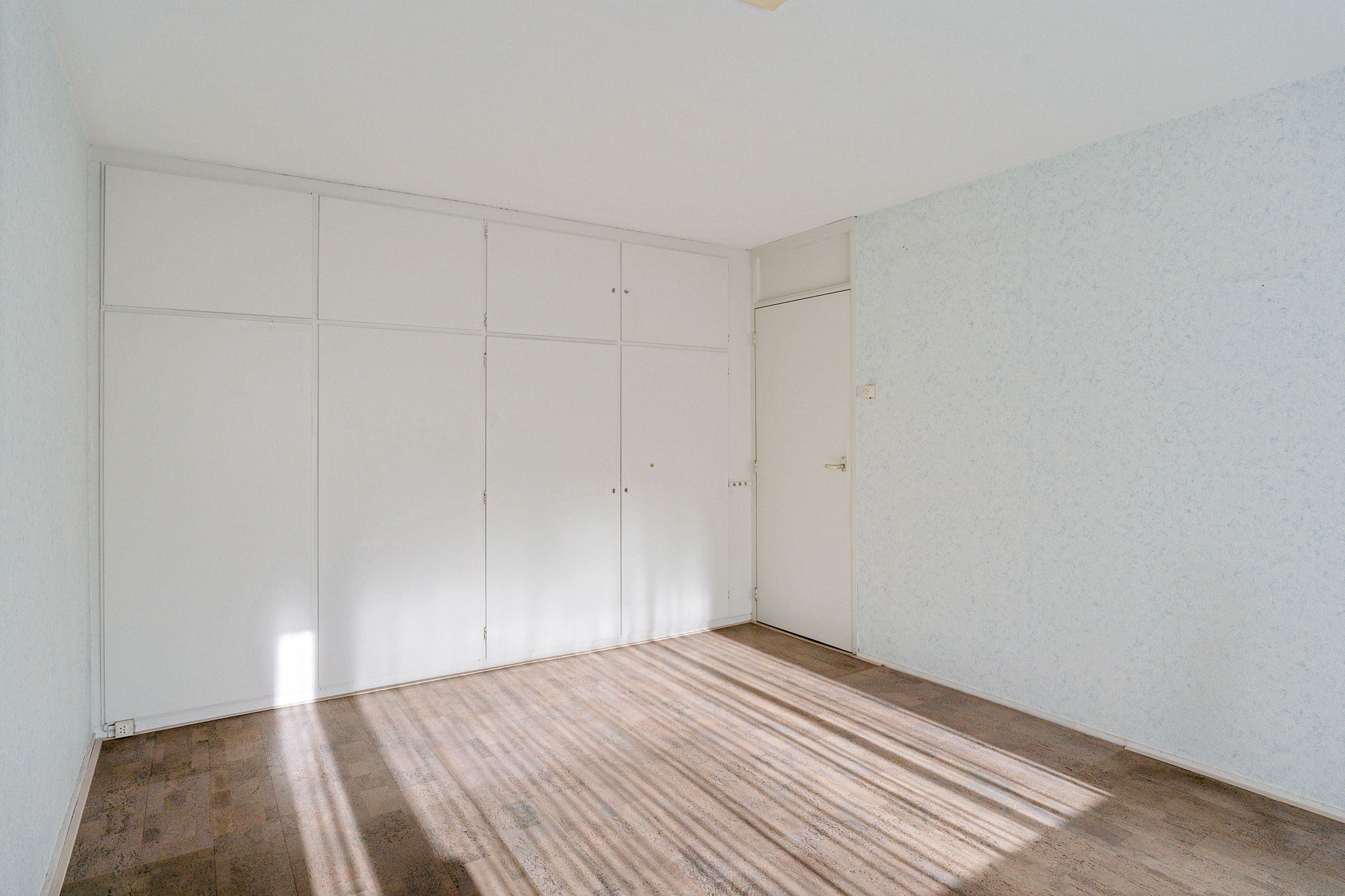 Aan de voorzijde bevindt zich de halfopen keuken. Deze is eenvoudig uitgevoerd en niet voorzien van inbouwapparatuur, waardoor je hier alle vrijheid hebt om een moderne keuken naar eigen smaak te realiseren. De brede woonkamer aan de achterzijde biedt dankzij de grote raampartijen veel lichtinval en zicht op de tuin. Wil je graag een open woonkeuken? Door de breedte en indeling behoort een keuken aan de achterzijde zeker tot de mogelijkheden.