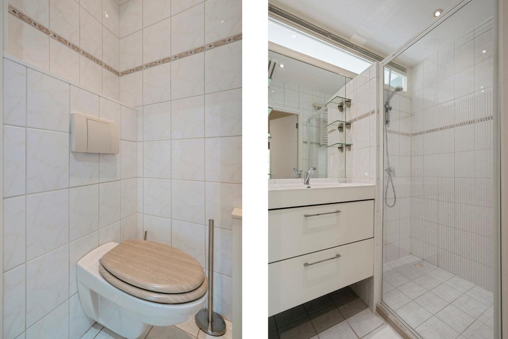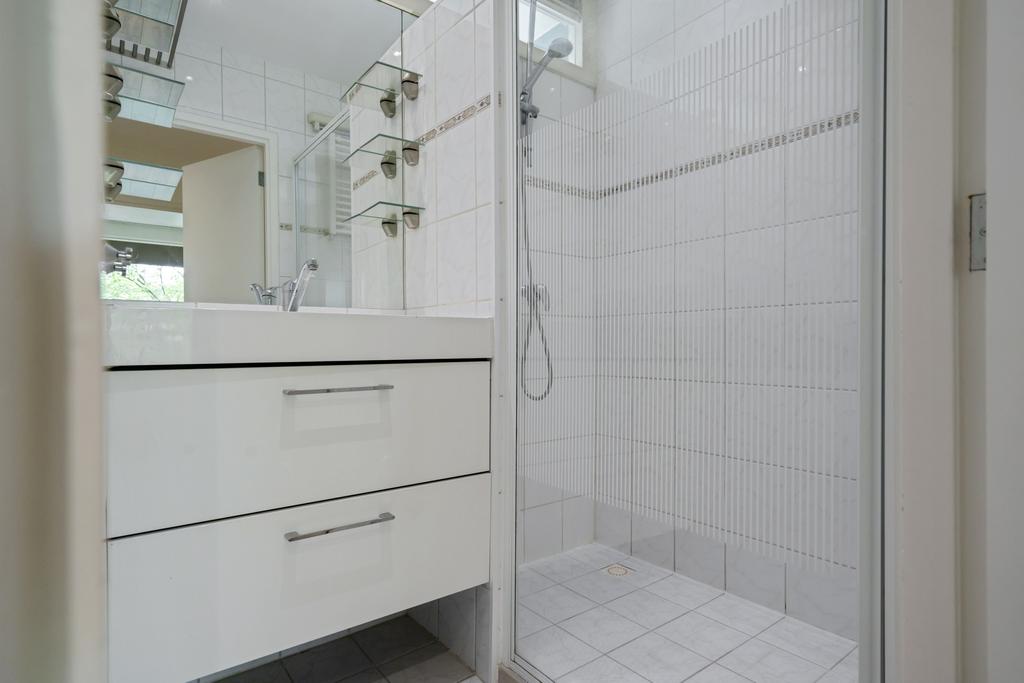 Via de hal is er toegang tot de badkamer. De badkamer is voorzien van een fijne inloopdouche, wastafel, wastafelmeubel en spiegel.