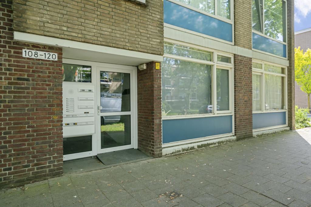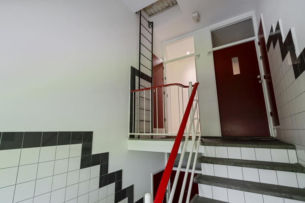 Gesloten portiek met bellenbord, brievenbuskasten, trappenhuis en toegang tot de bergingen in de onderbouw.