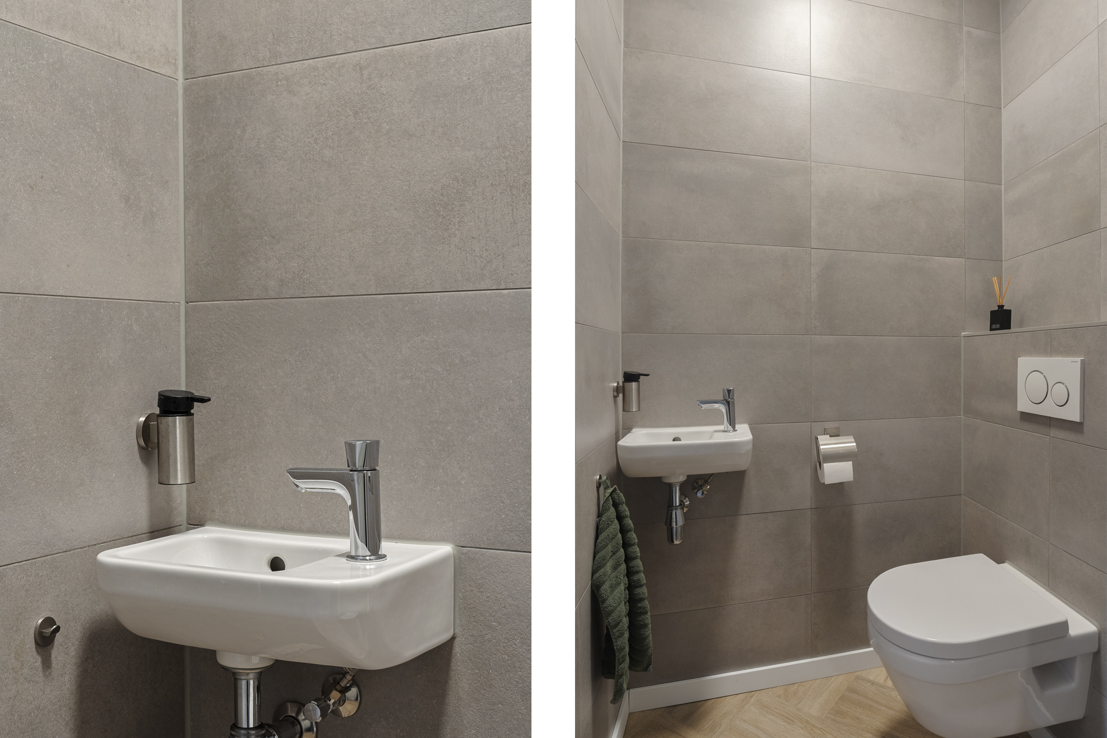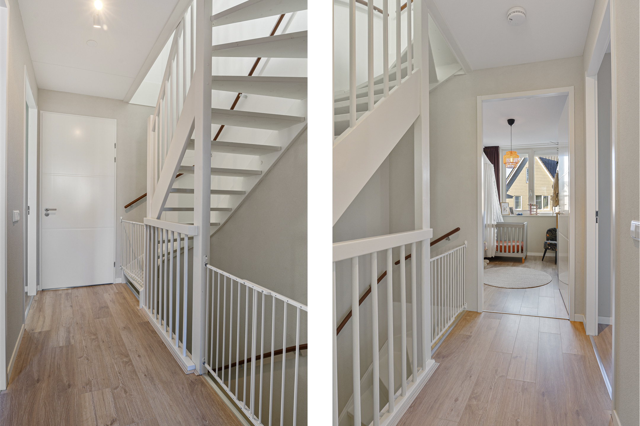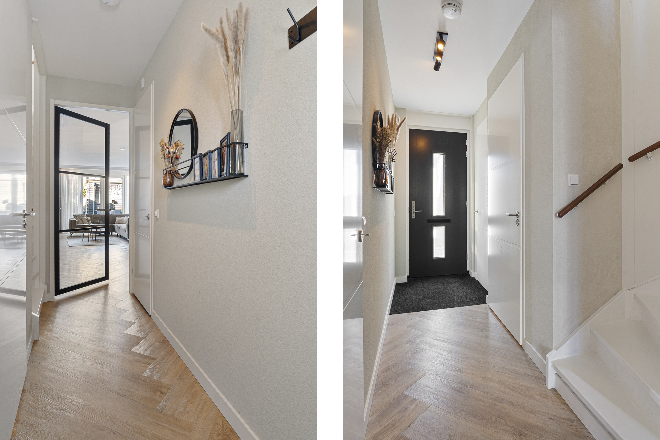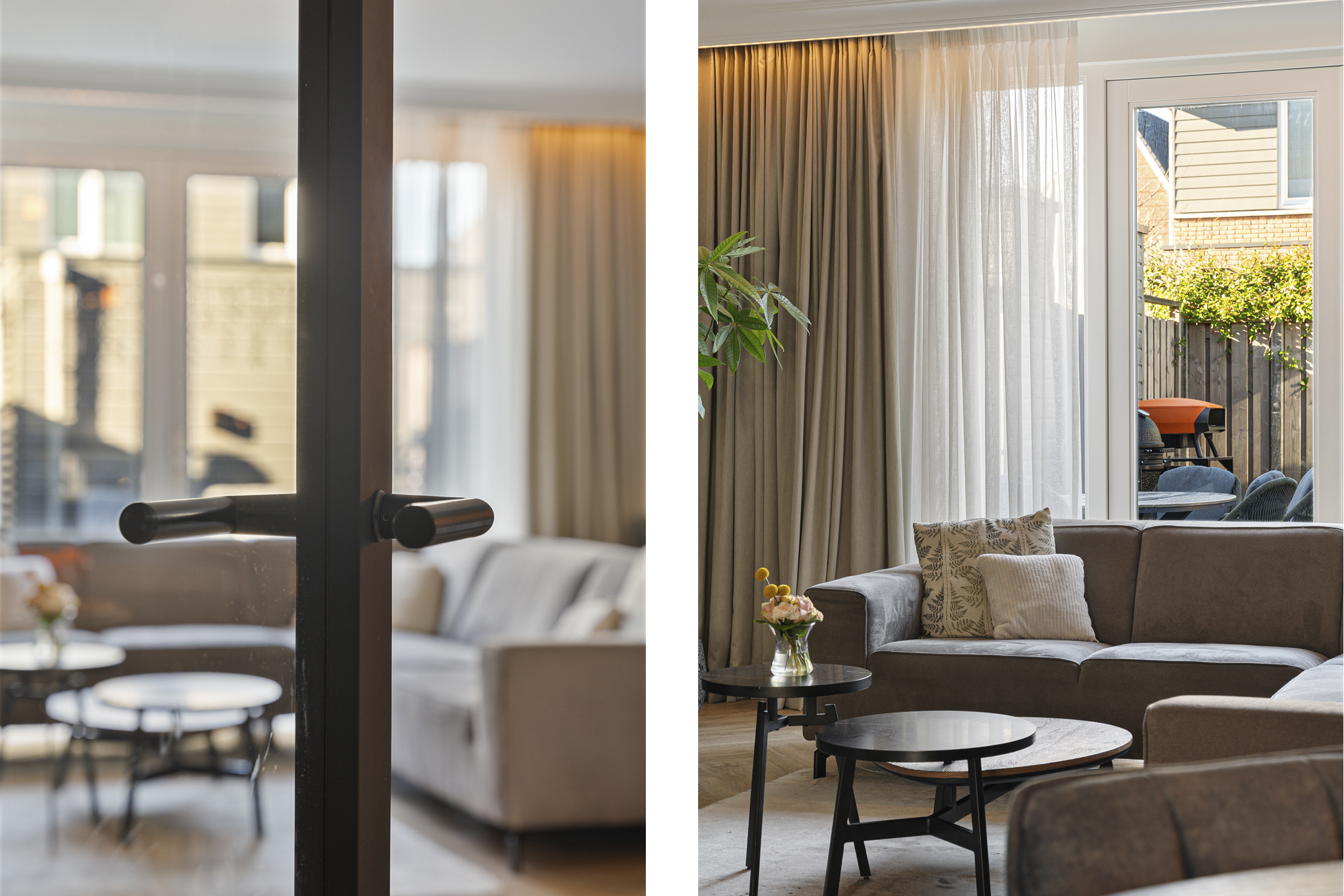 Via de entree kom je in de hal met meterkast, een modern toilet en de trapopgang naar de eerste verdieping. Vanuit de hal loop je door naar de ruime en lichte woonkamer. Dankzij de grote raampartijen en de open indeling voelt de leefruimte bijzonder ruim aan.