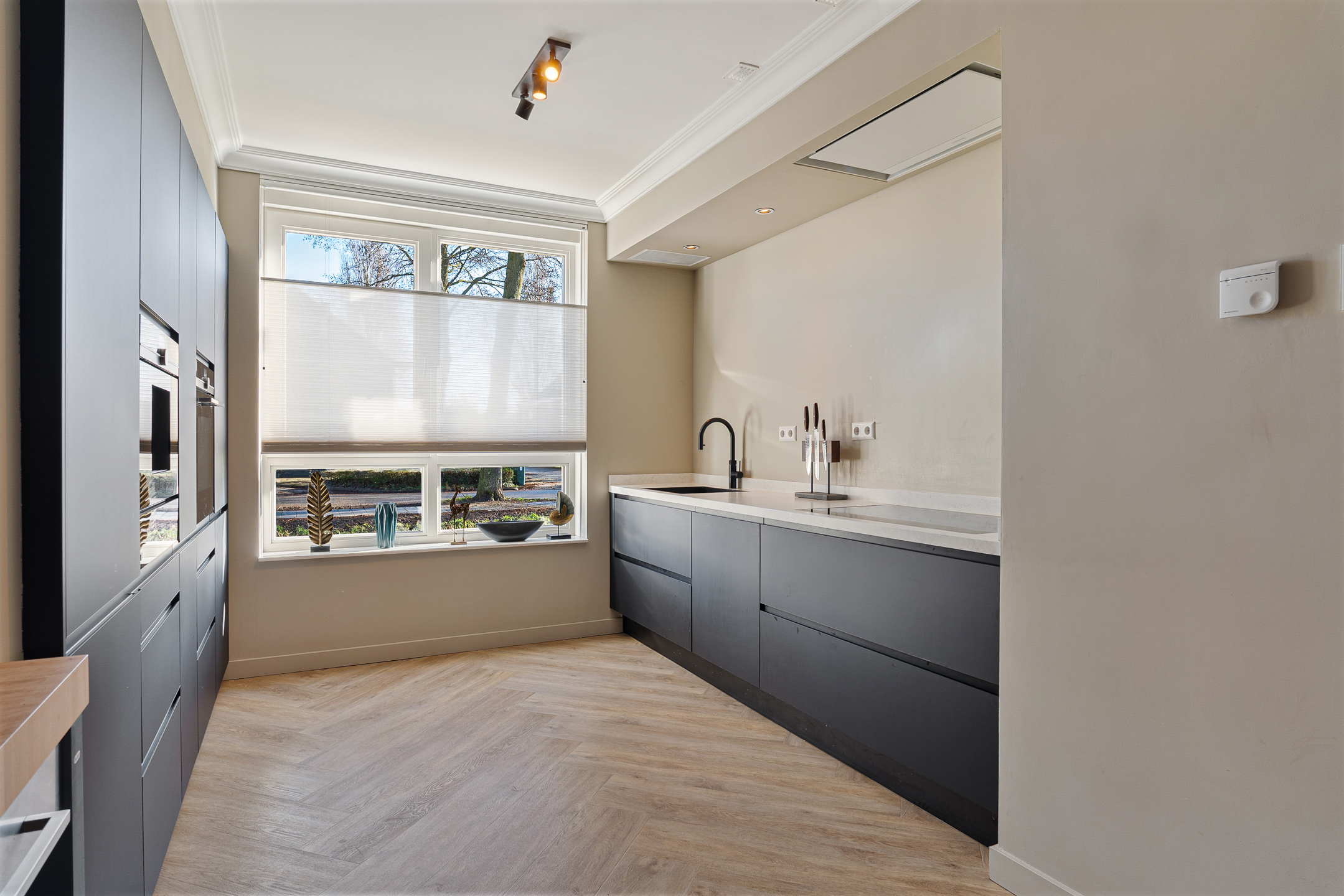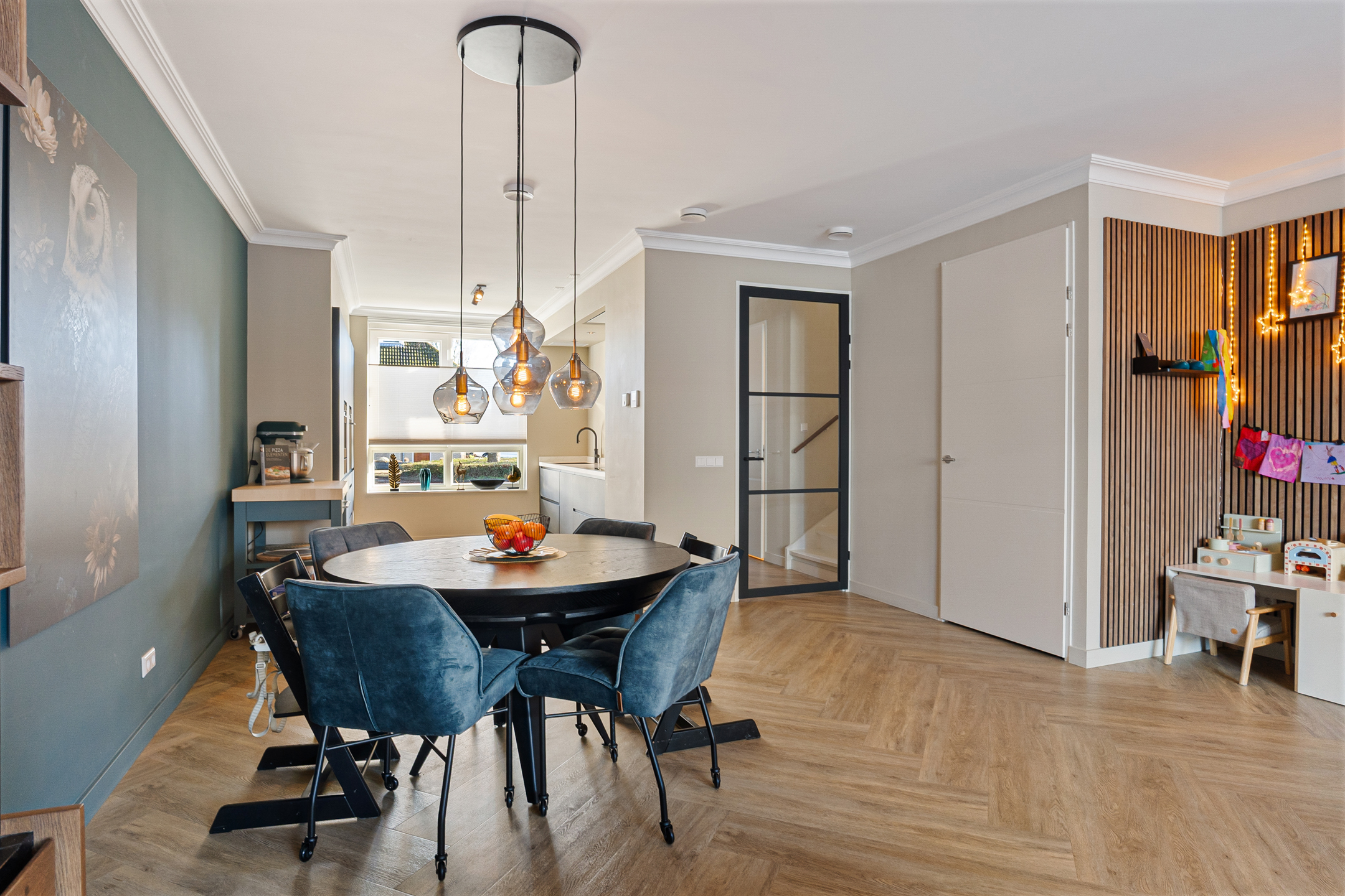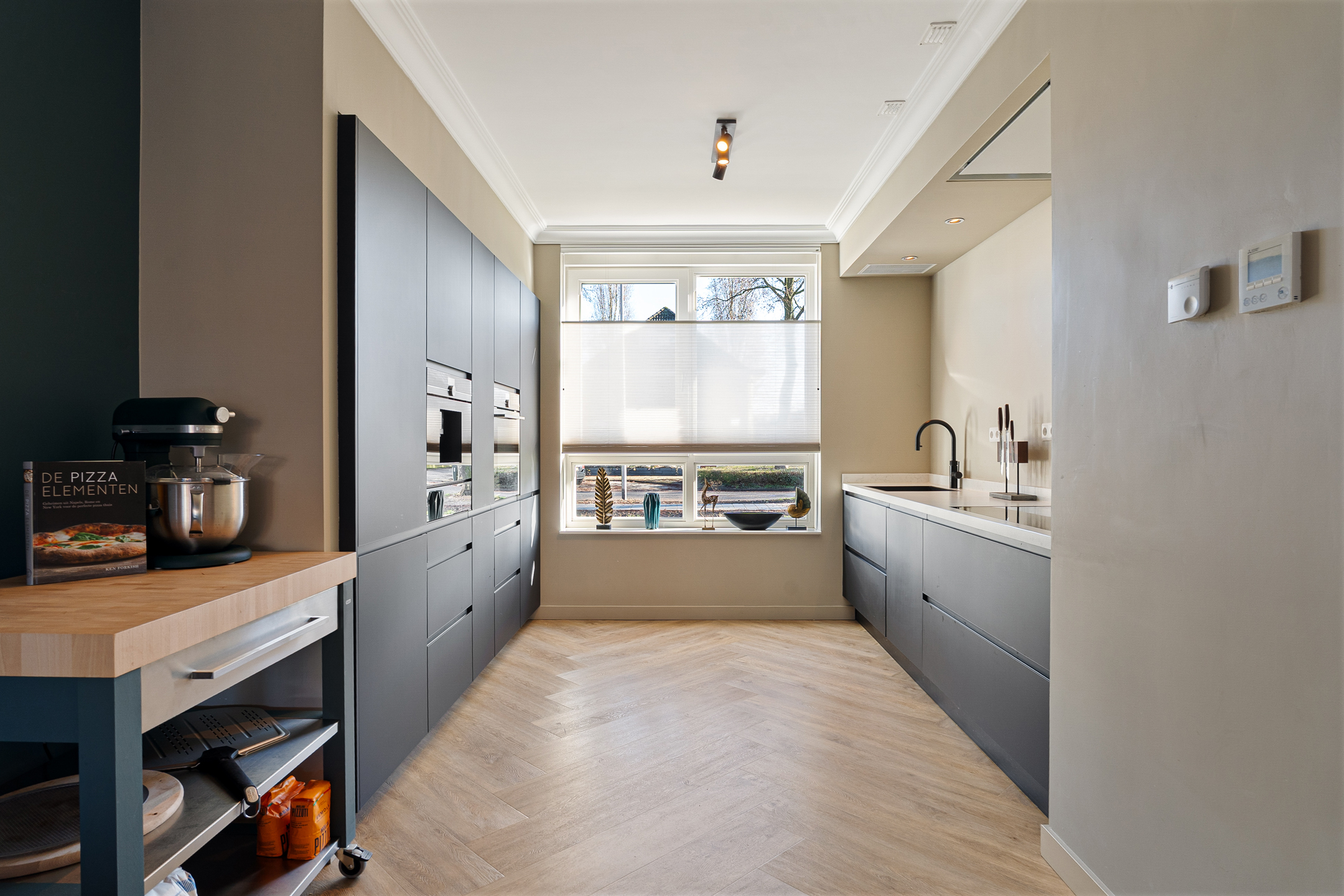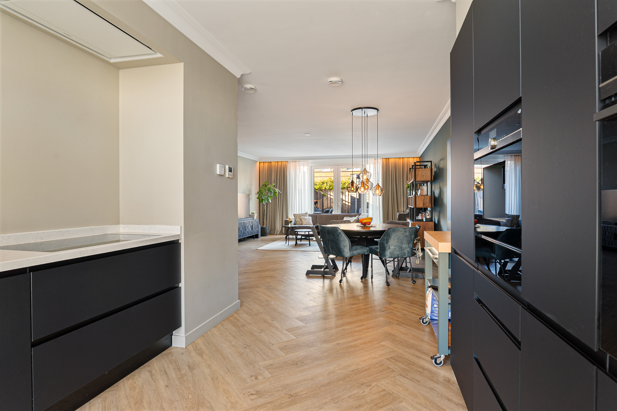 Aan de voorzijde van de woning bevindt zich de moderne open keuken. Deze is voorzien van diverse inbouwapparatuur van Siemens; koffieapparaat, warmhoudlade, combi oven, vaatwasser, kookplaat en afzuigkap, koel-vriescombinatie en Quooker. De woonkamer biedt voldoende ruimte voor een royale zithoek en een grote eettafel.