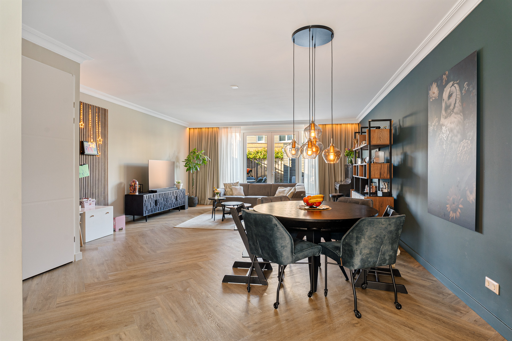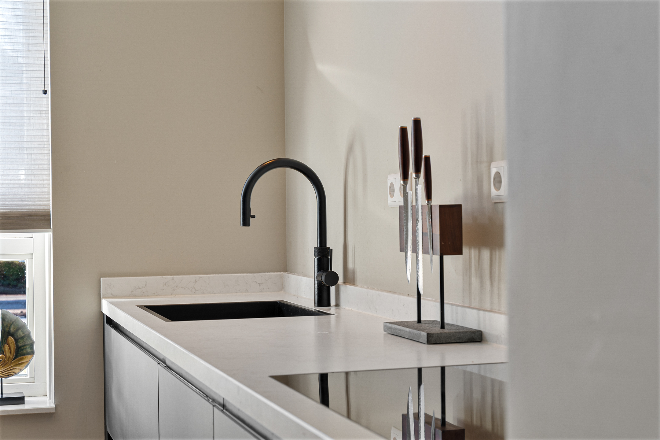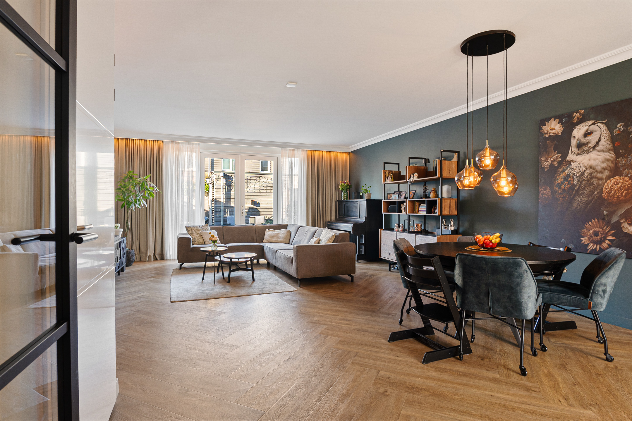 Aan de voorzijde van de woning bevindt zich de moderne open keuken. Deze is voorzien van diverse inbouwapparatuur van Siemens; koffieapparaat, warmhoudlade, combi oven, vaatwasser, kookplaat en afzuigkap, koel-vriescombinatie en Quooker. De woonkamer biedt voldoende ruimte voor een royale zithoek en een grote eettafel.