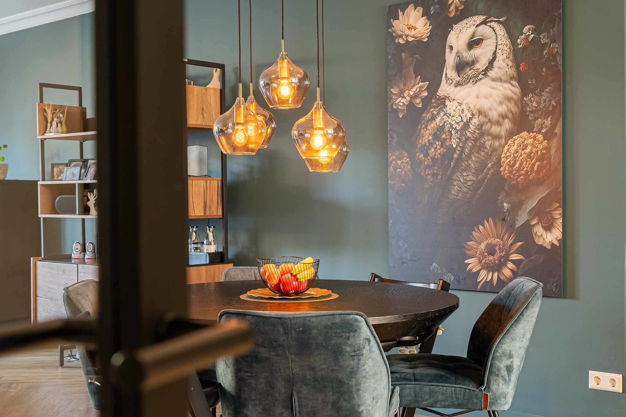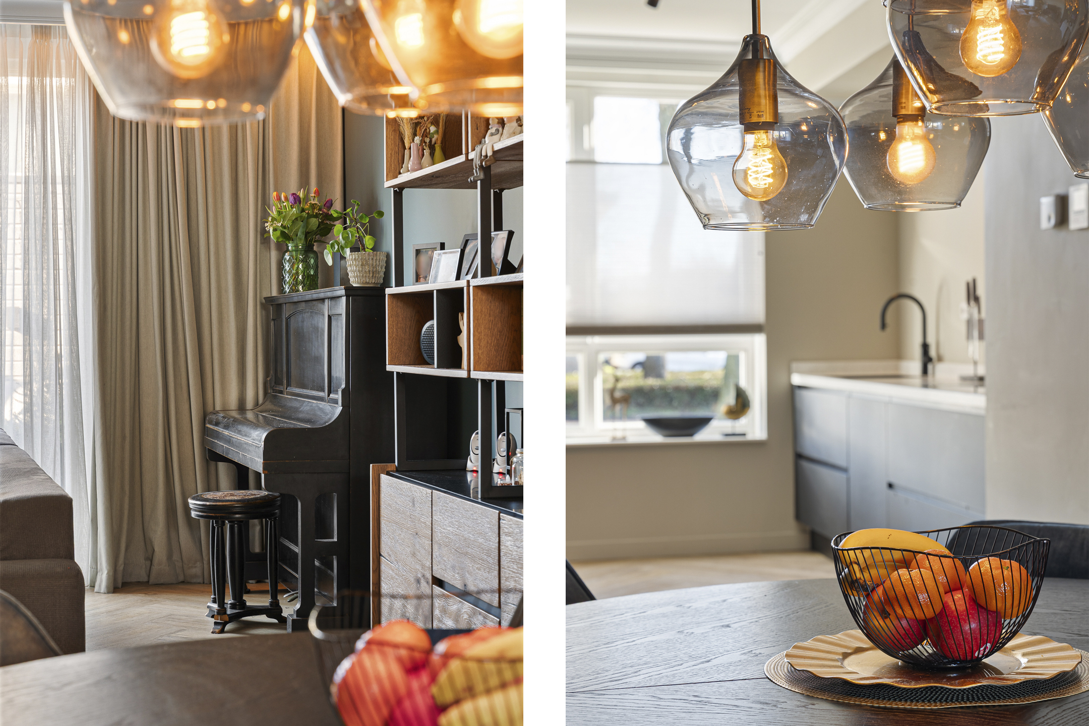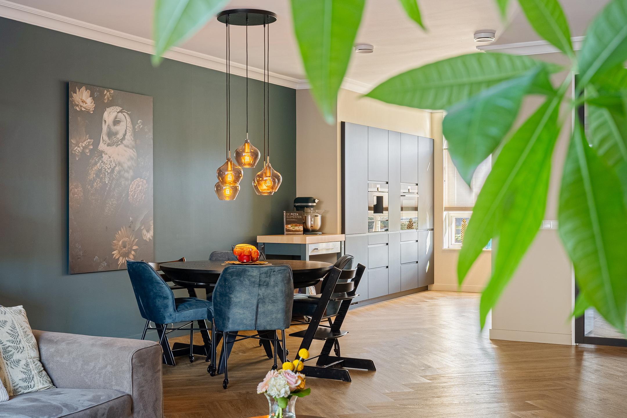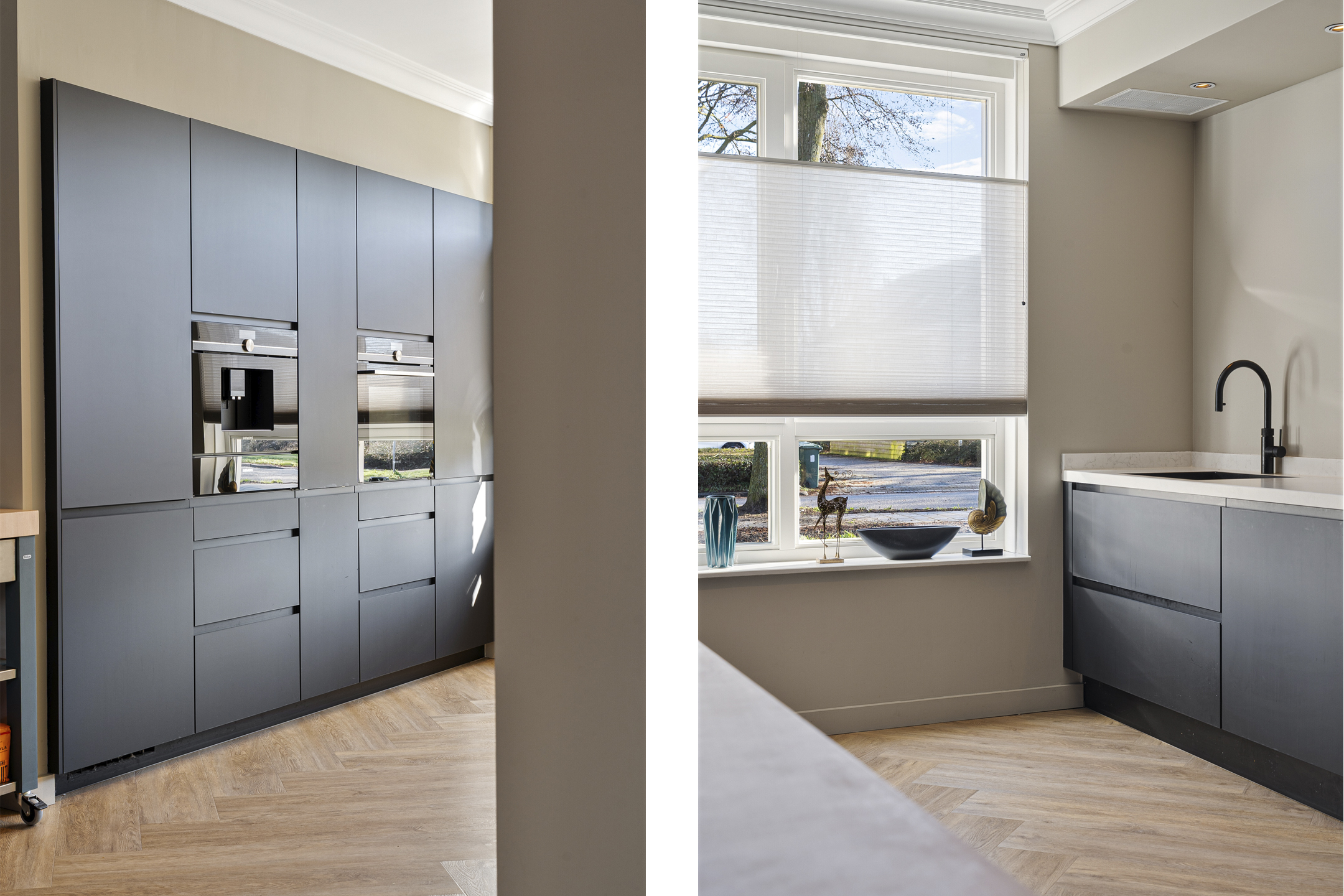 Aan de voorzijde van de woning bevindt zich de moderne open keuken. Deze is voorzien van diverse inbouwapparatuur van Siemens; koffieapparaat, warmhoudlade, combi oven, vaatwasser, kookplaat en afzuigkap, koel-vriescombinatie en Quooker. De woonkamer biedt voldoende ruimte voor een royale zithoek en een grote eettafel.