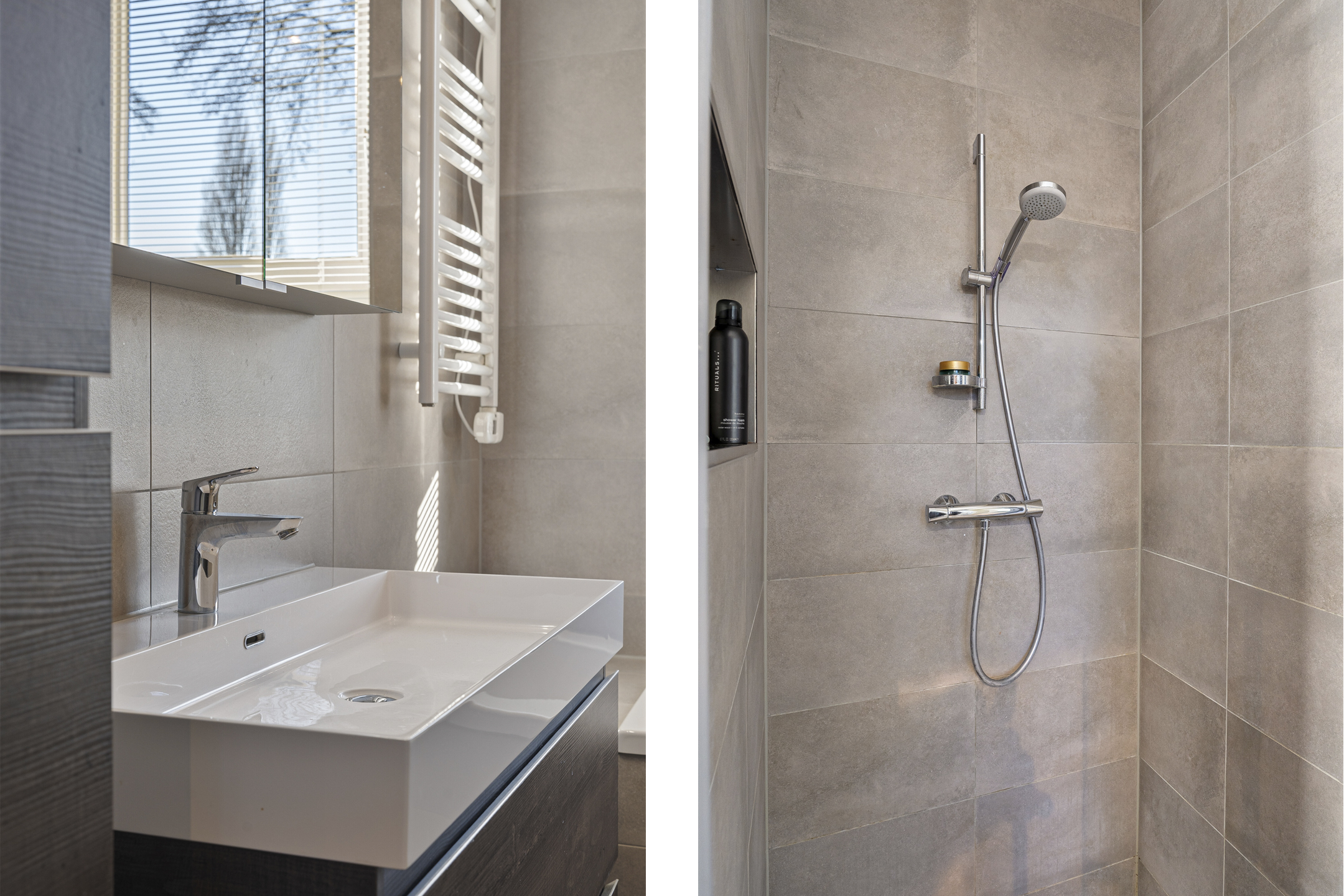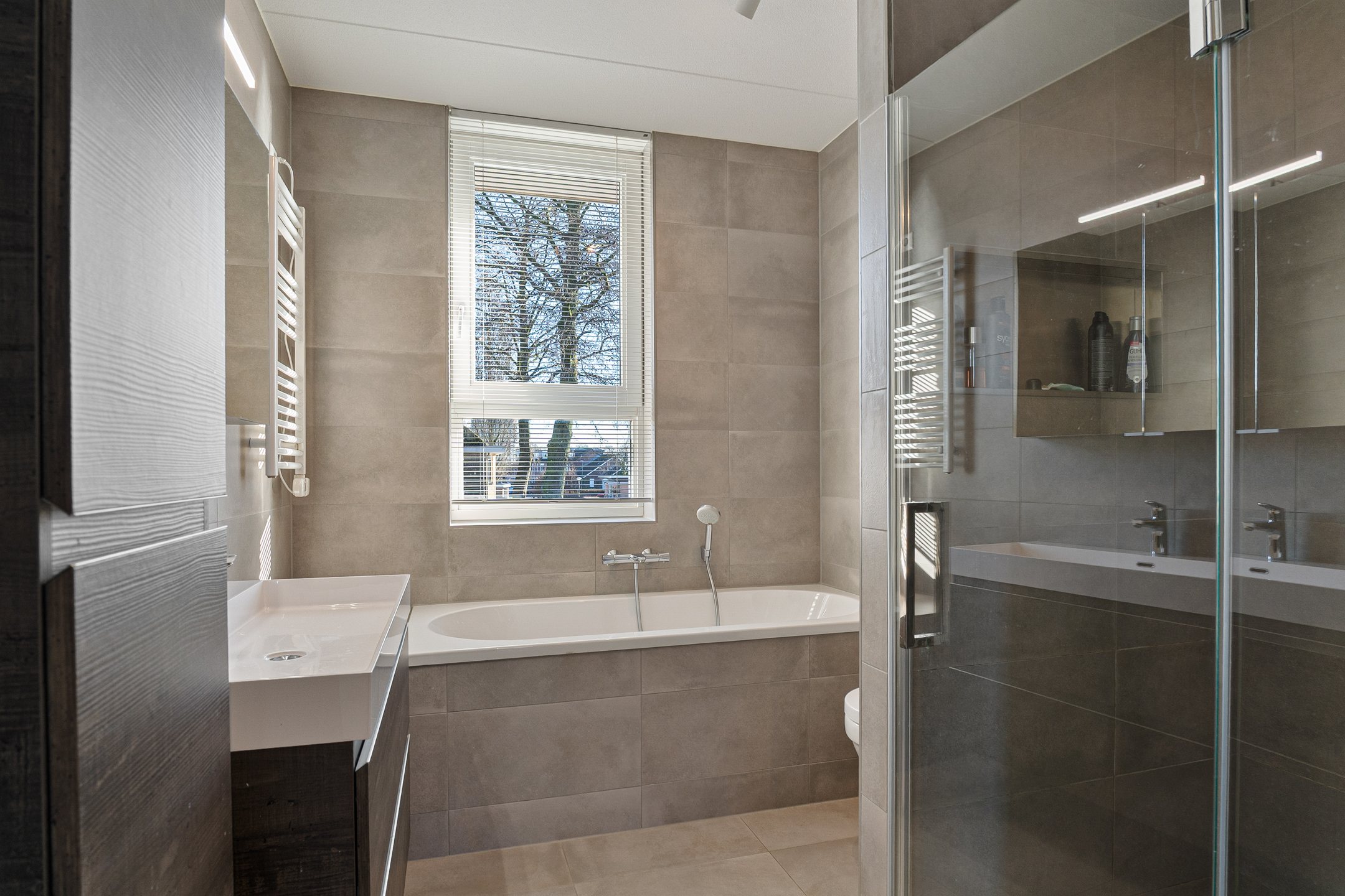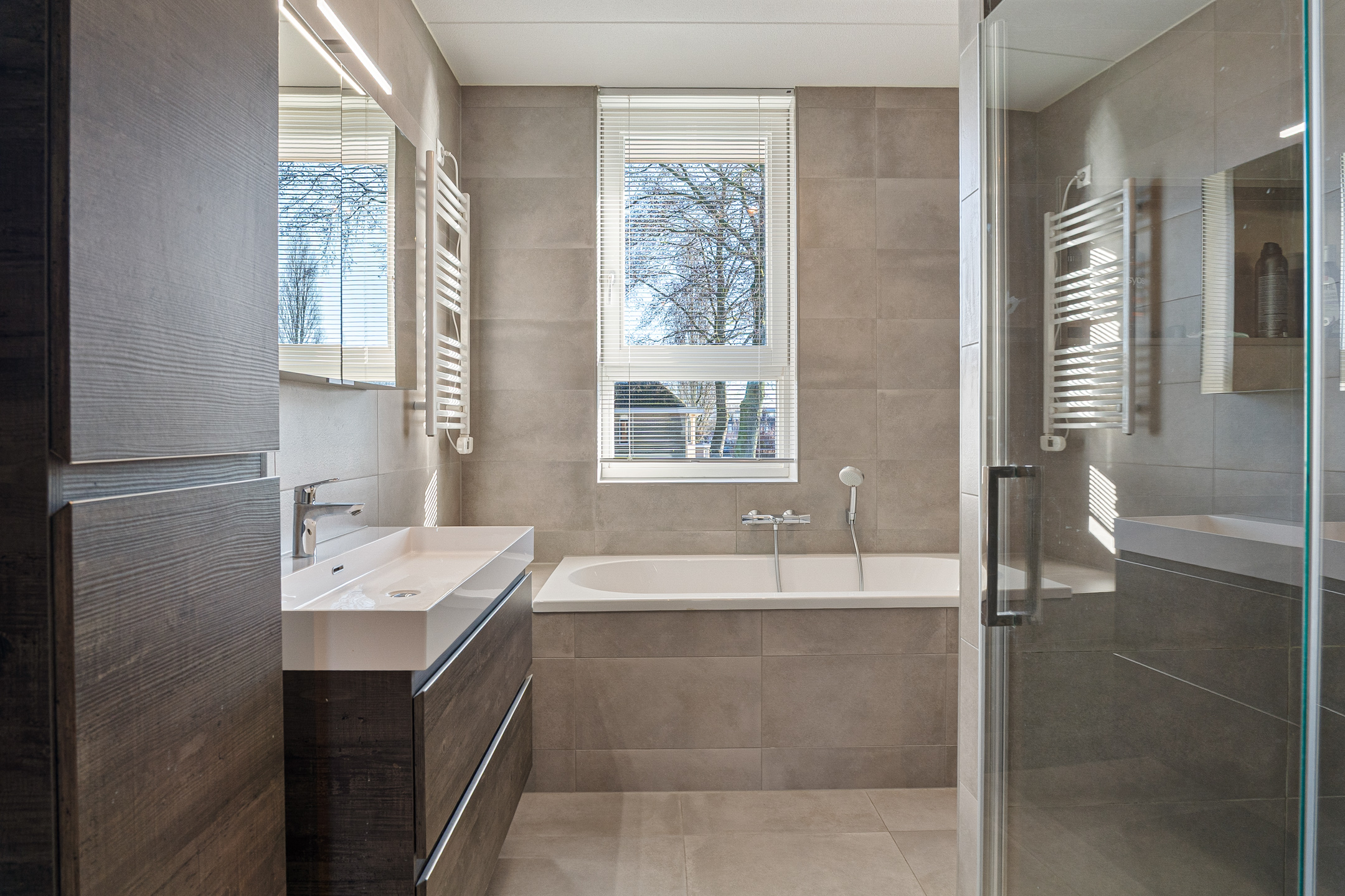 De moderne badkamer is voorzien van een ligbad, een inloopdouche, een wastafelmeubel en een tweede toilet.