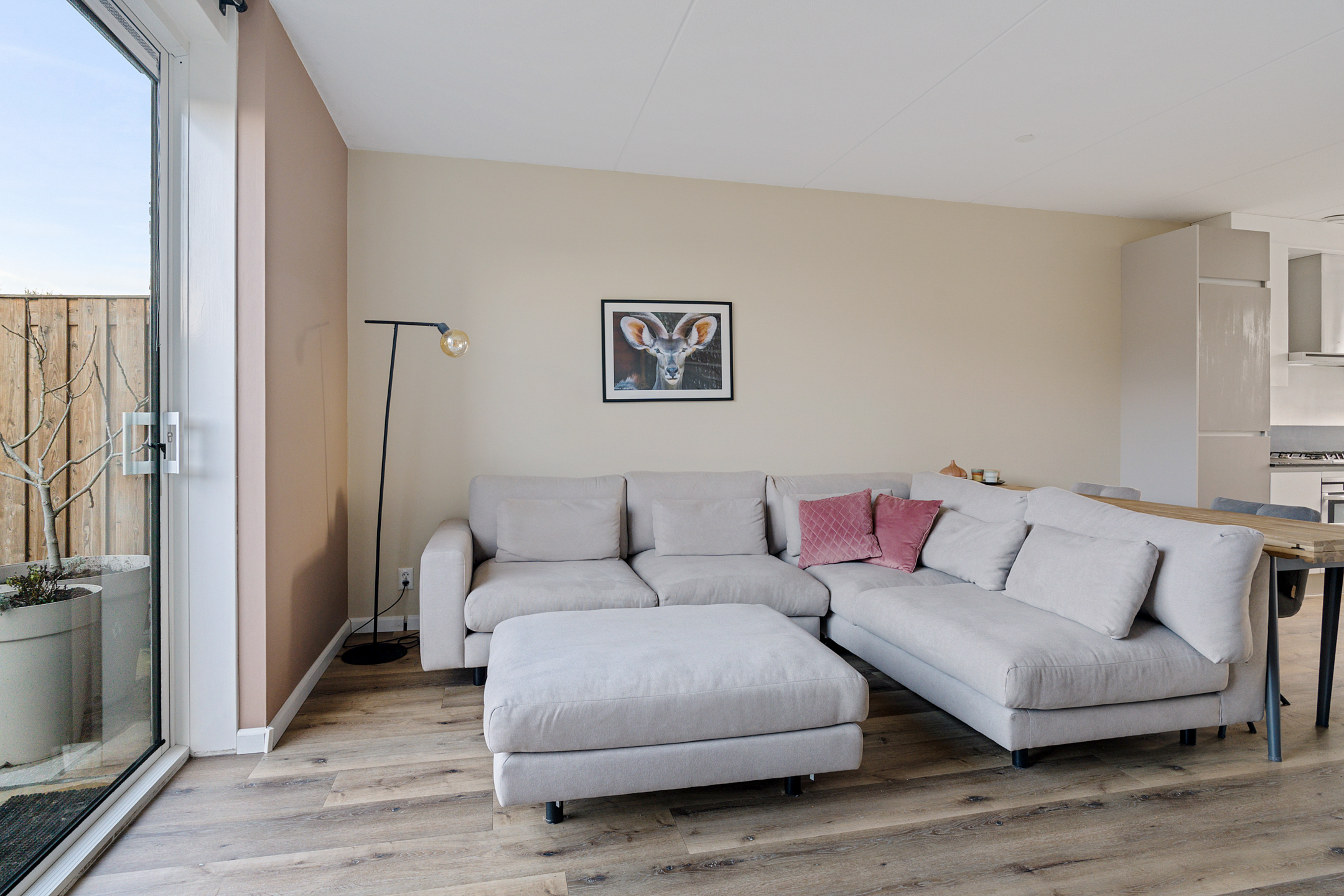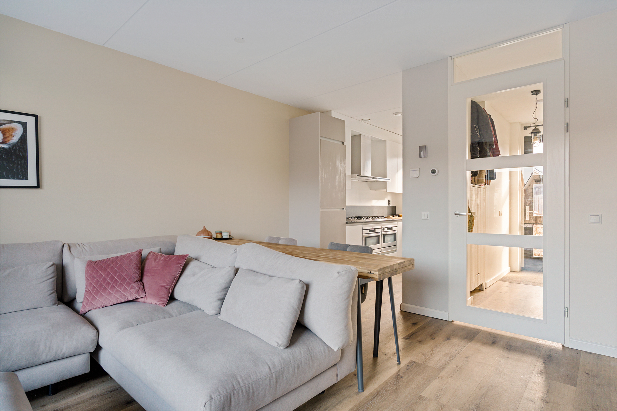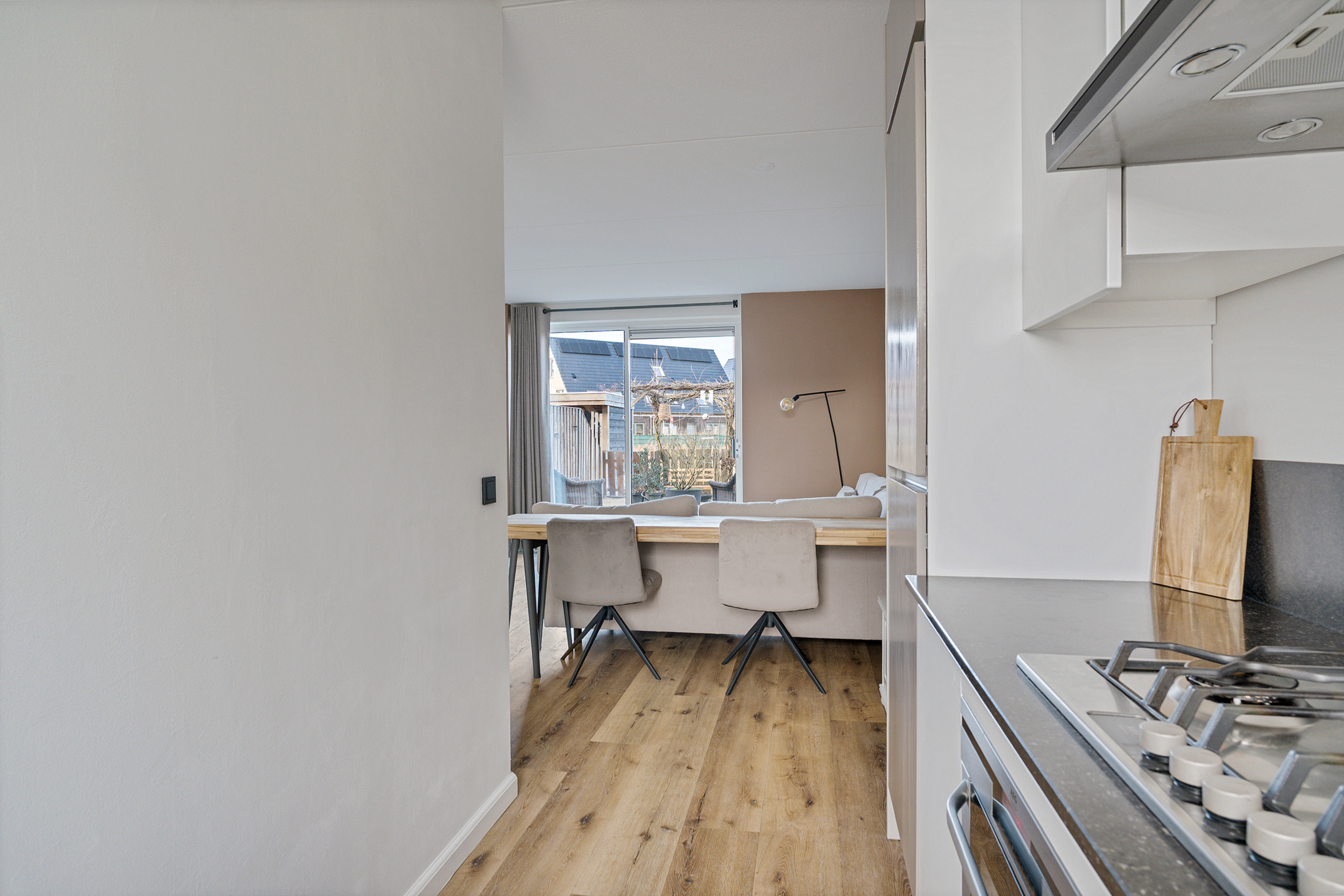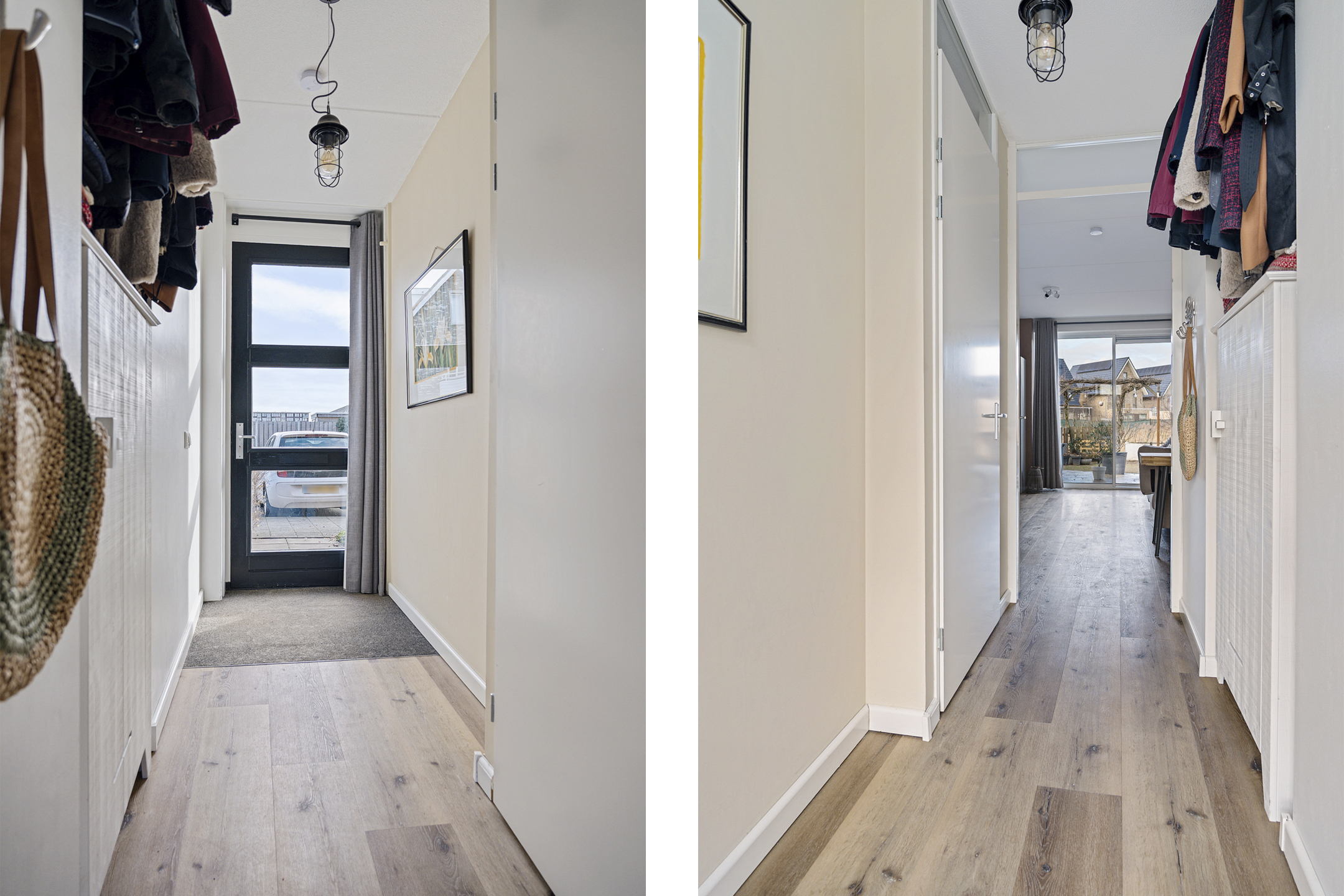 Je stapt binnen in een lichte hal met toegang tot het toilet en de meterkast (voorzien van 3-fasenstroom). Vanuit hier kom je in de ruime, tuingerichte woonkamer met een aluminium schuifpui die veel licht en een fijne verbinding met buiten biedt. De PVC vloer met vloerverwarming zorgt voor comfort en een moderne uitstraling.