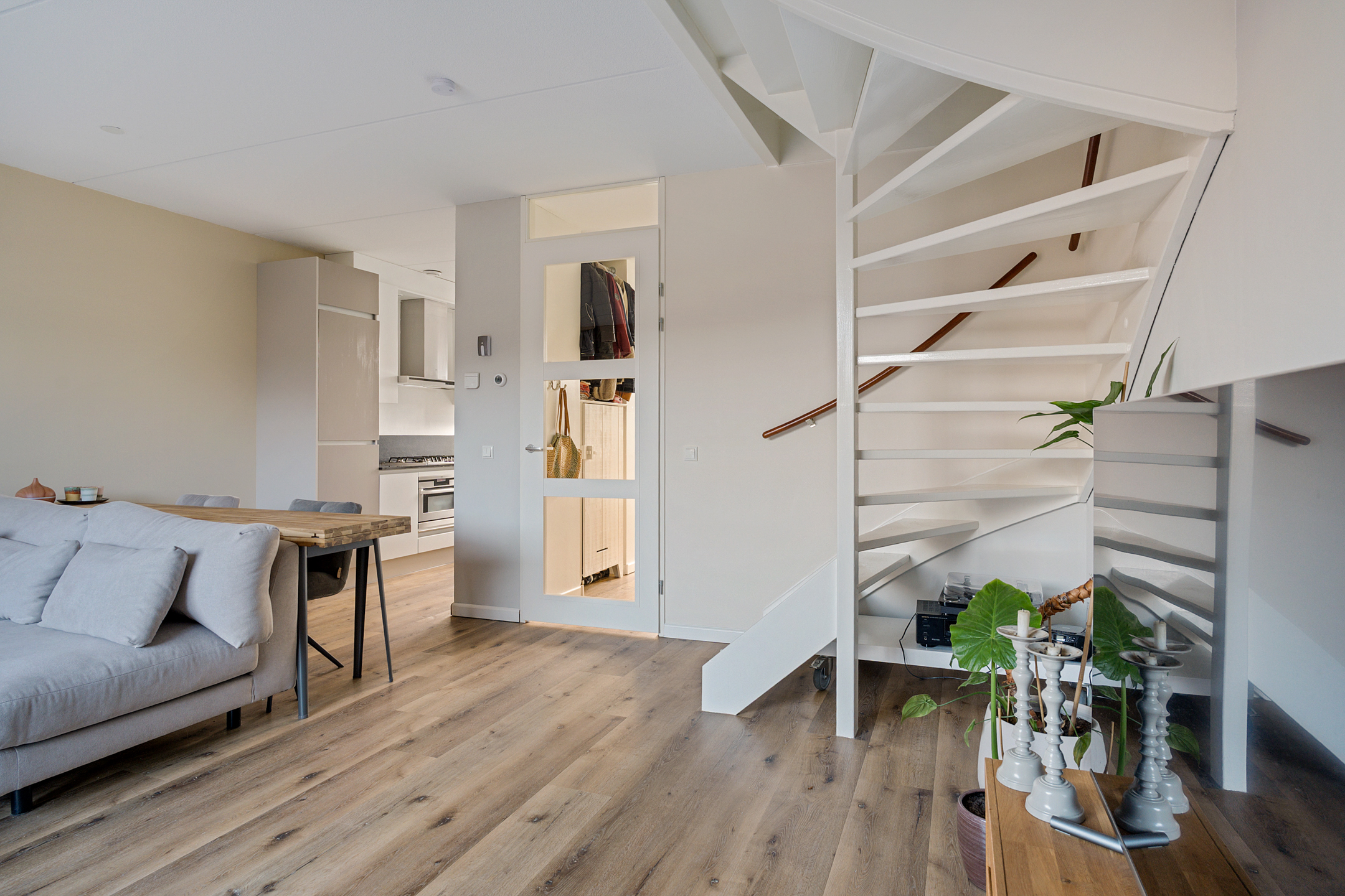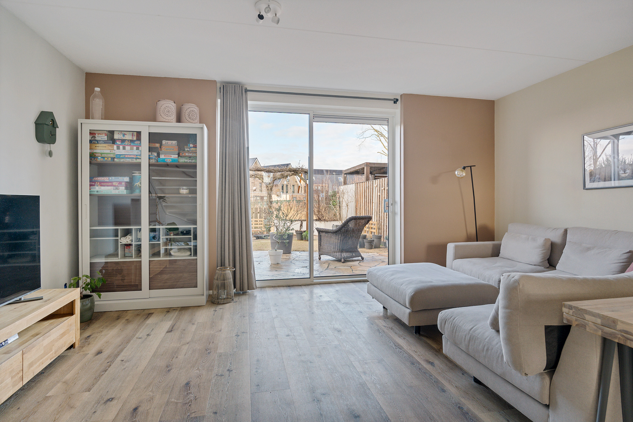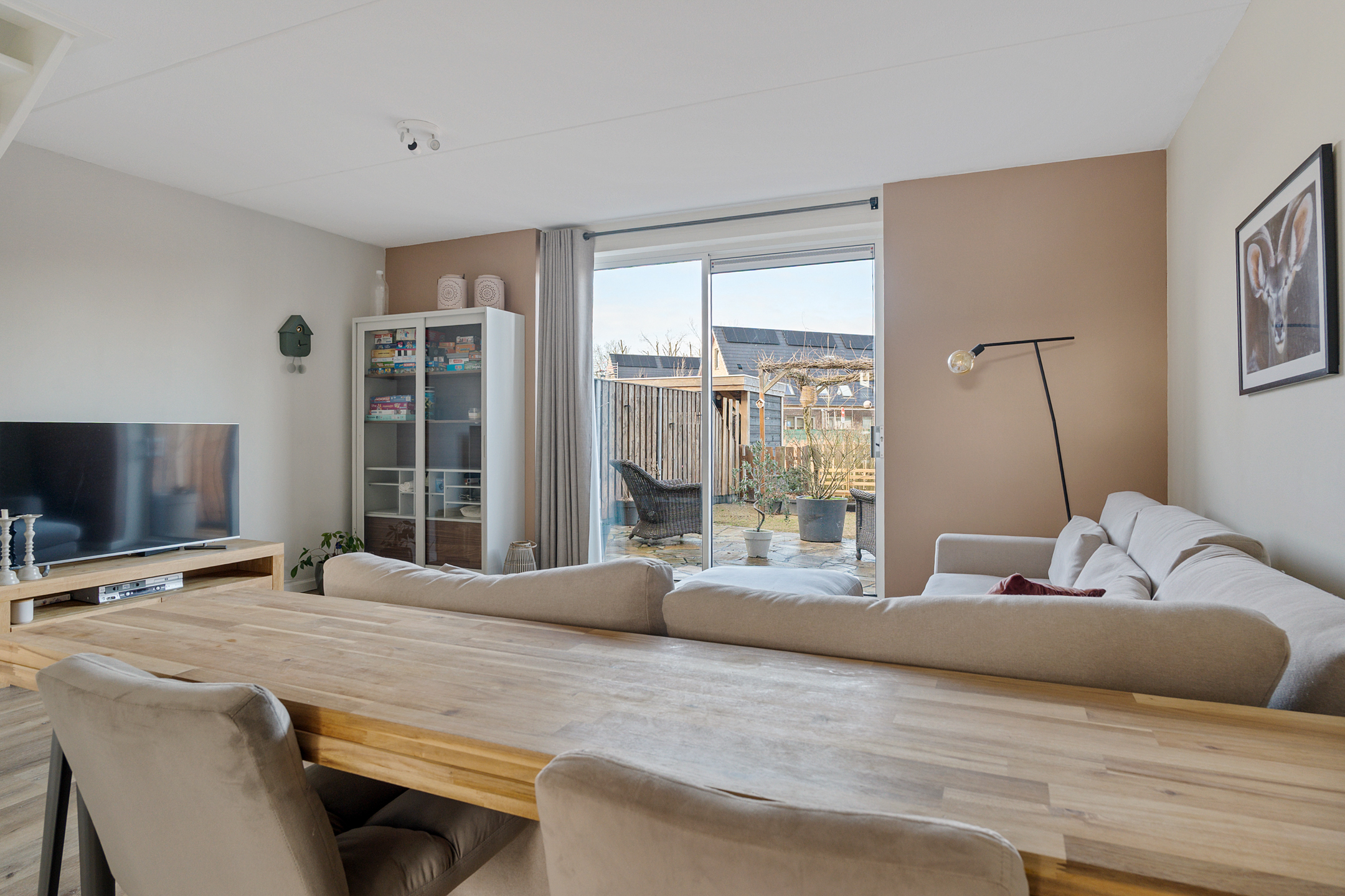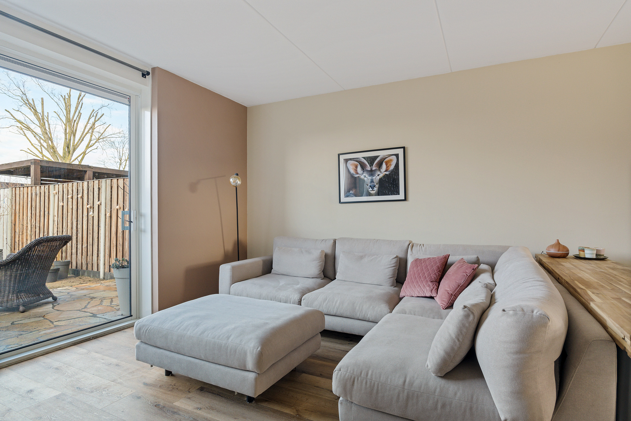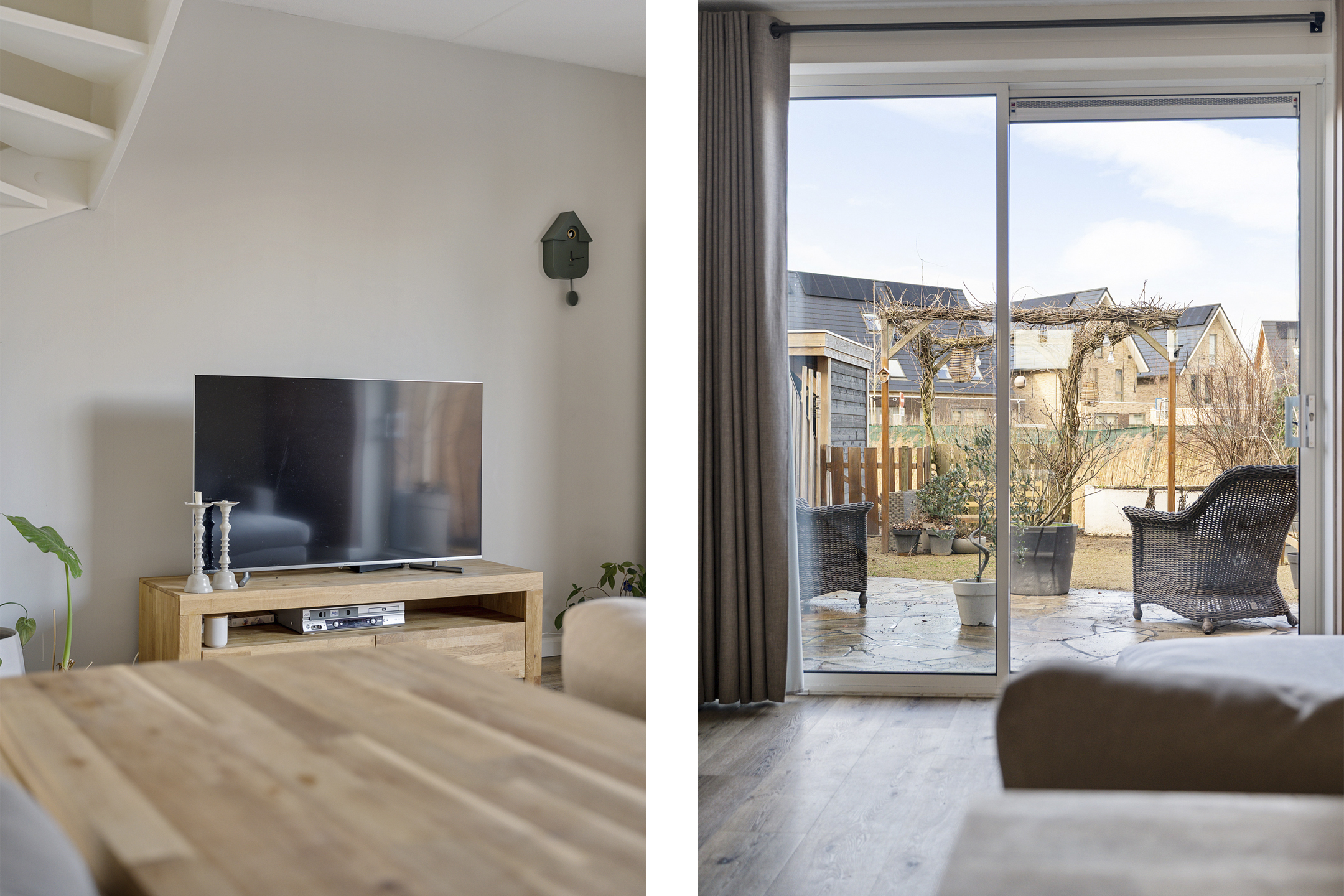 Je stapt binnen in een lichte hal met toegang tot het toilet en de meterkast (voorzien van 3-fasenstroom). Vanuit hier kom je in de ruime, tuingerichte woonkamer met een aluminium schuifpui die veel licht en een fijne verbinding met buiten biedt. De PVC vloer met vloerverwarming zorgt voor comfort en een moderne uitstraling.
