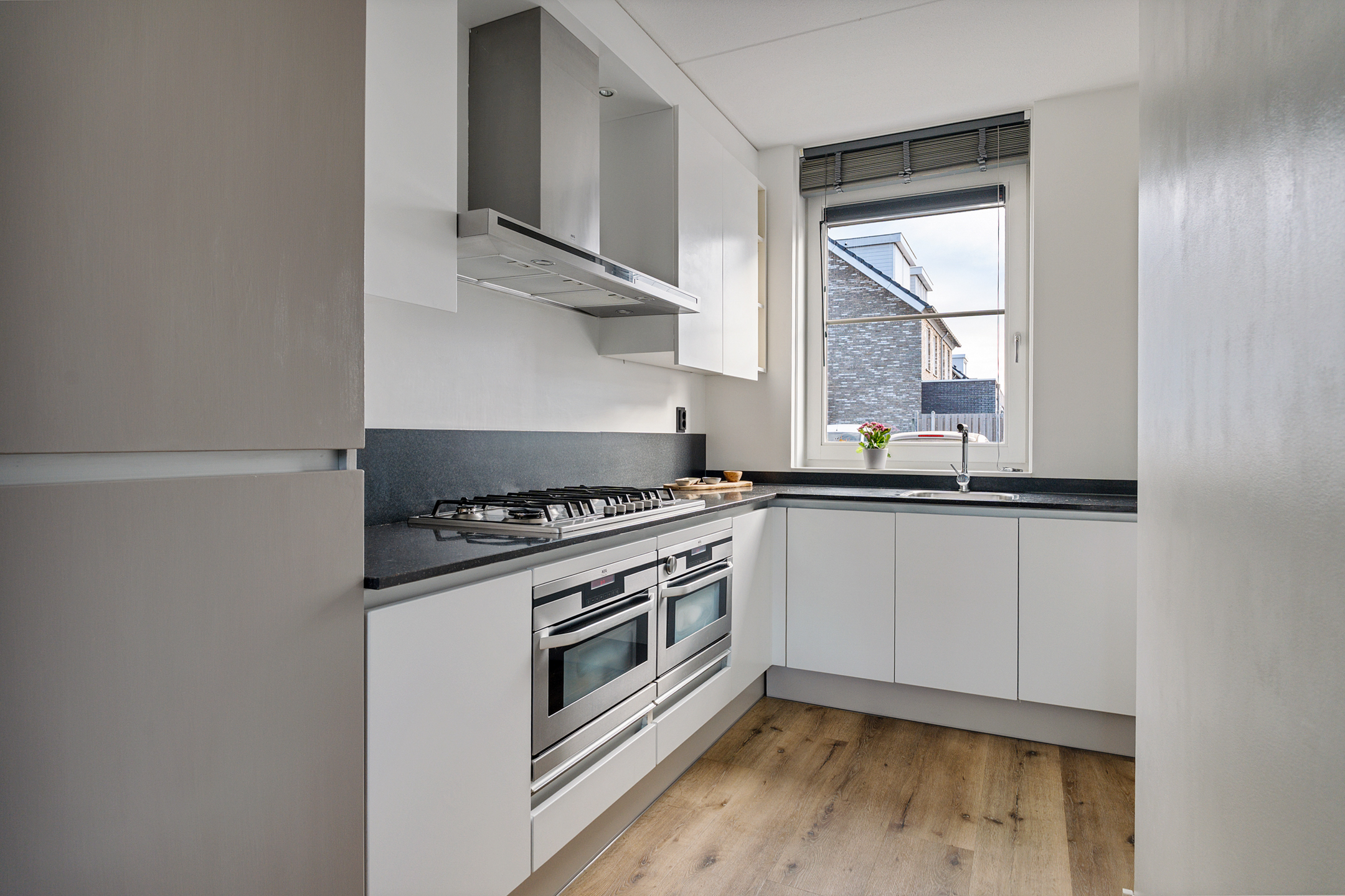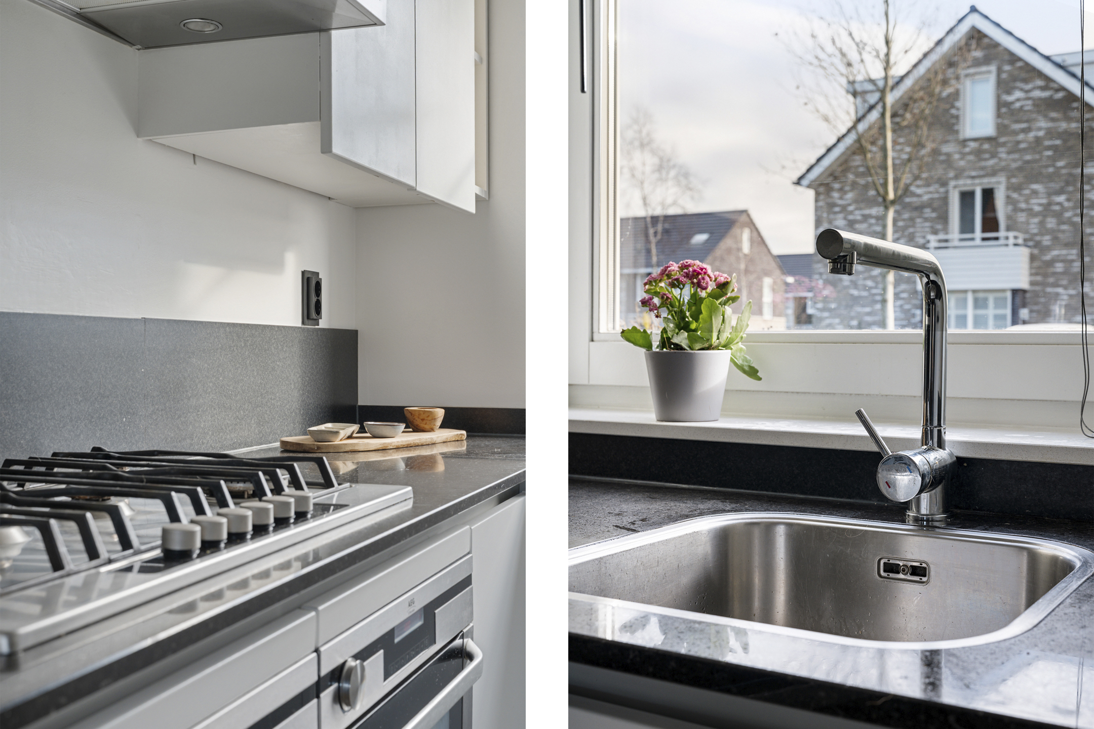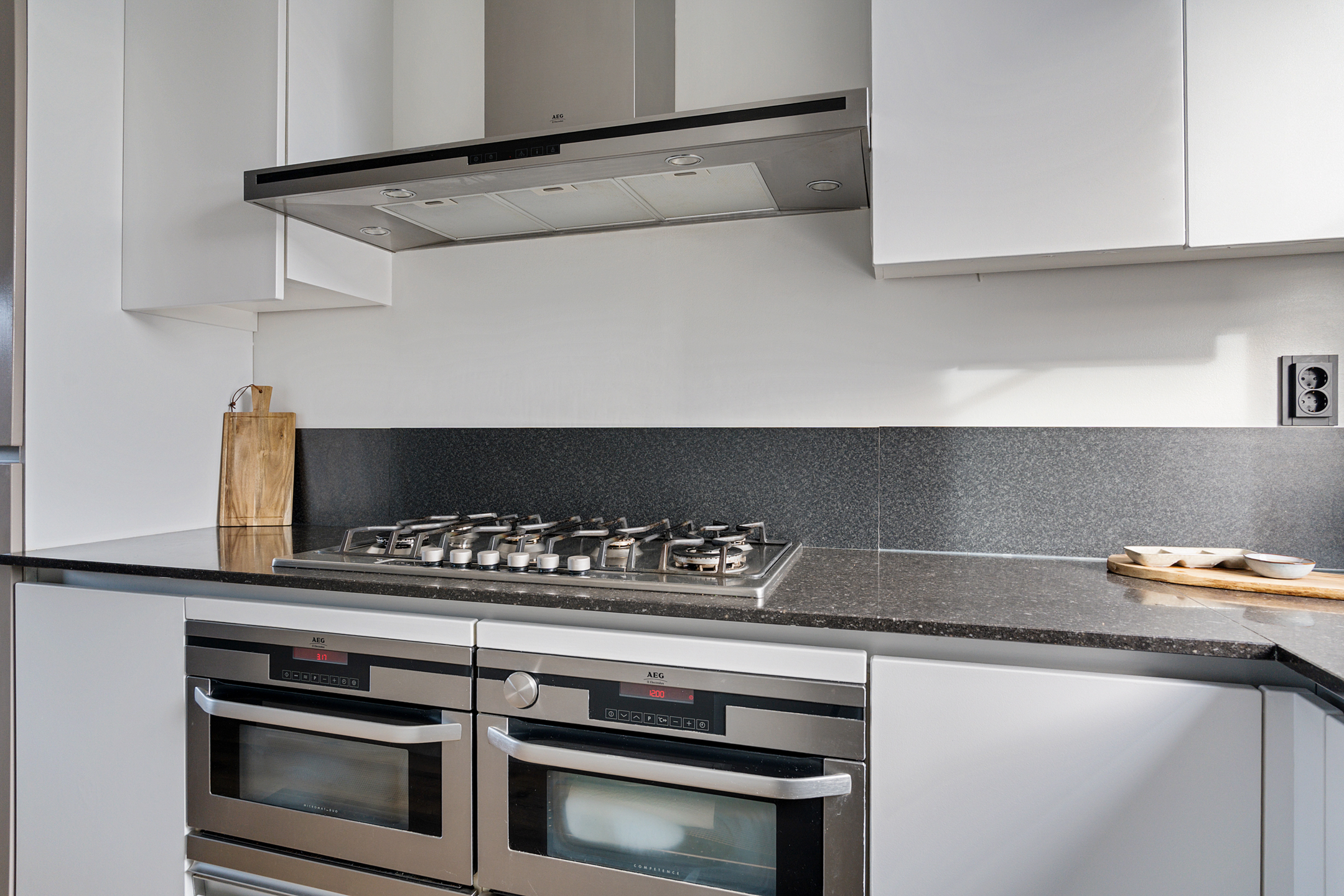 Aan de voorzijde van de woning bevindt zich de open keuken: strak en stijlvol, voorzien van AEG inbouwapparatuur, een NEFF vaatwasser, een nieuwe stoomoven, extra gaspitten en een natuurstenen werkblad. Alles is aanwezig om heerlijk te koken en gasten te ontvangen.
