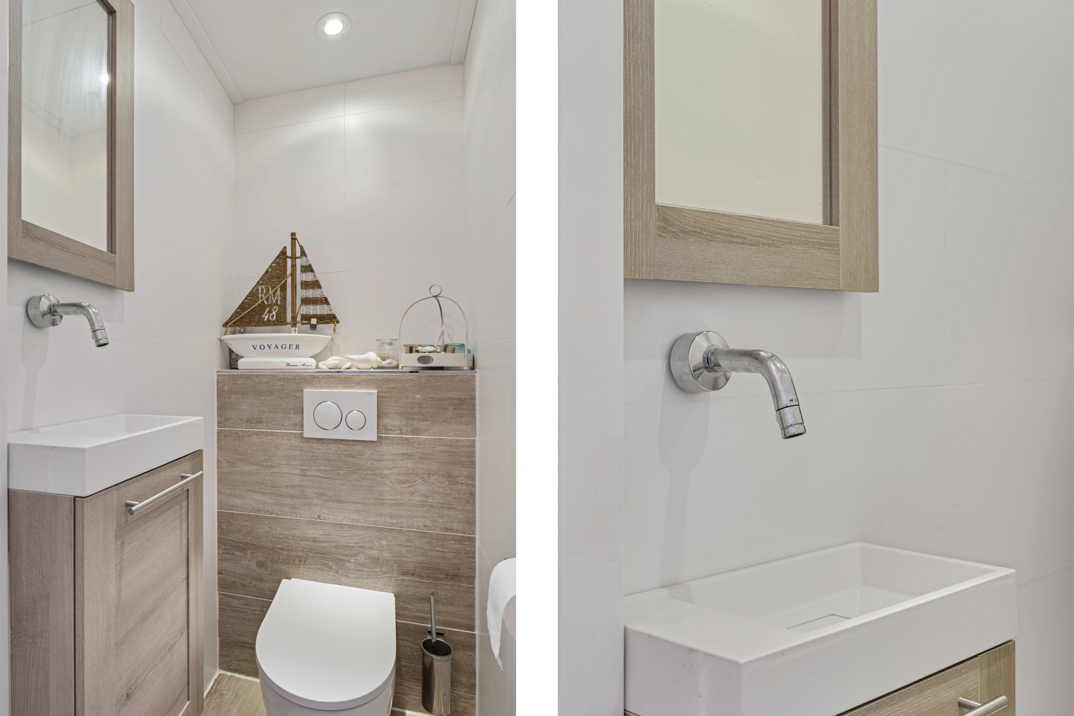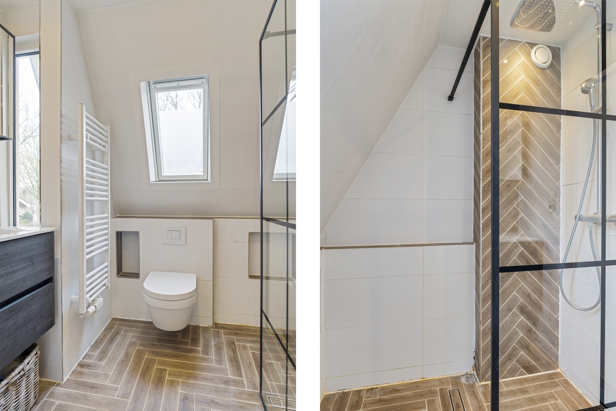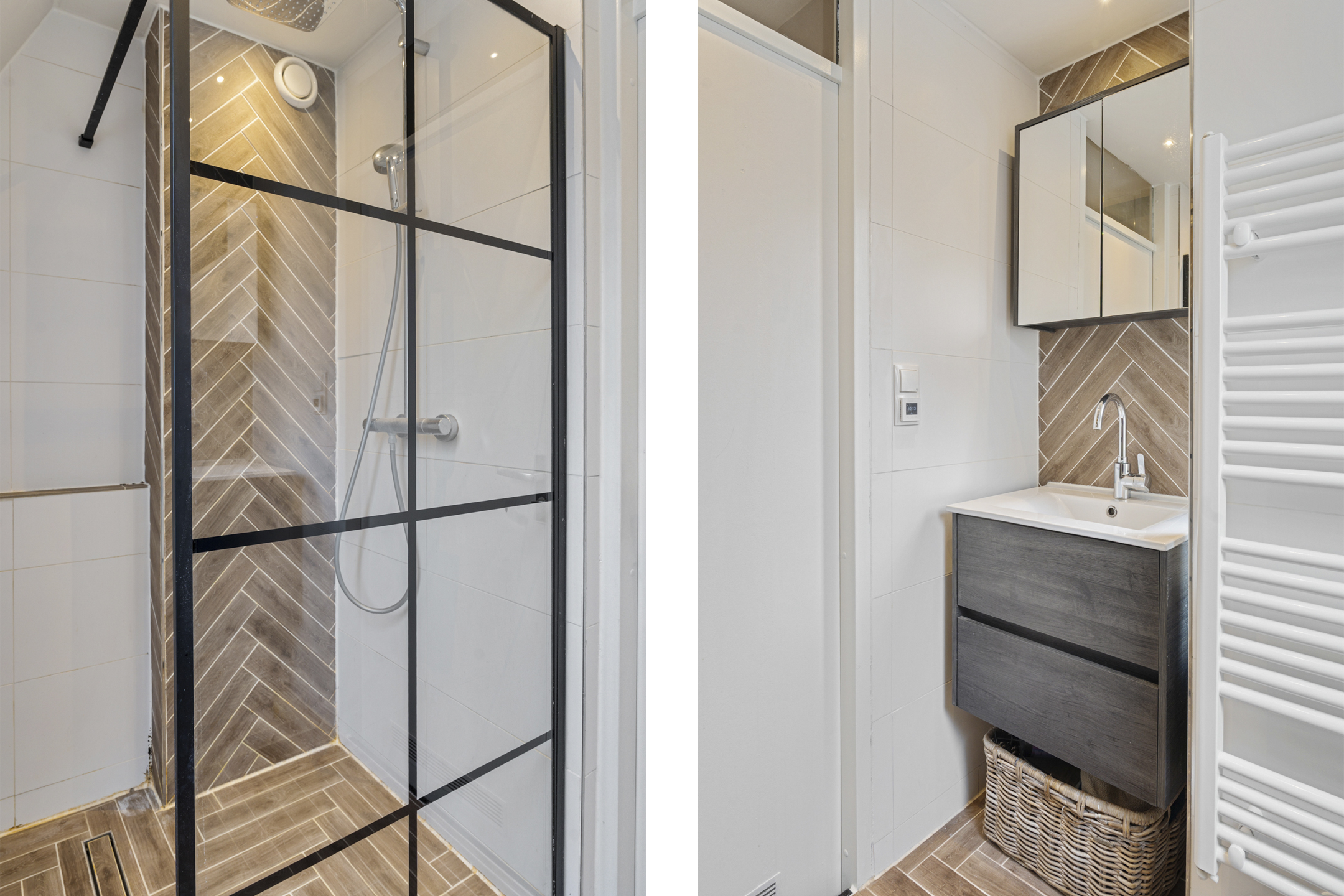 De badkamer is verzorgd en compleet uitgevoerd met een inloopdouche en regendouche, wastafelmeubel, toilet en een mooie afwerking met visgraat betegeling. Extra comfortabel is de aanwezigheid van zowel een radiator als elektrische vloerverwarming. Het plafond is verlaagd en er is een houten tuimelraam met dubbel glas aanwezig.