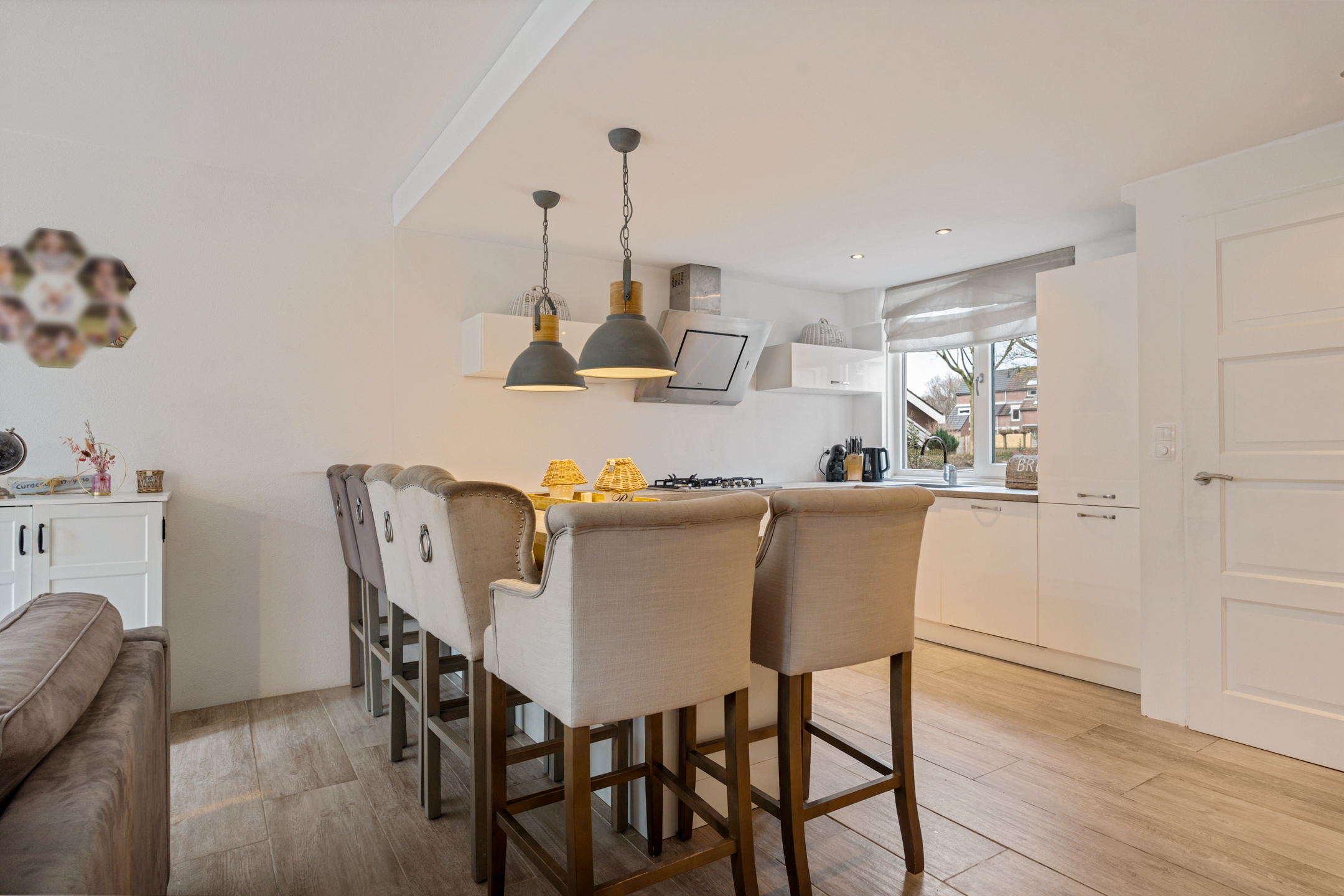De woonkamer bevindt zich aan de achterzijde, een prettige en lichte ruimte met een fijne leef indeling. De begane grond is afgewerkt met plavuizen tegels en voorzien van vloerverwarming, wat zorgt voor extra comfort en een strakke uitstraling. Dankzij de openslaande deuren is er een directe verbinding met de tuin, wat het woongenot extra vergroot.