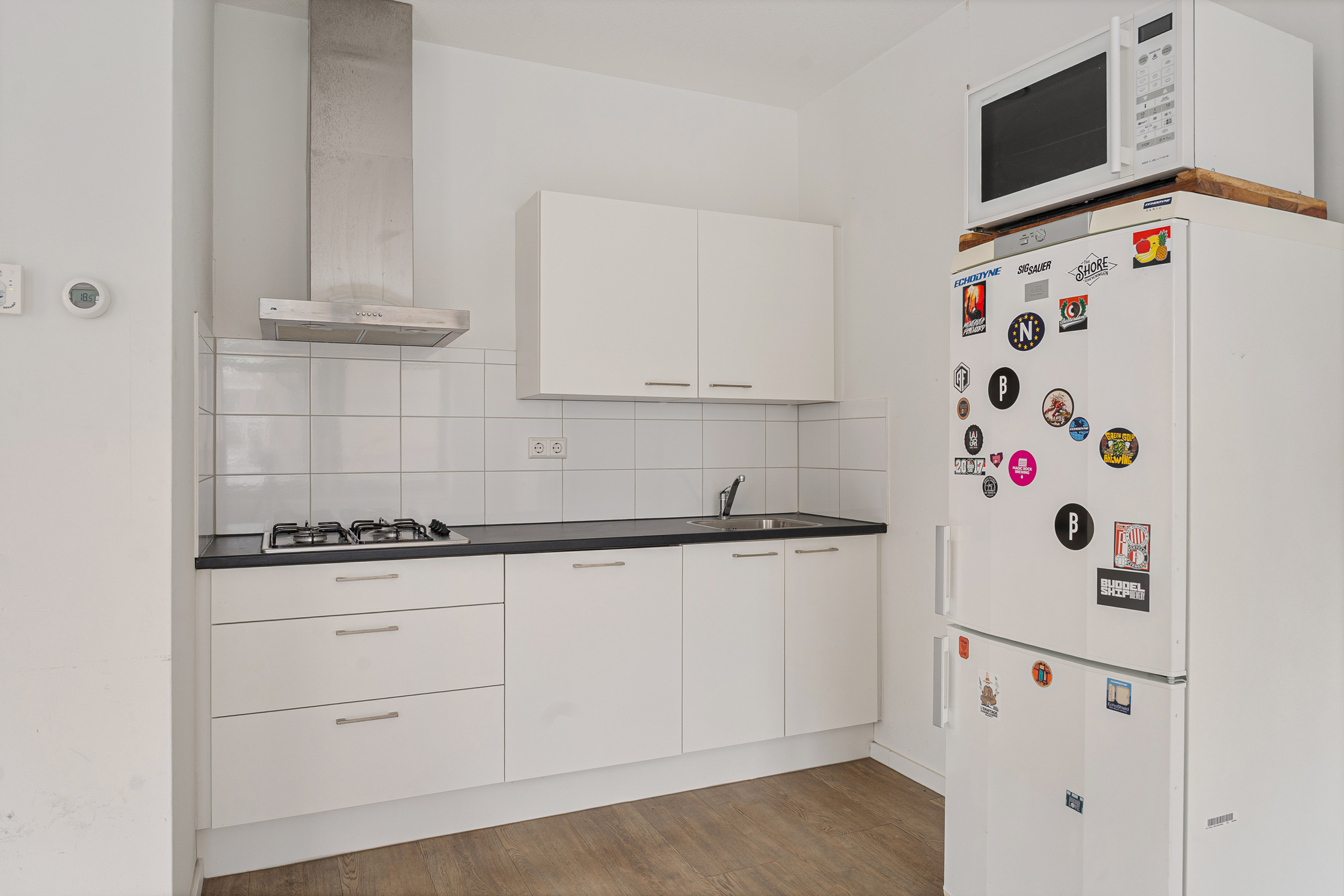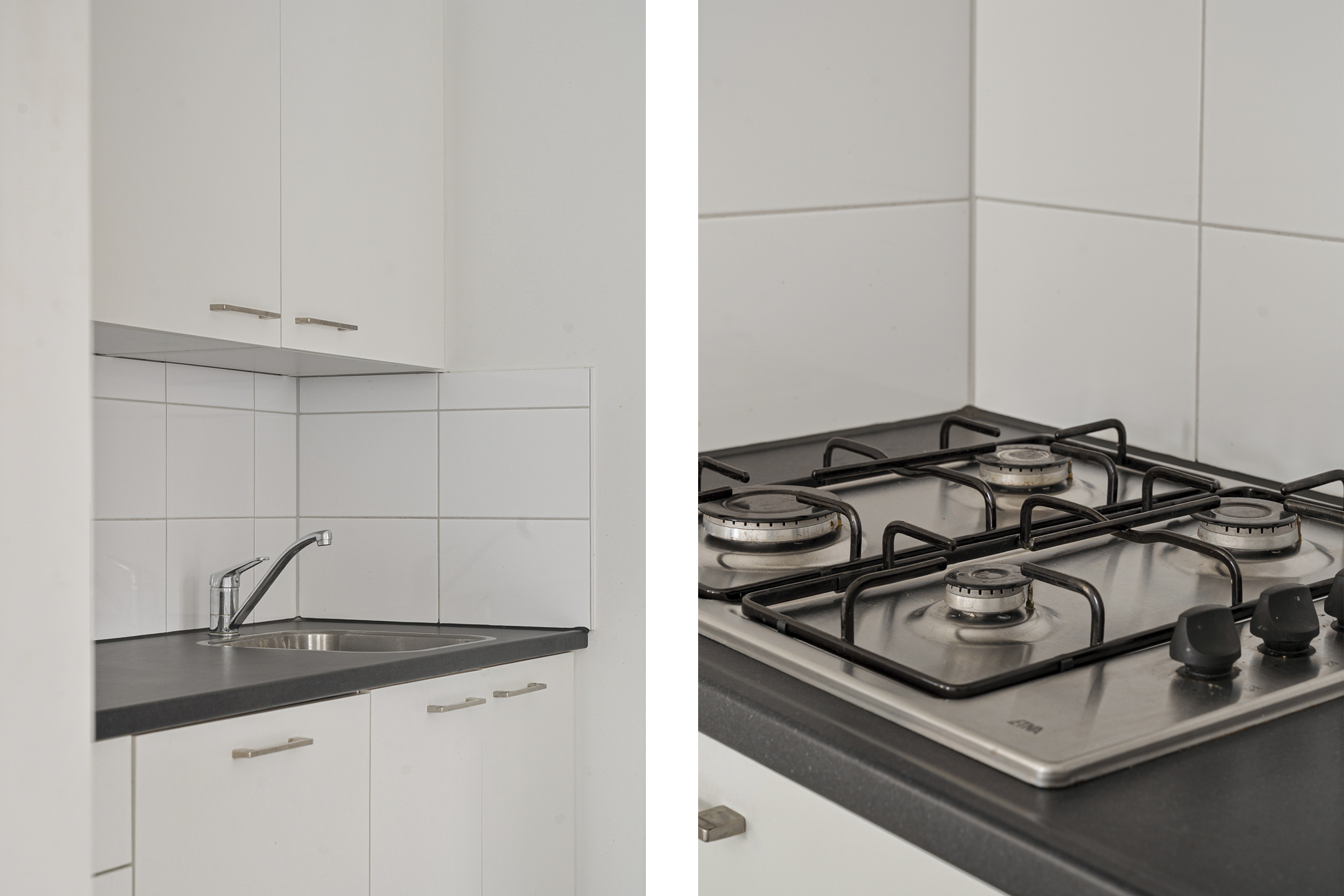 De open keuken sluit naadloos aan op de woonkamer en is uitgevoerd in een lichte kleurstelling. Je beschikt hier over een gaskookplaat, afzuigkap, spoelbak en voldoende kastruimte. De opstelling is compact maar praktisch, waardoor je alles binnen handbereik hebt.