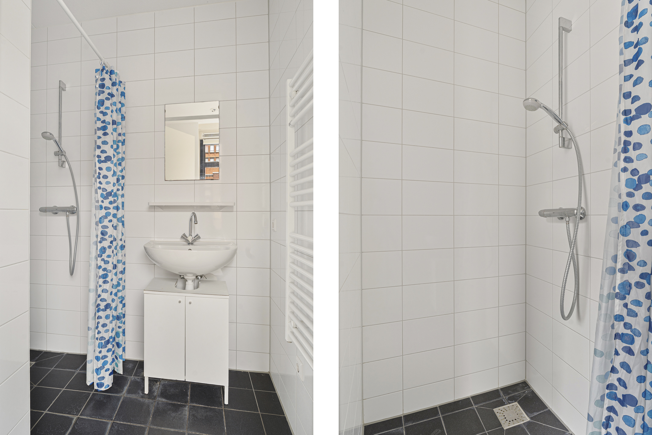 De badkamer is netjes en functioneel ingericht met een douche en wastafelmeubel. De separate toiletruimte is modern afgewerkt en bereikbaar vanuit de hal, wat extra comfort biedt.