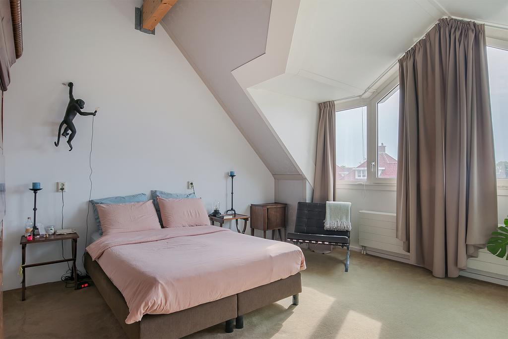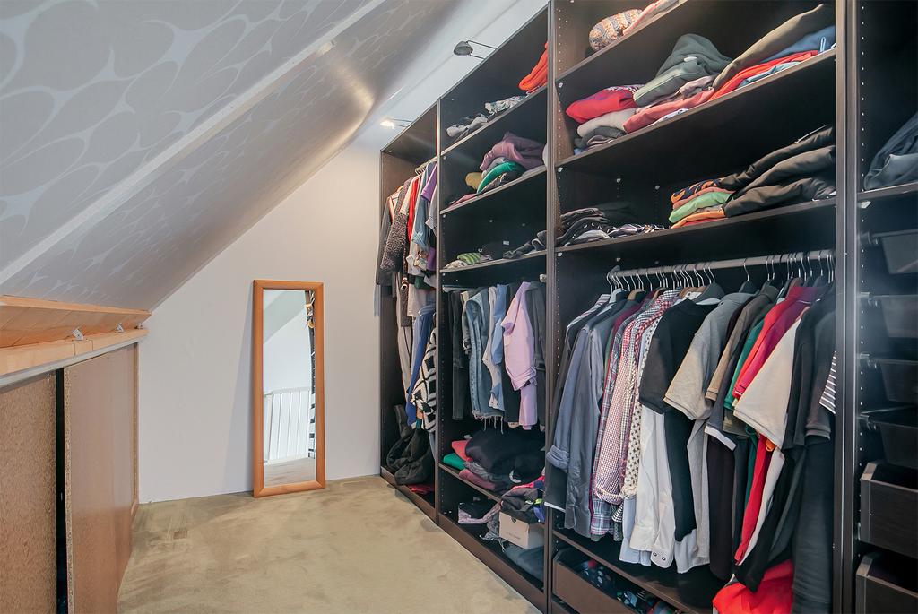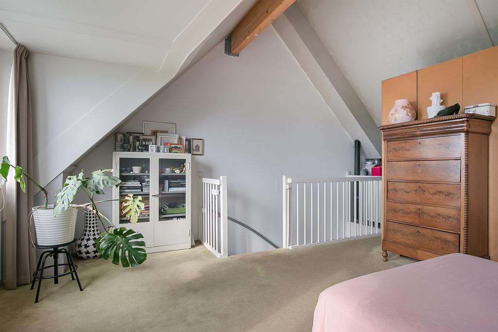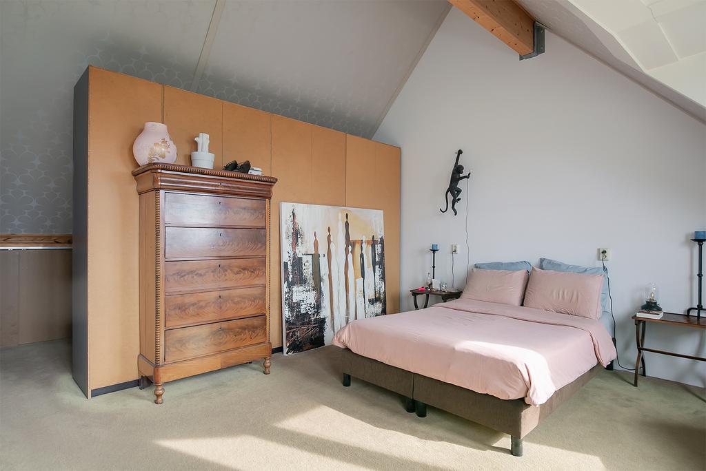 Deze open ruimte dient als zeer ruime slaapkamer met inloopkast.