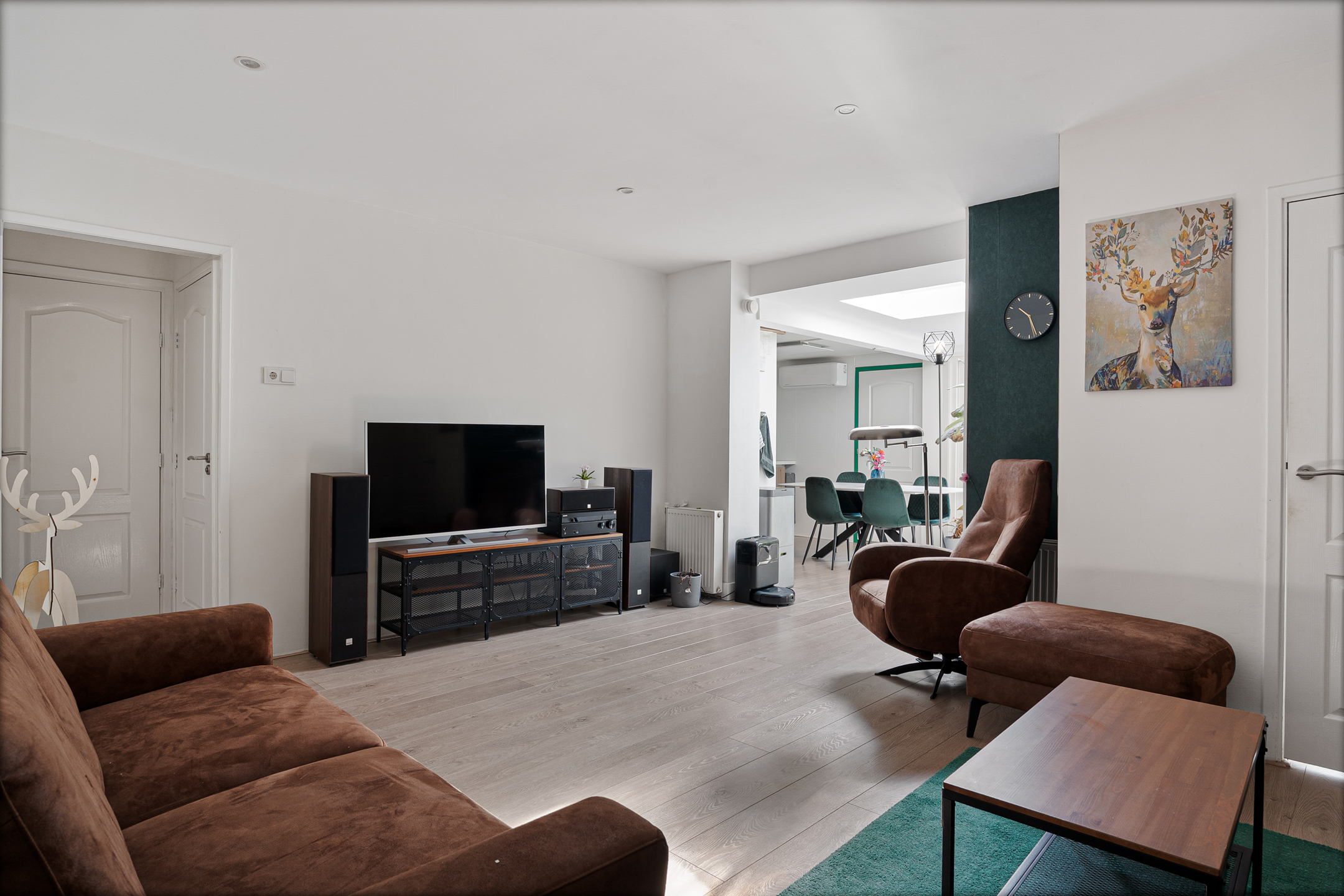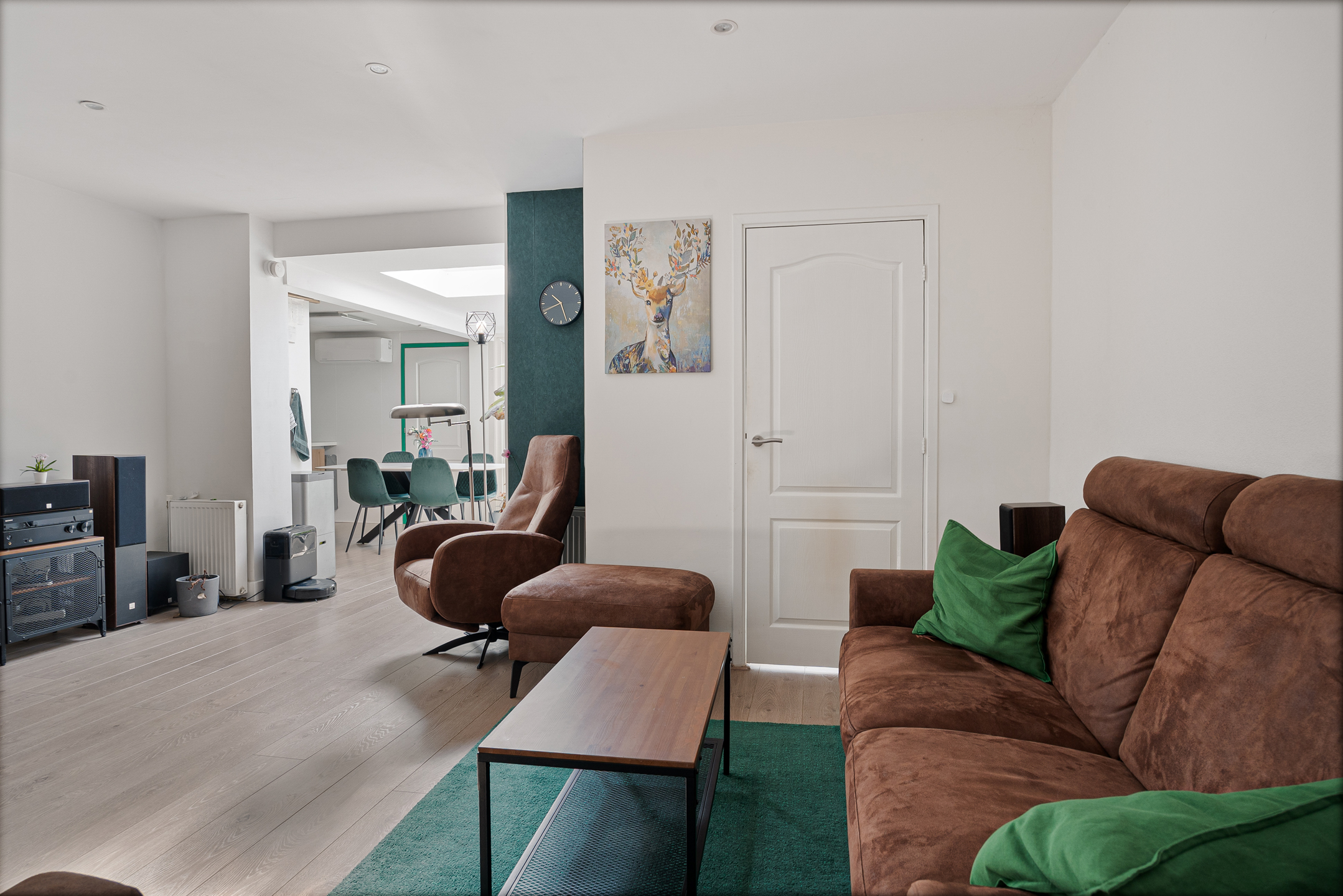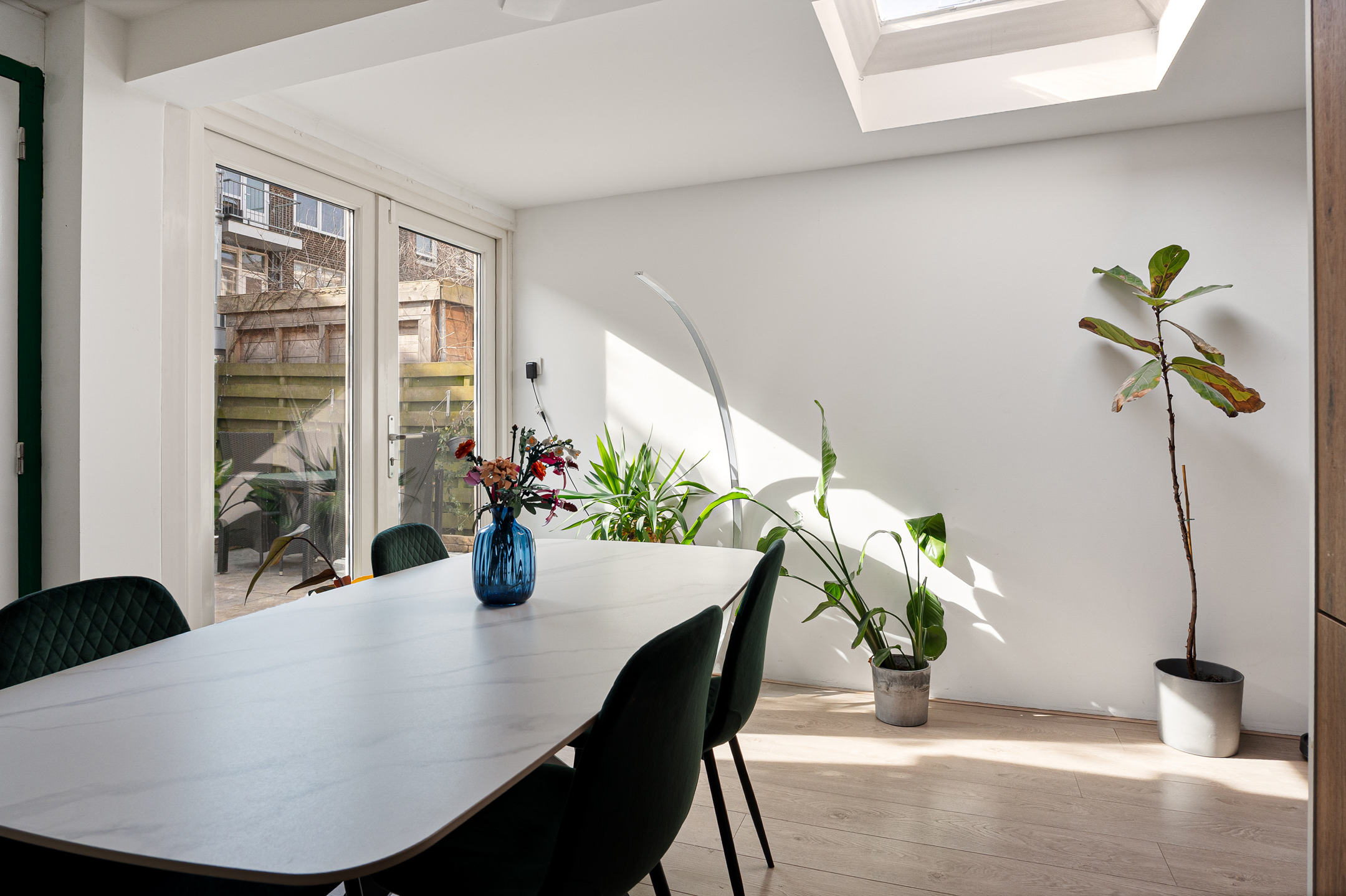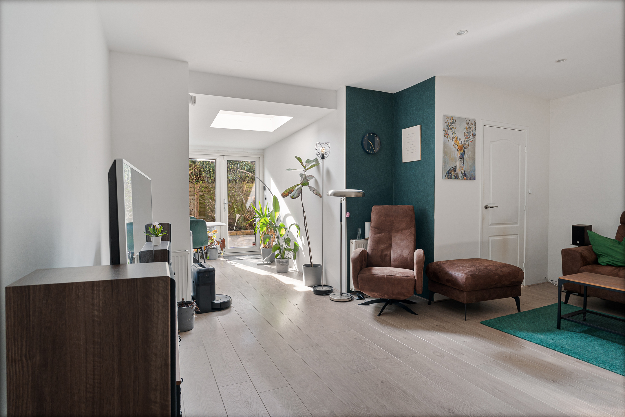 Je komt binnen in de hal met een separaat toilet, garderobe en praktische bergruimte met wasmachine- en drogeraansluiting. Vanuit hier loop je door naar de ruime en lichte woonkamer met open keuken in de uitbouw. De moderne keuken is voorzien van diverse inbouwapparatuur en een daklicht, wat zorgt voor een prettige, natuurlijke lichtinval. Via de keuken stap je zo de zonnige achtertuin in, gelegen op het zuidoosten.