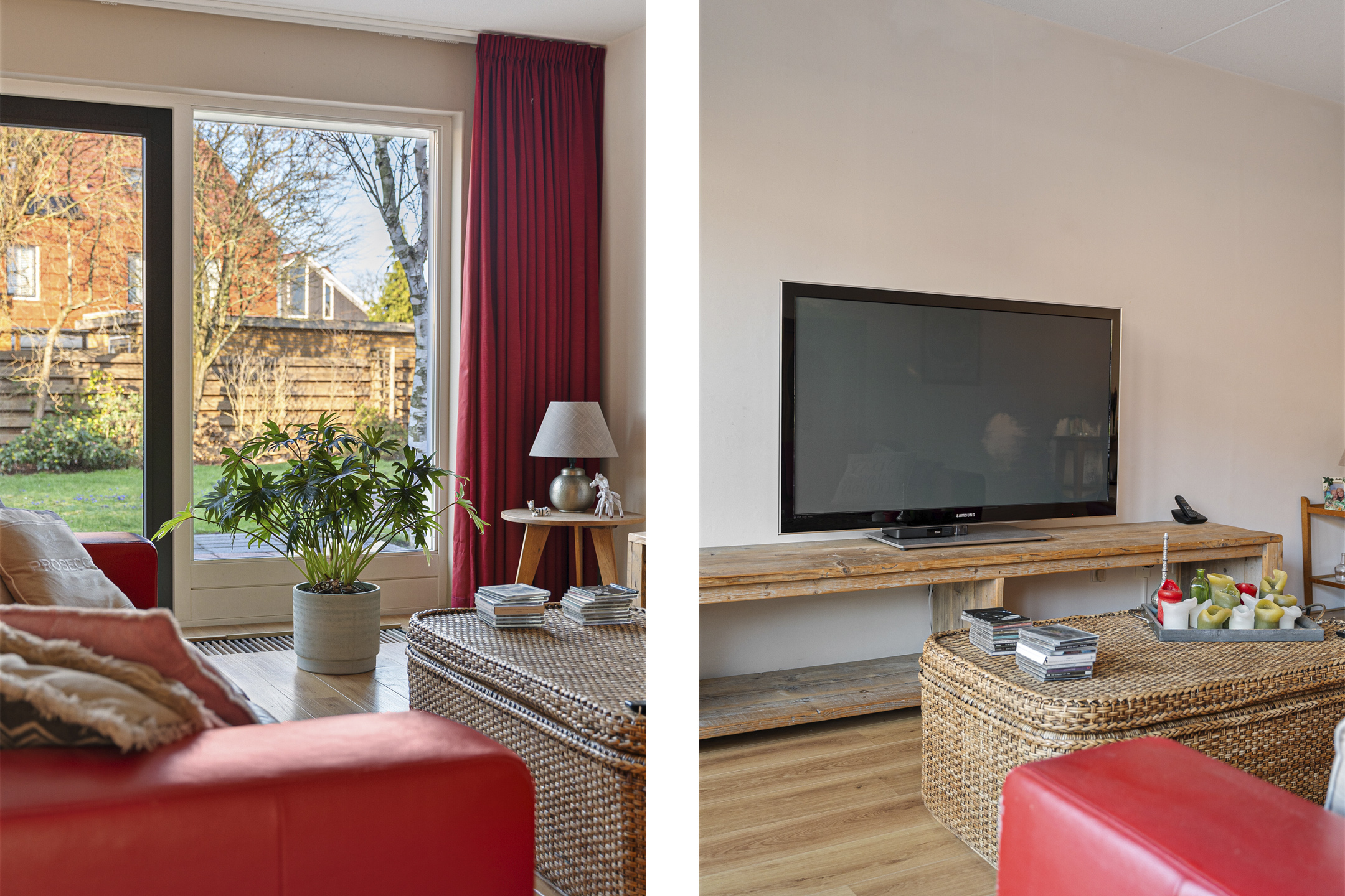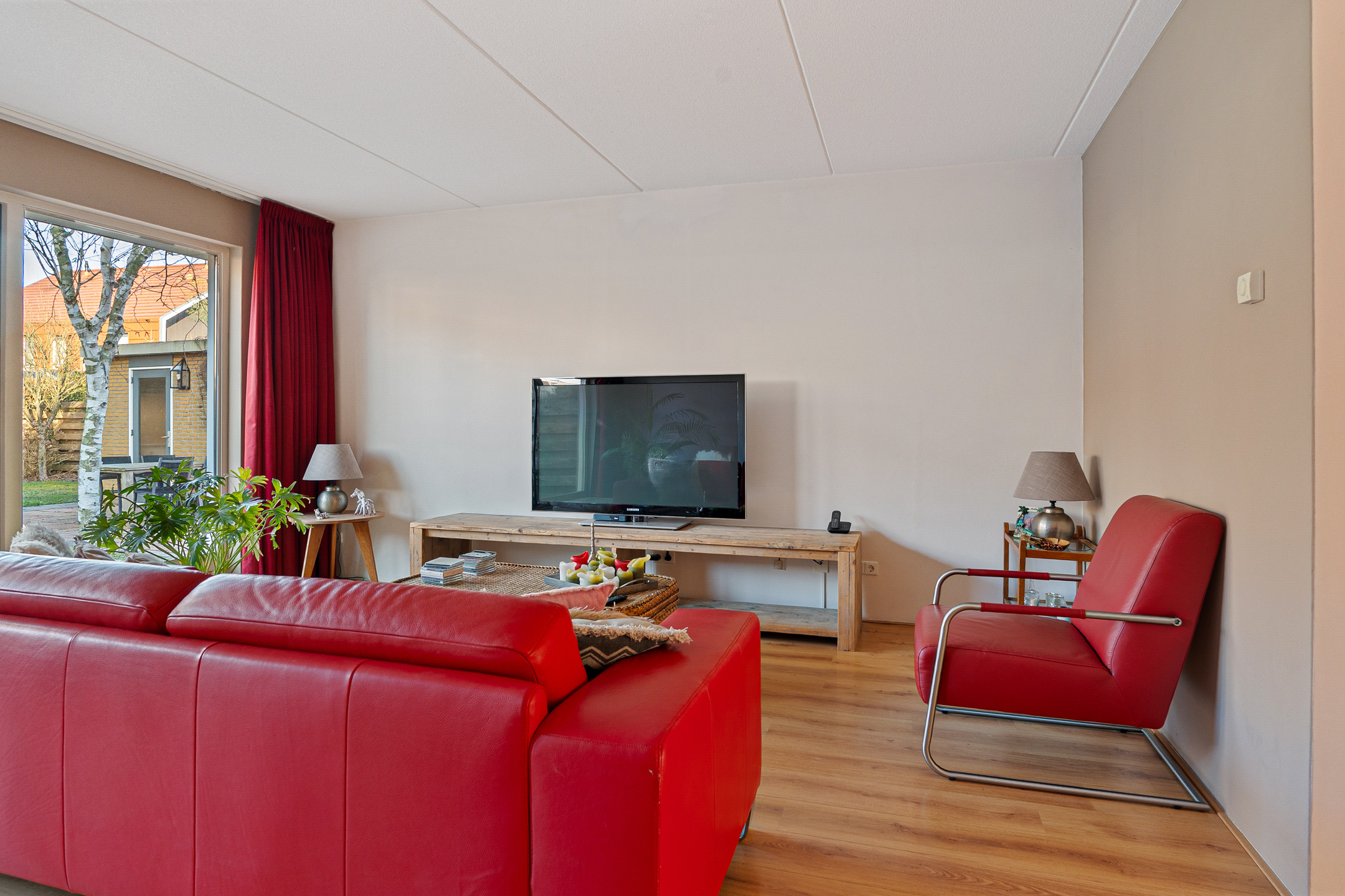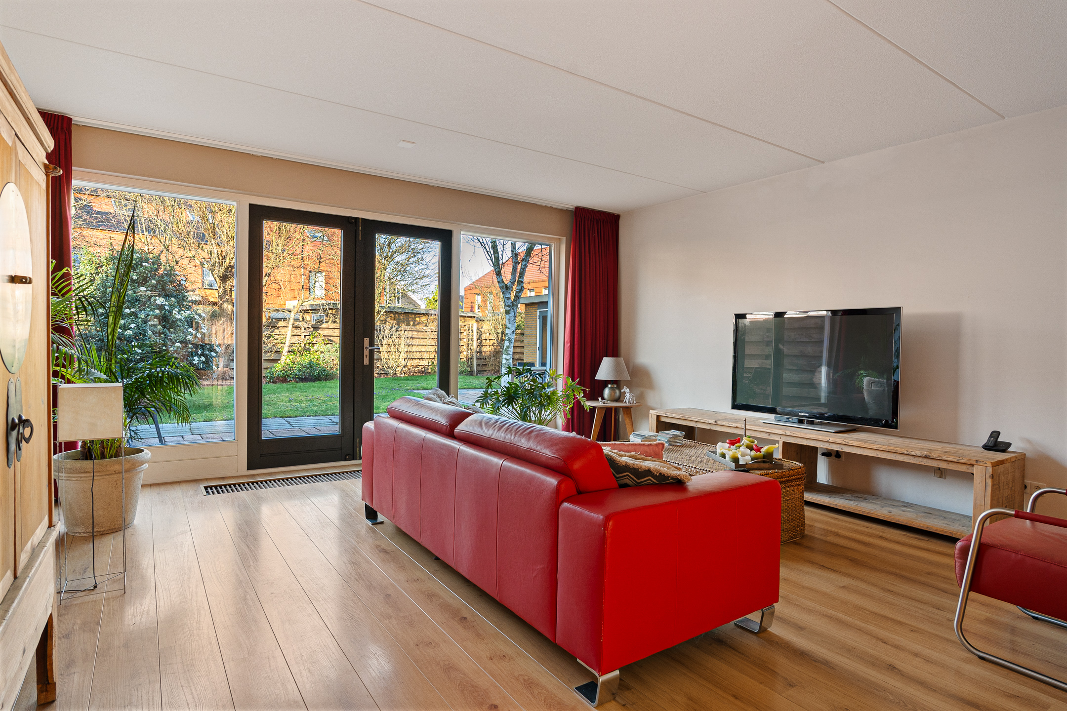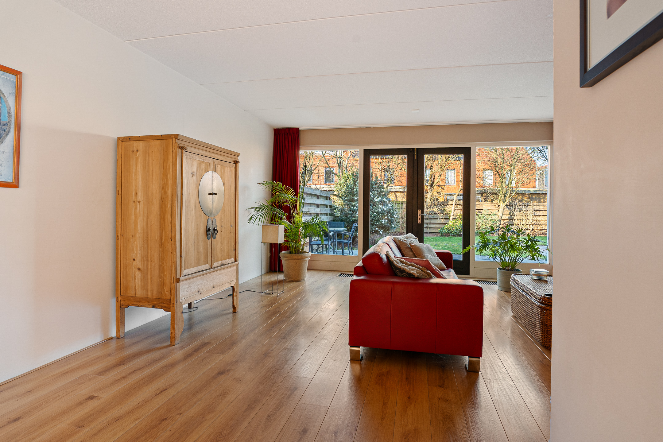 Aan de achterzijde bevindt zich de ruime en lichte woonkamer. Dankzij de grote raampartijen en de openslaande deuren naar de tuin geniet je hier van veel daglicht en een prettig uitzicht op het groen.