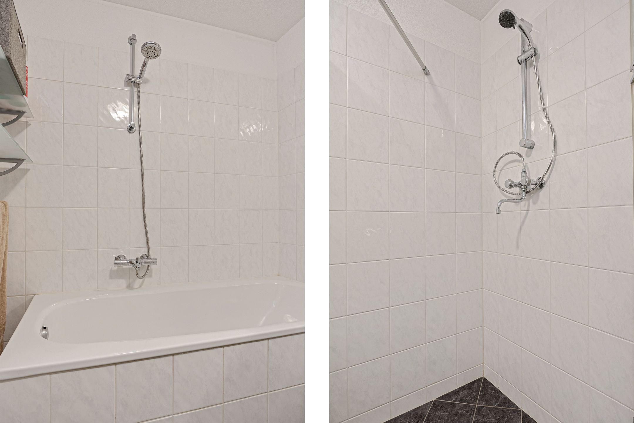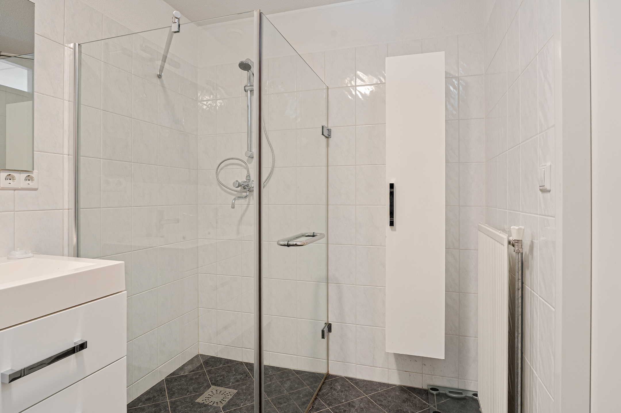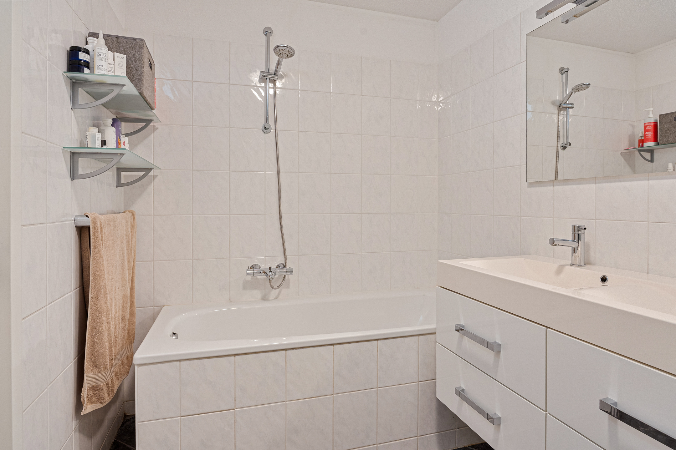 De ruime, volledig betegelde badkamer ligt centraal op de verdieping en is voorzien van een ligbad, een douchecabine, een dubbele wastafel met meubel en een handdoekradiator.